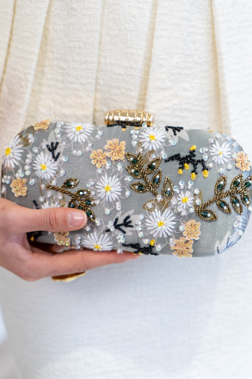 Bolso ovalado, con pomo dorado, cadena larga para colgar. Con estampados y pedrería en varios colores.