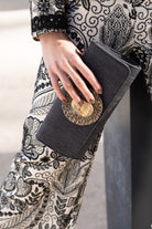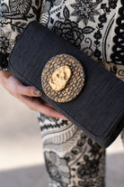 Bolso alargado, en tejido rugoso, detalle piedra en el centro, cierre con imán, cadena dorada para colgar. En color negro.