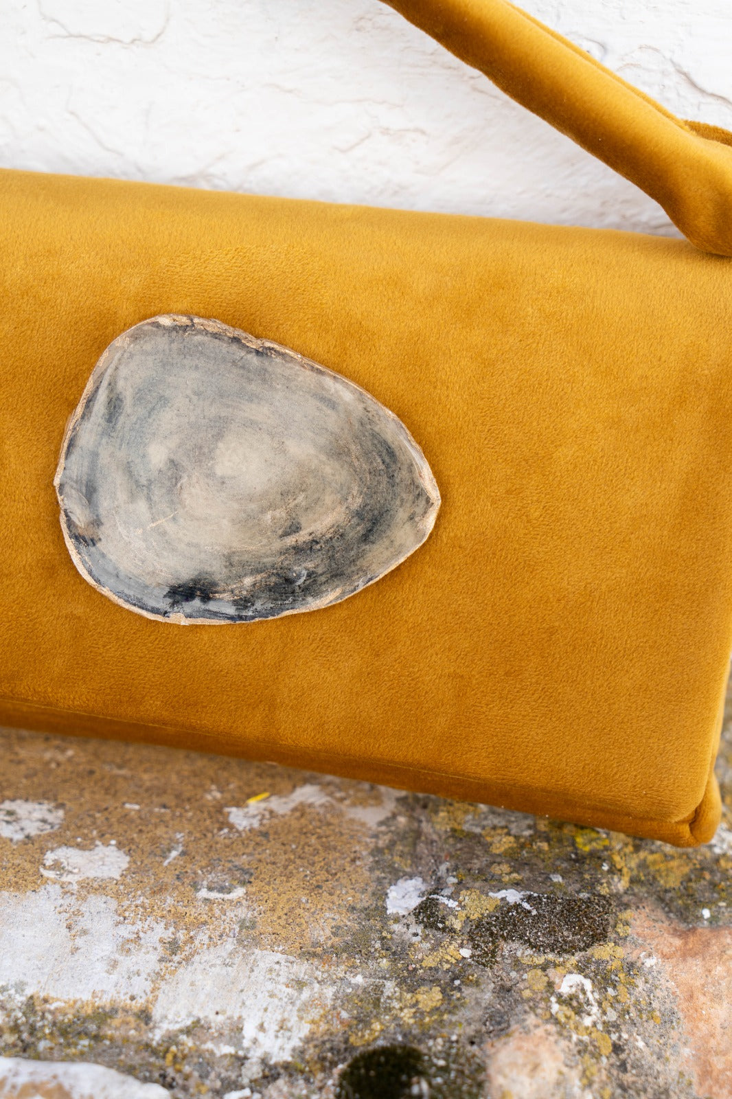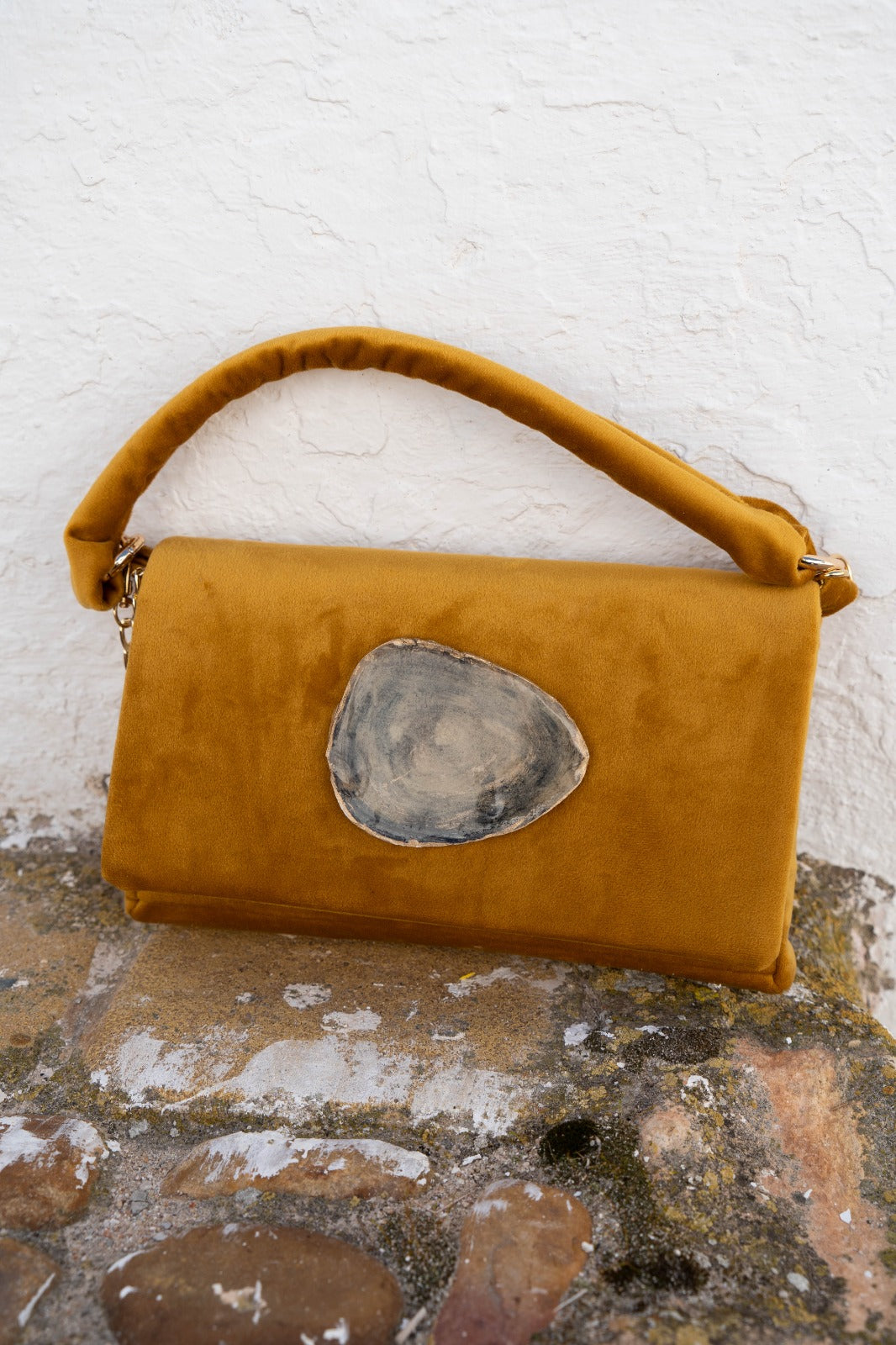 Bolso alargado, en tejido suave, detalle beige en el centro, cierre con iman, asa corta. En color mostaza.