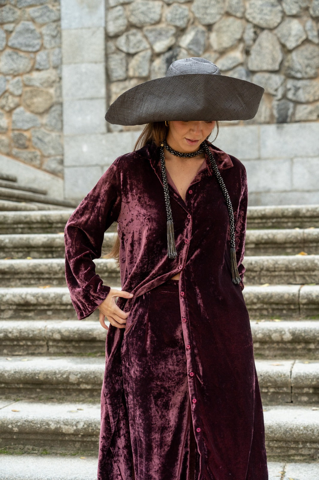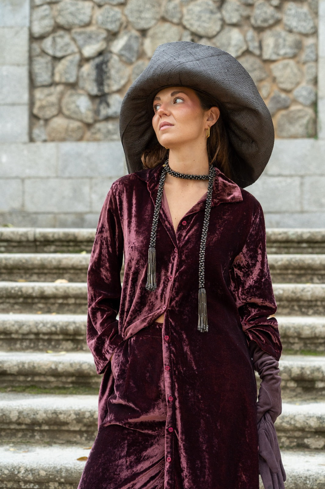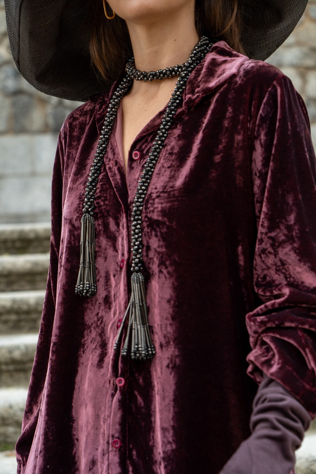 Collar compuesto por bolita de cristales en tonos grisaceos, terminado con una borla flexible.