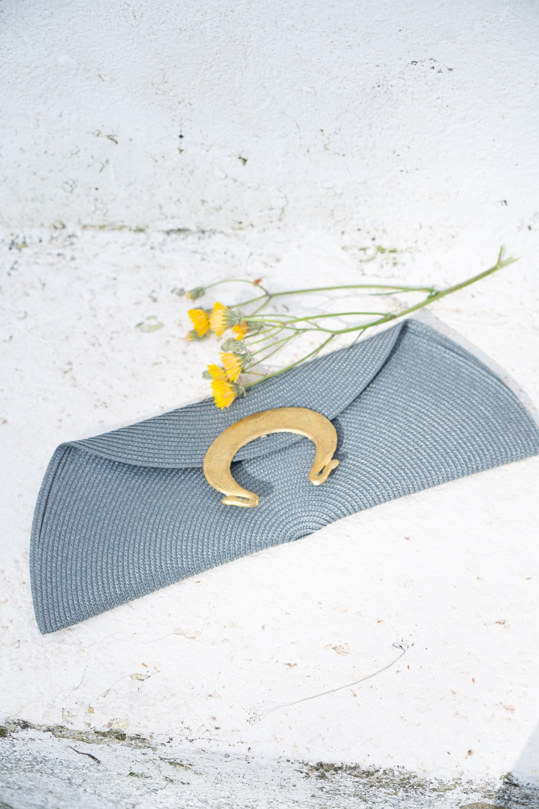 Cartera en rafia sintetica, cierro con hebilla en bronce. Cadena interiror en color gris.