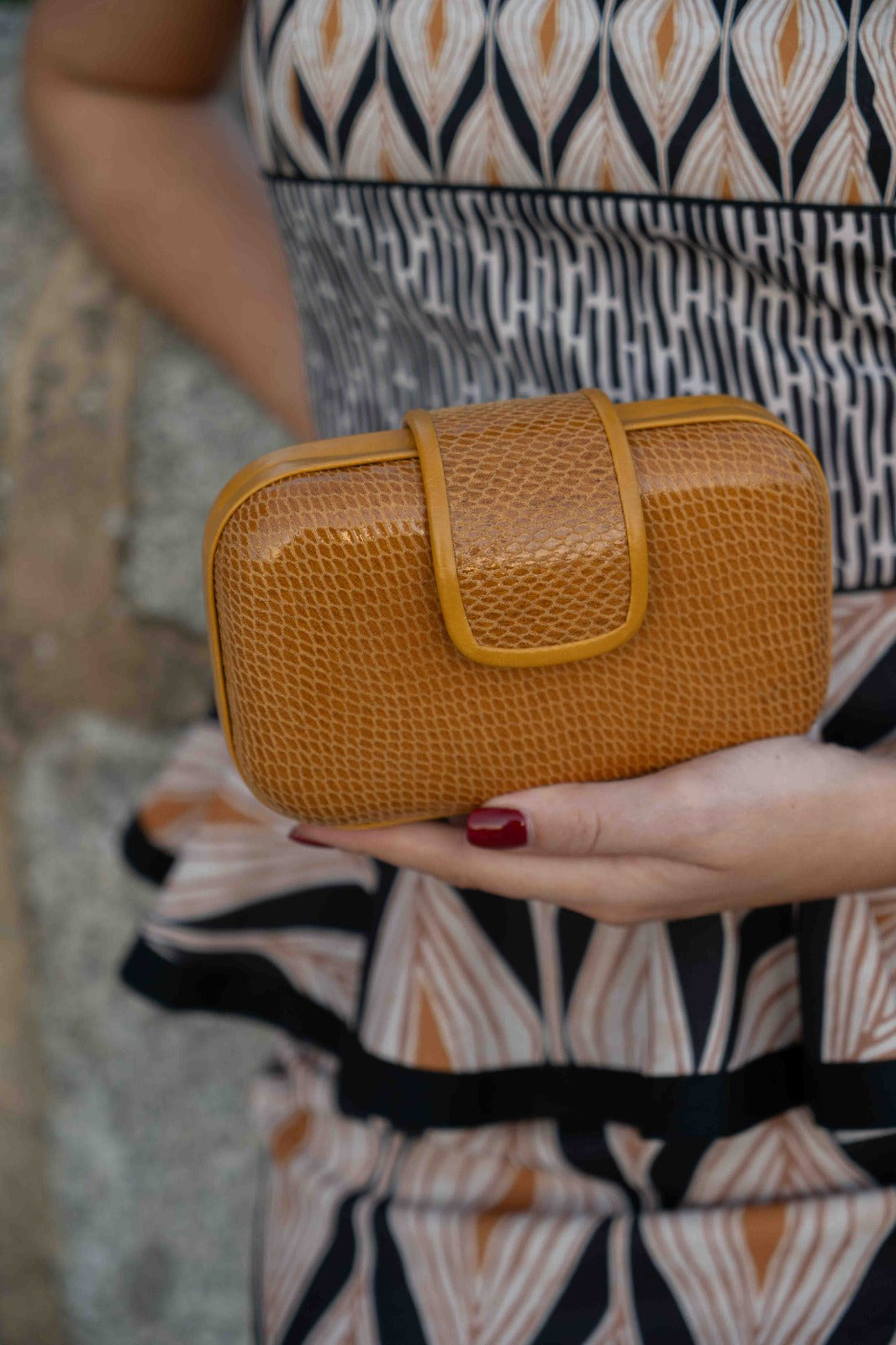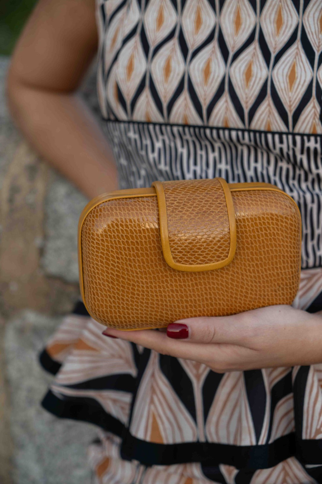 Cartera ovalada, cierre con iman, cadena dorada para colgar. En color mostaza.