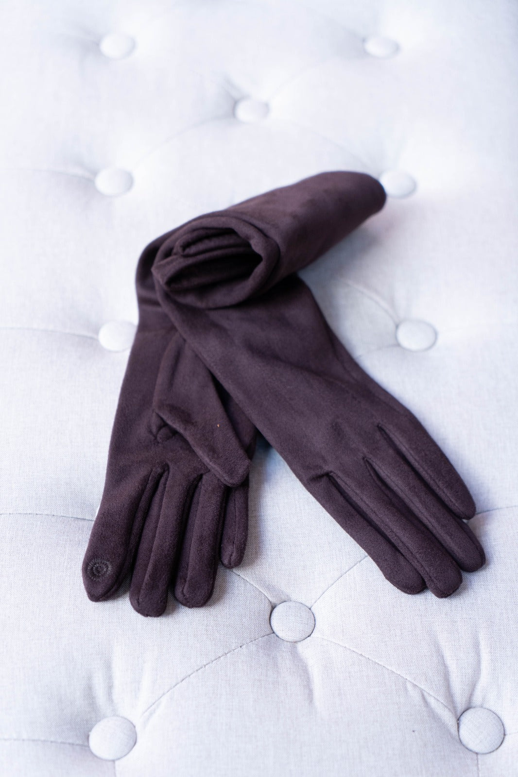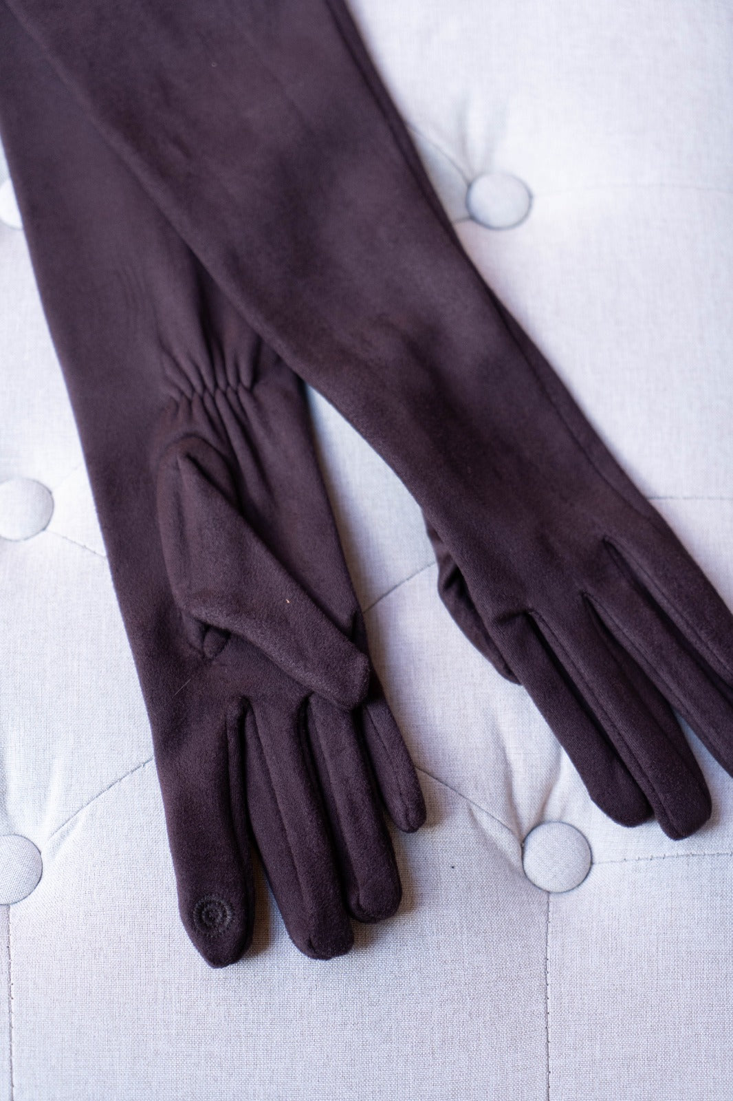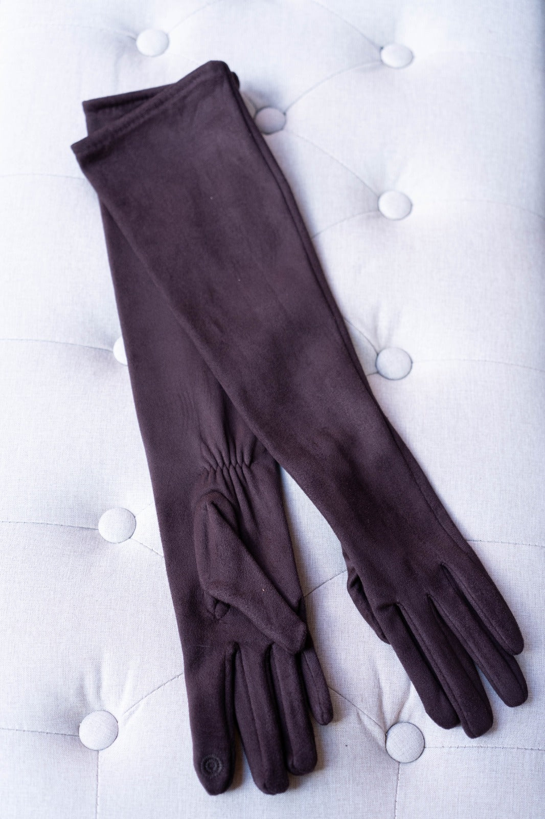 Guantes largos de antelina, elásticos se adaptan perfectamente y quedan ajustados. Color marrón.