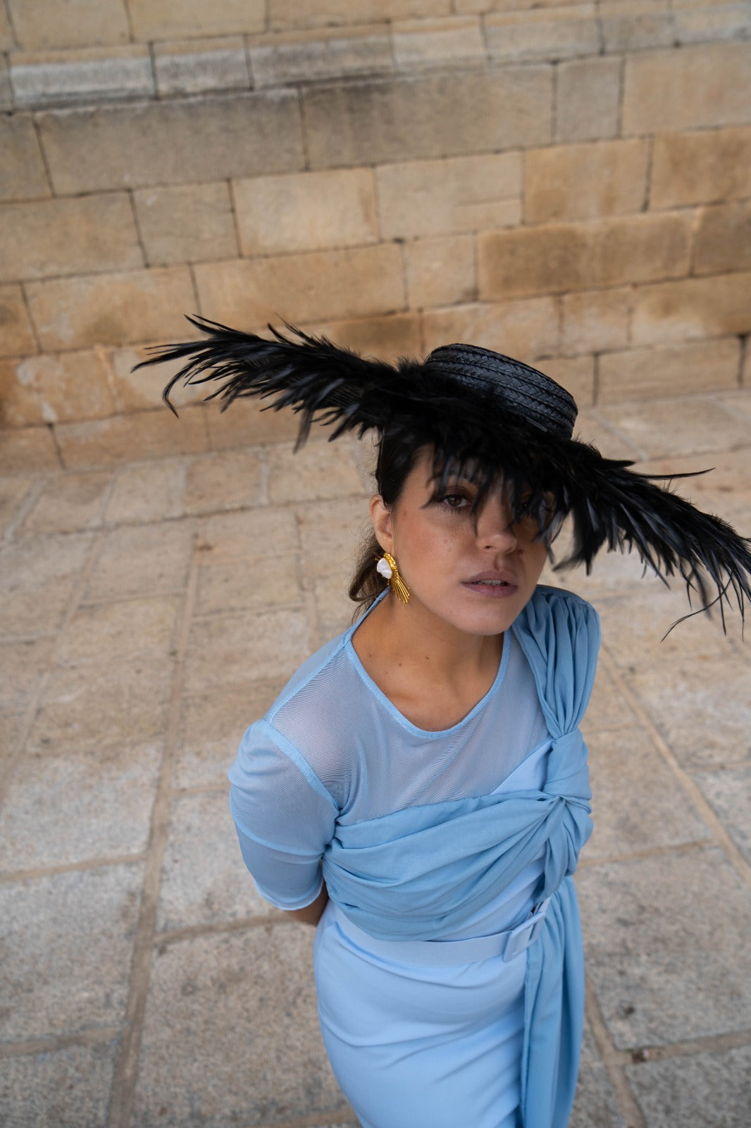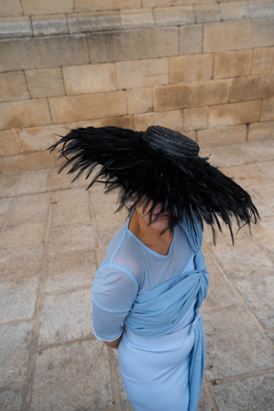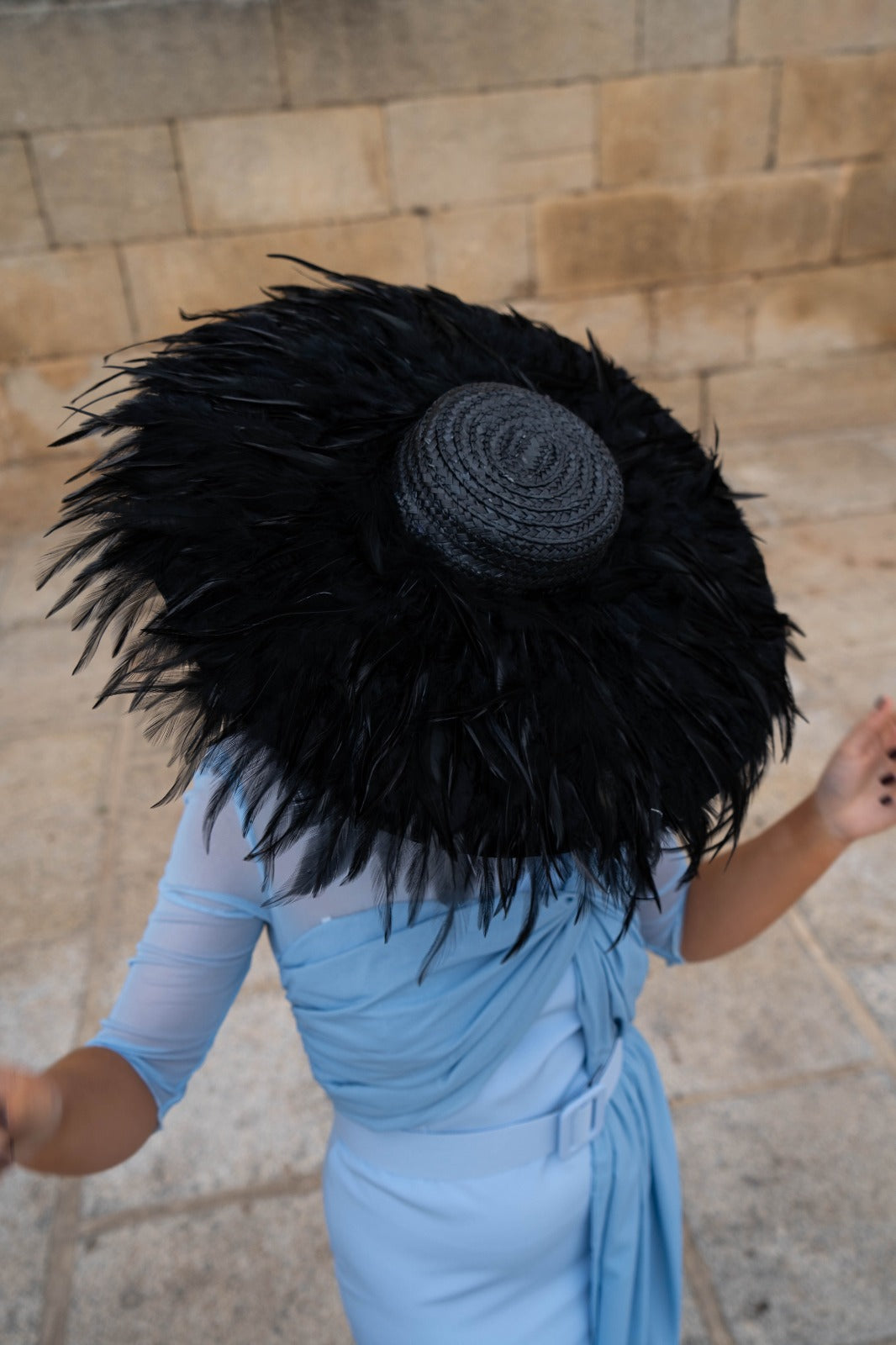 Pamela base redonda, lleva todo el ala forrada con plumas de gallo, con diadema para sujetar, en color negro.