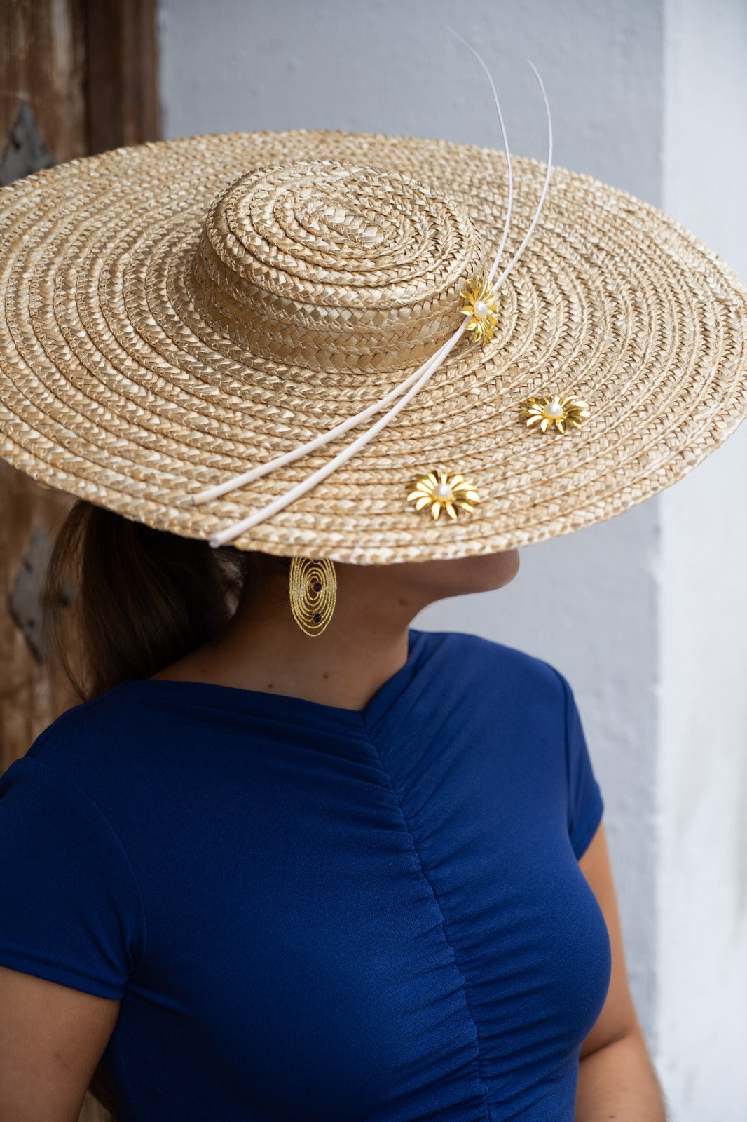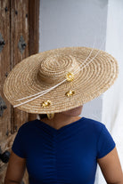 Pamela de paja con raquis de plumas y detalles metálicos, en color dorado teñido de forma artesanal.