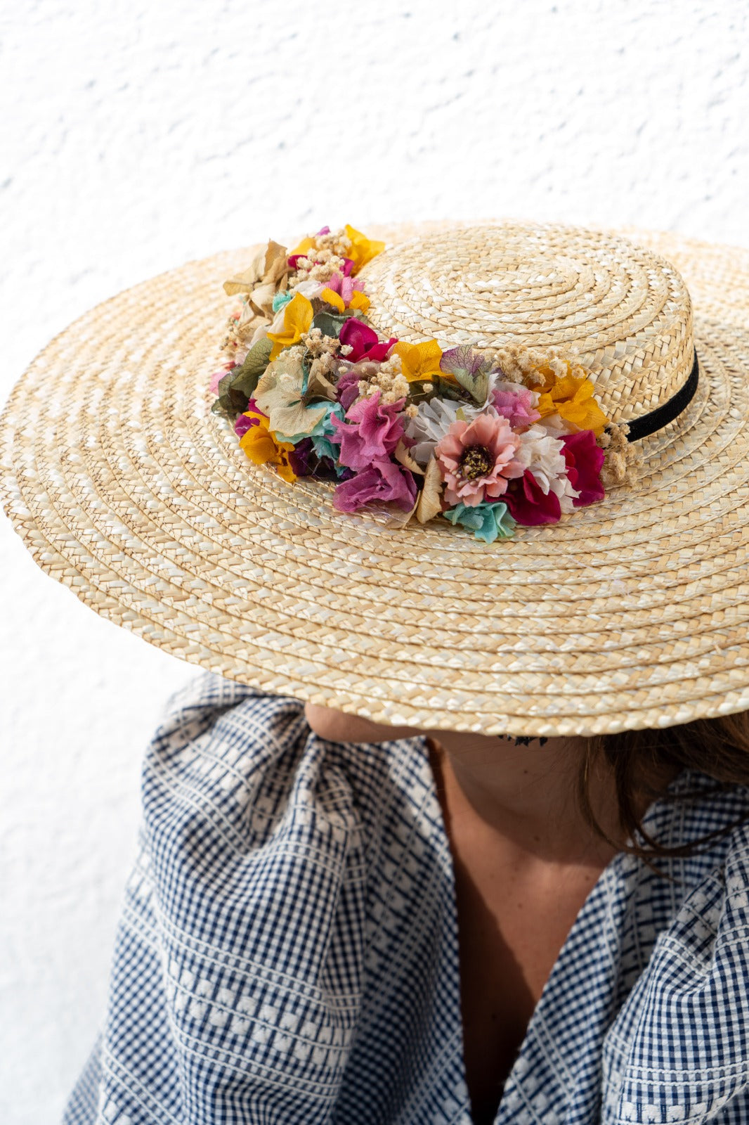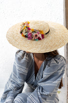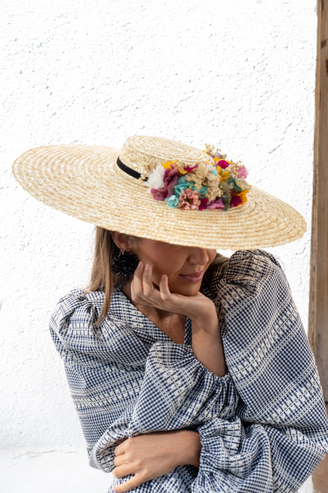 Pamela de paja natural de 55 cm aprox. Elaborada a mano con hortensias preservadas en distintos tonos. El color y forma de las flores pueden variar por su fabricacion artesanal.