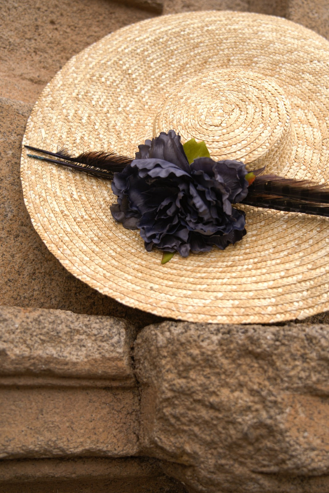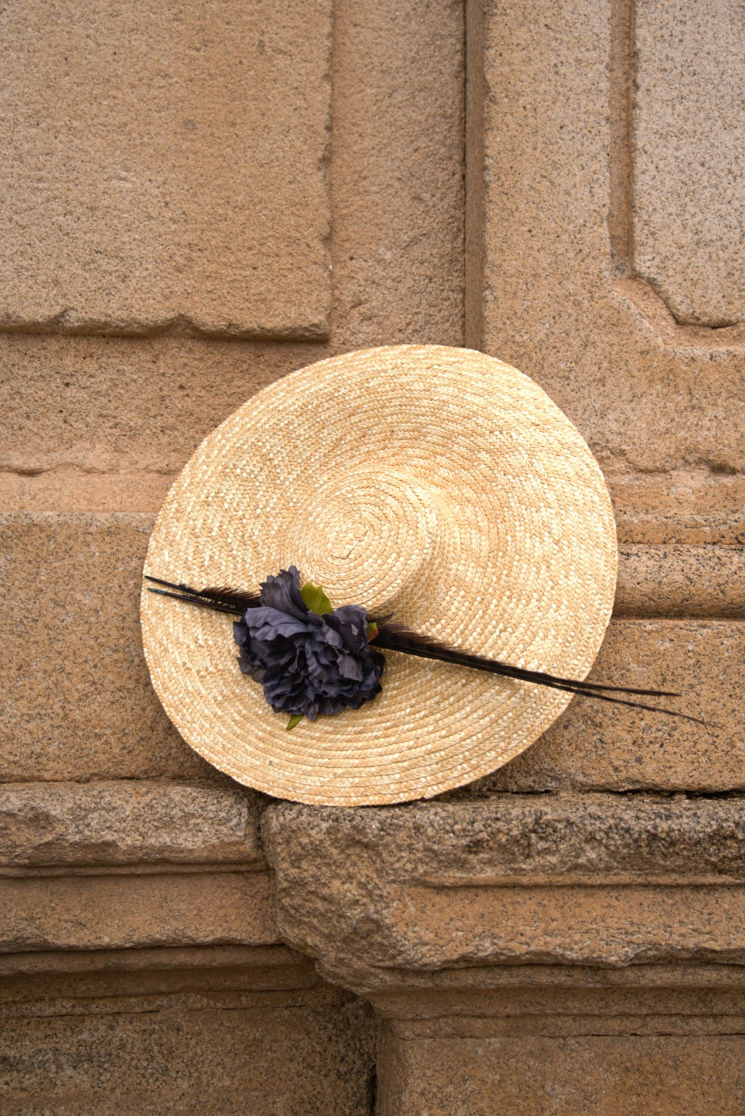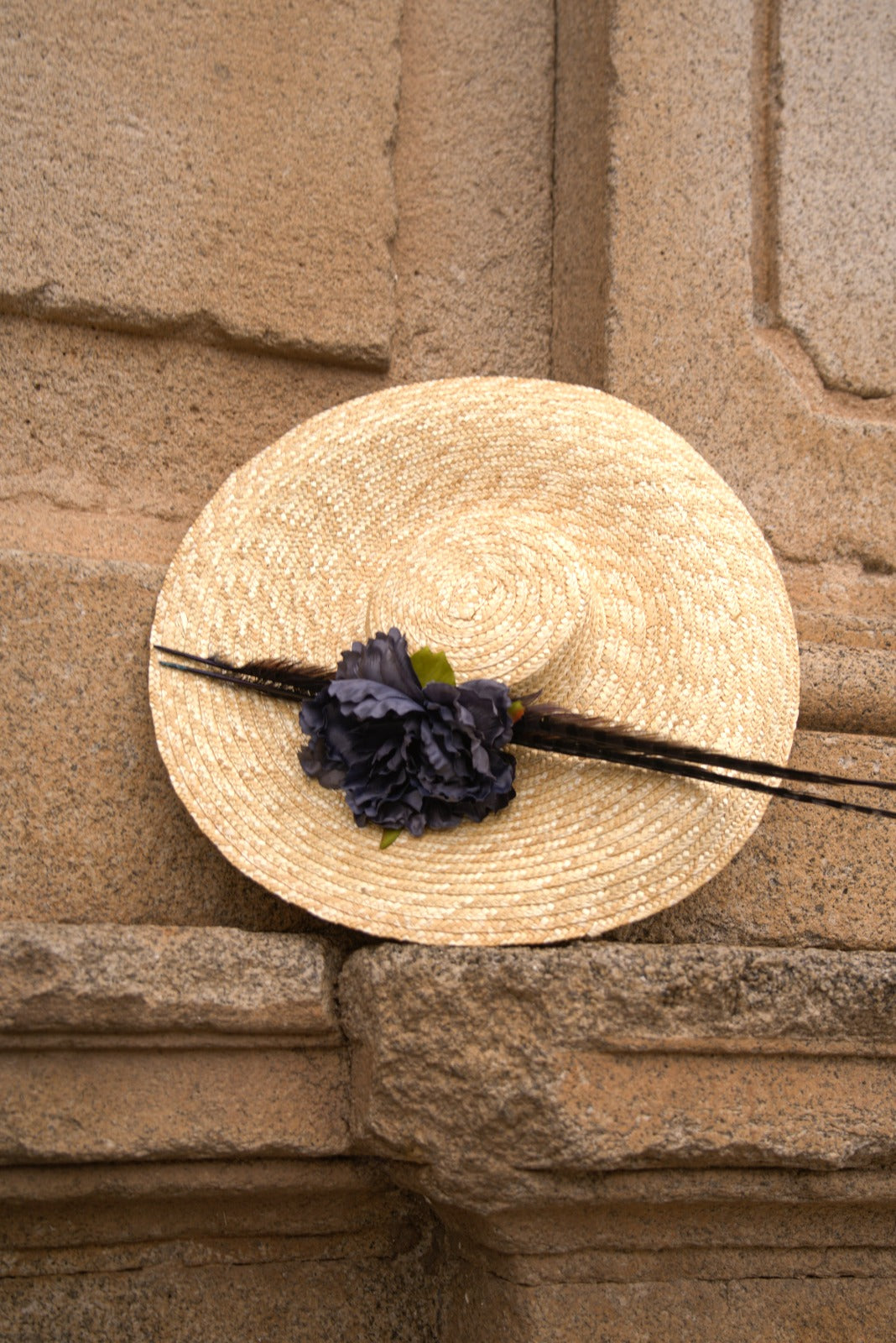 Pamela de paja natural, elaborada a mano con flor peonia en color azul y plumas.