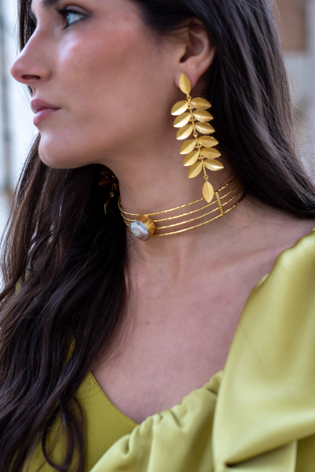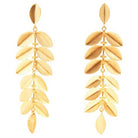 Pendientes largos formados por múltiples hojas artesanales, cierre con tuerca, dorados.