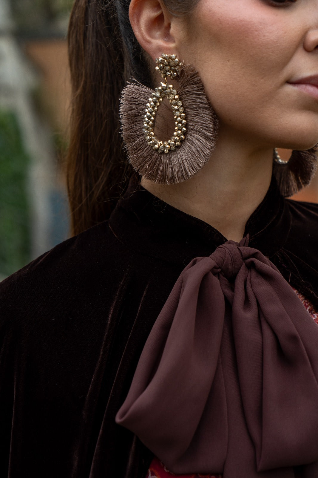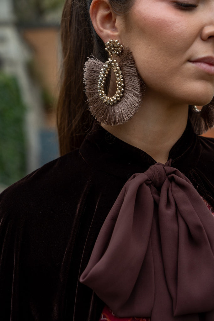 Pendientes cierre con tuerca, formando una lagrima con piedras y alrededor flecos, en color marrón.