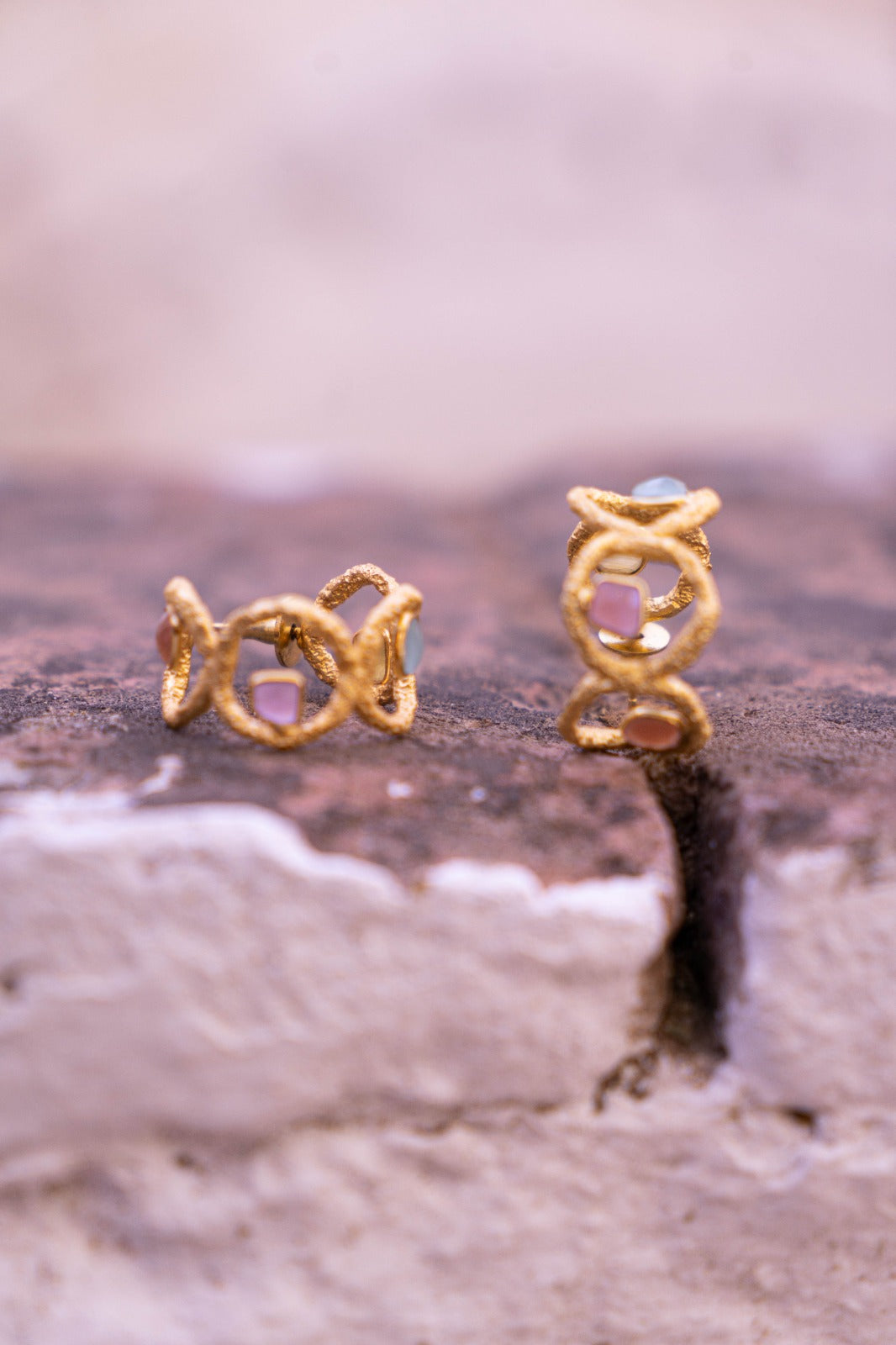 Pendientes en forma de varias circunferencias unidas creando un aro. Dentro de cada una de ellas, se sitúa una piedra de un color diferente.