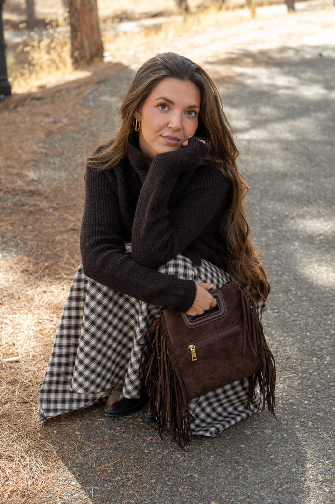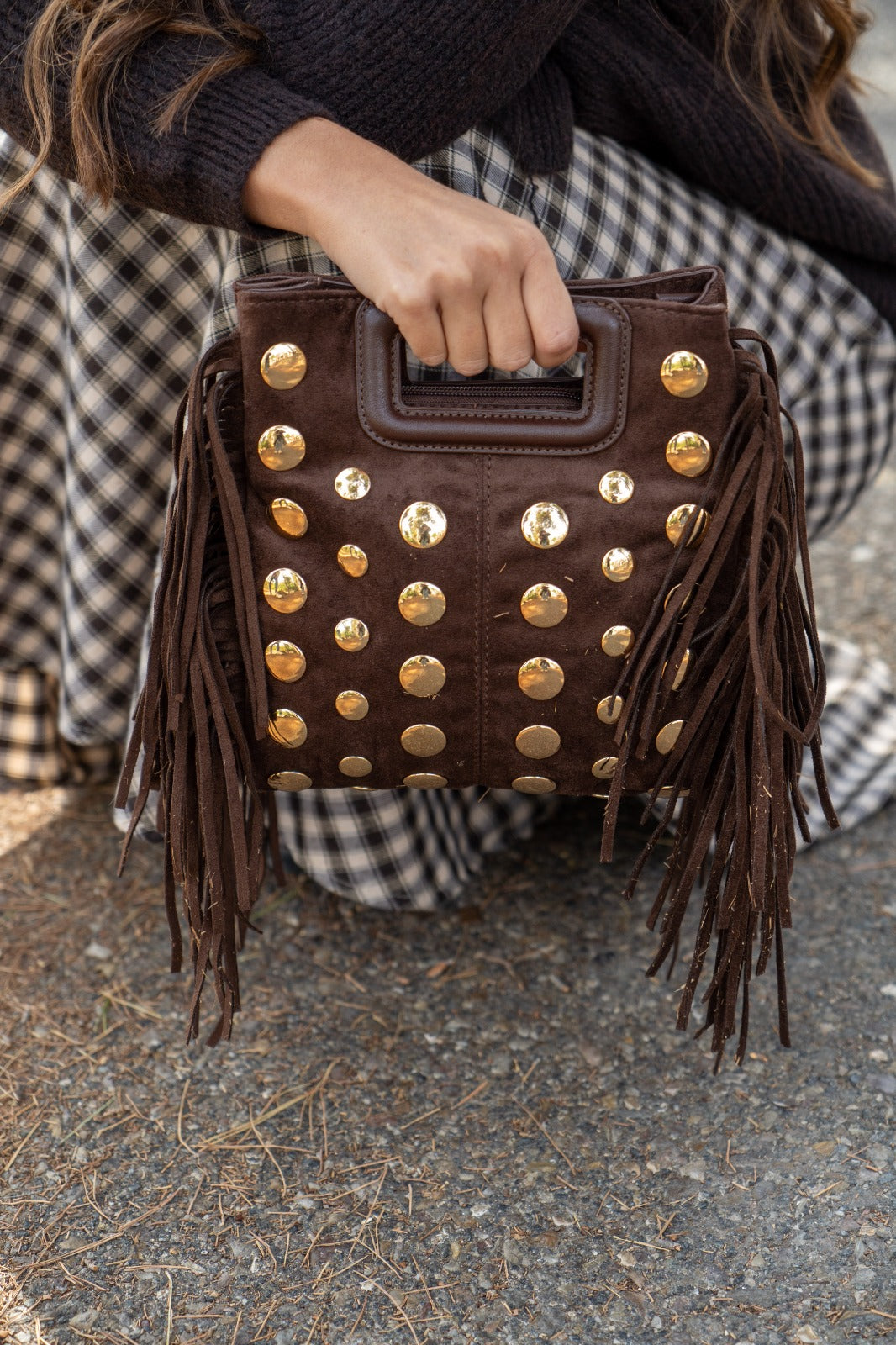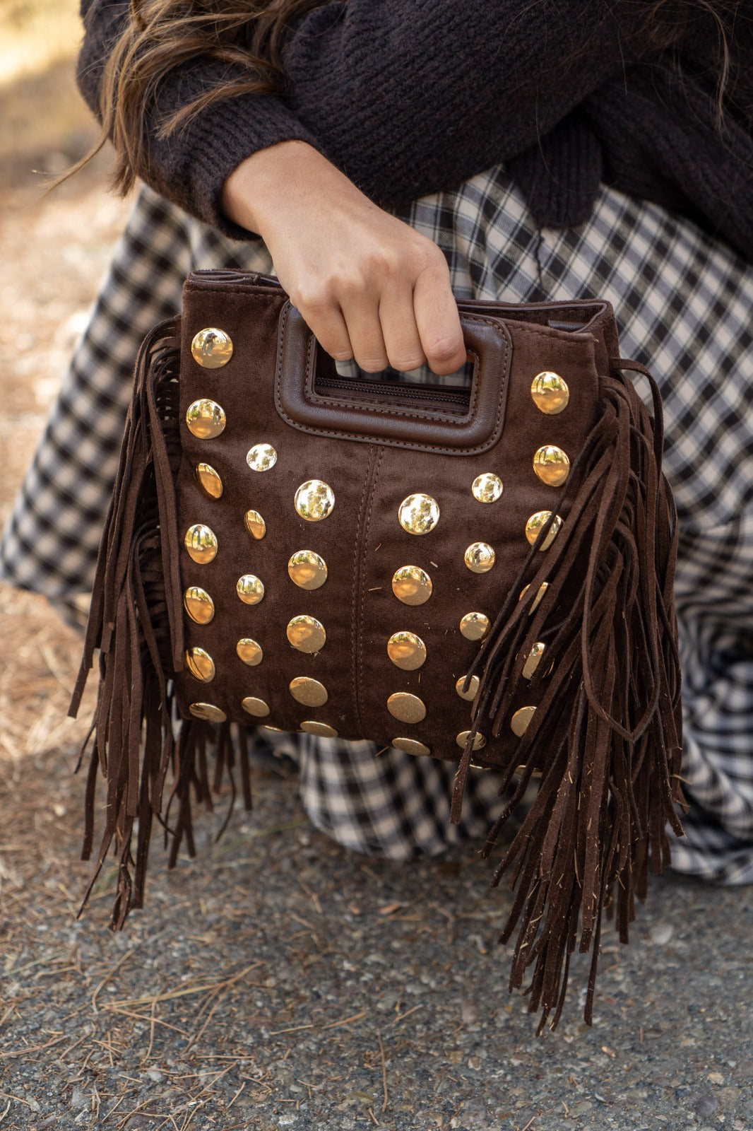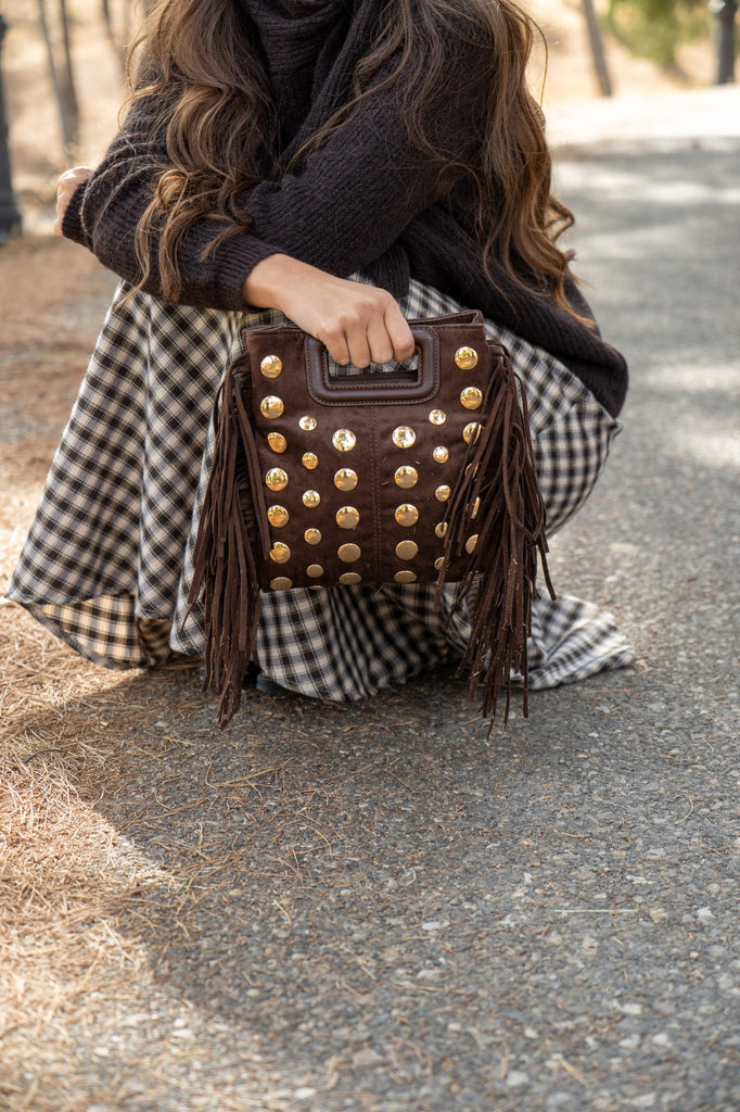 Bolso en ante, cierre con cremallera, asa corta, detalle tachuelas y flecos a los lados. En color marrón.
