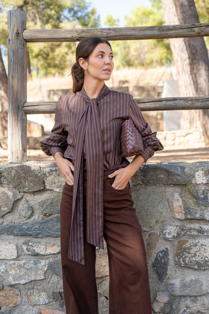 Camisa con lazo en el cuello, mangas abullonadas con puño. En color marrón con rayas.