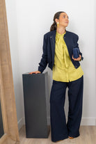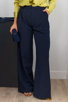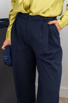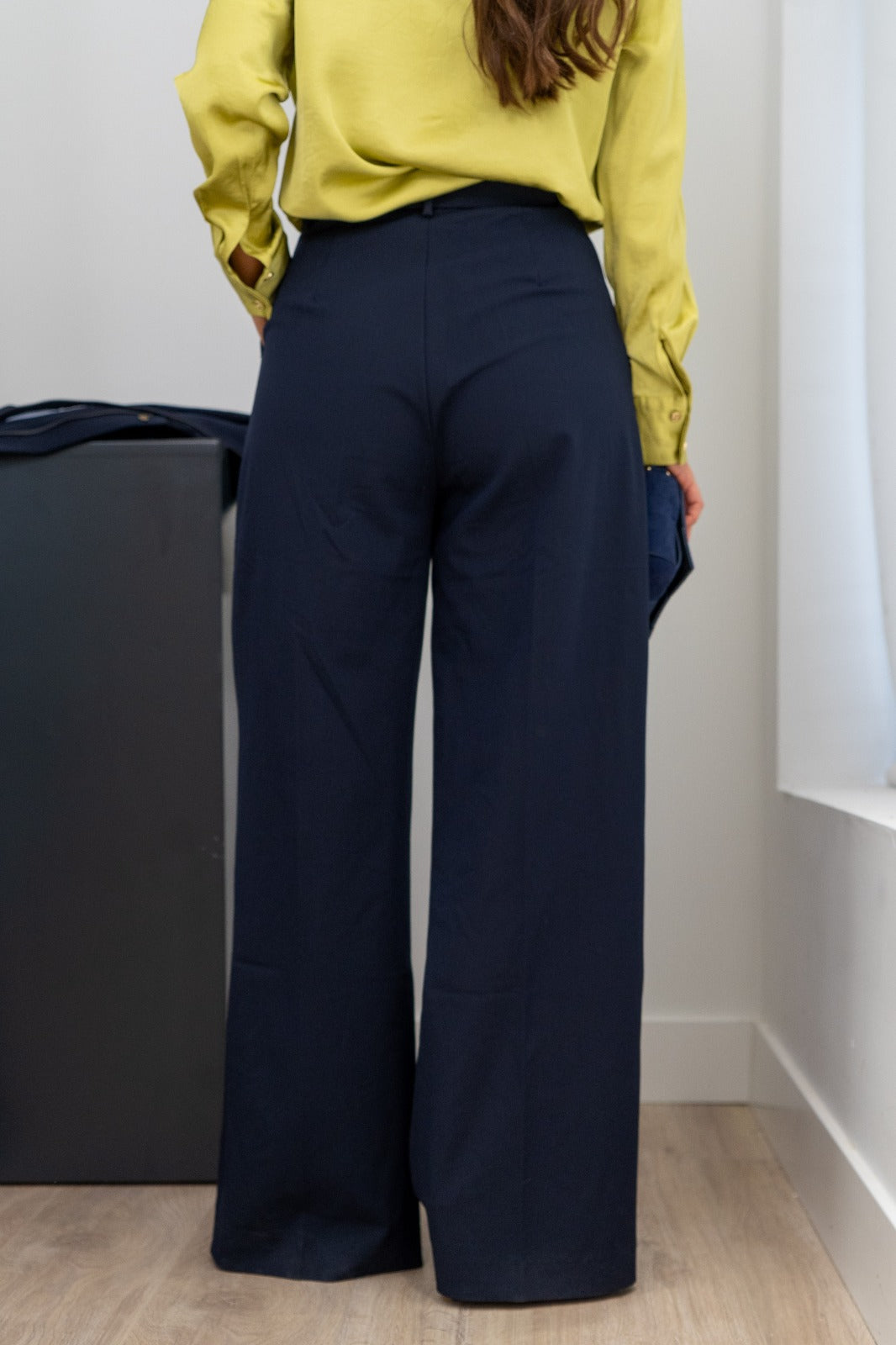 Pantalón tiro alto, bolsillos laterales, pinzas delanteras. En color marino.