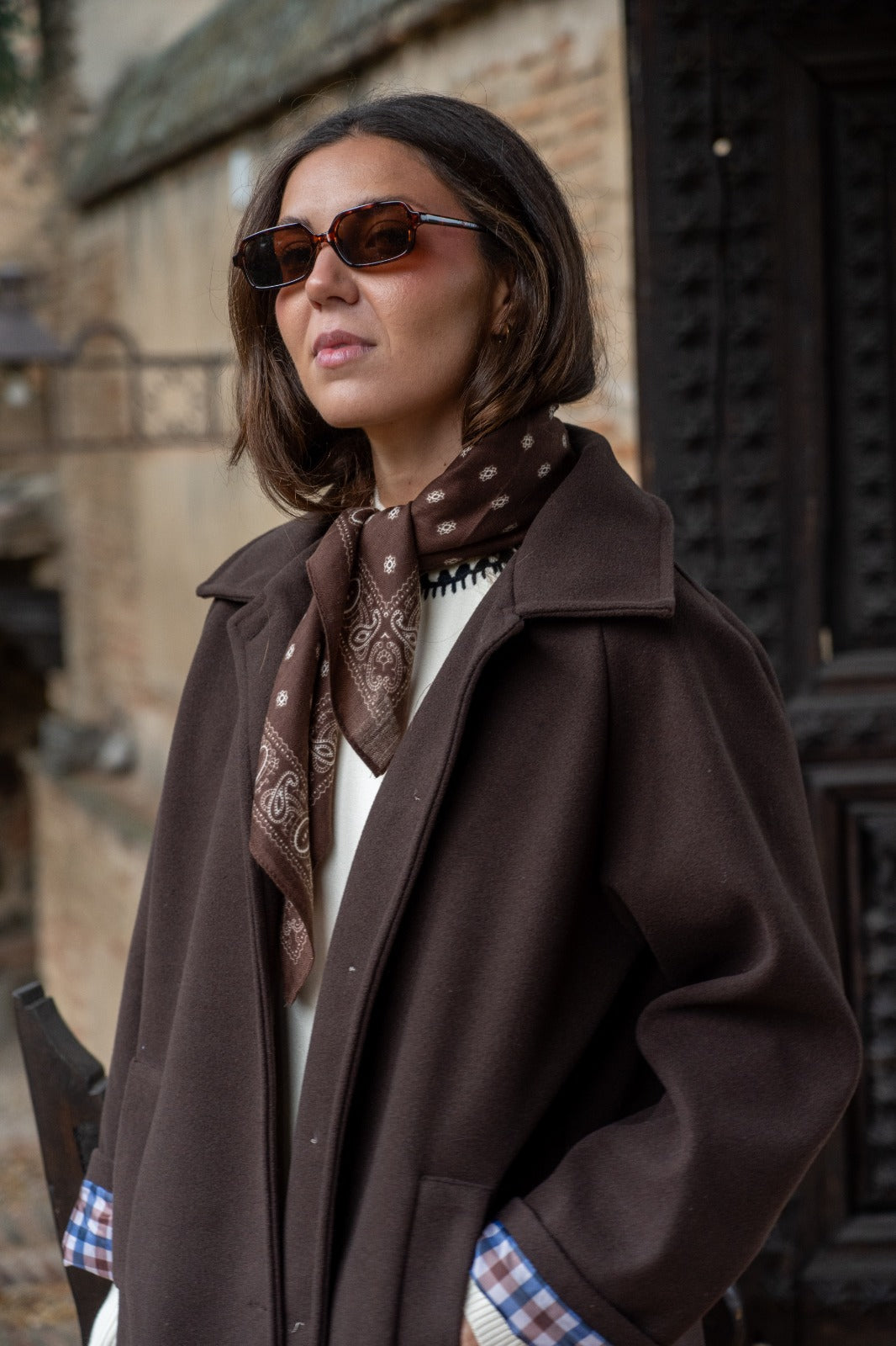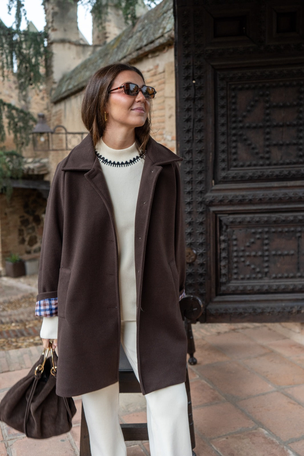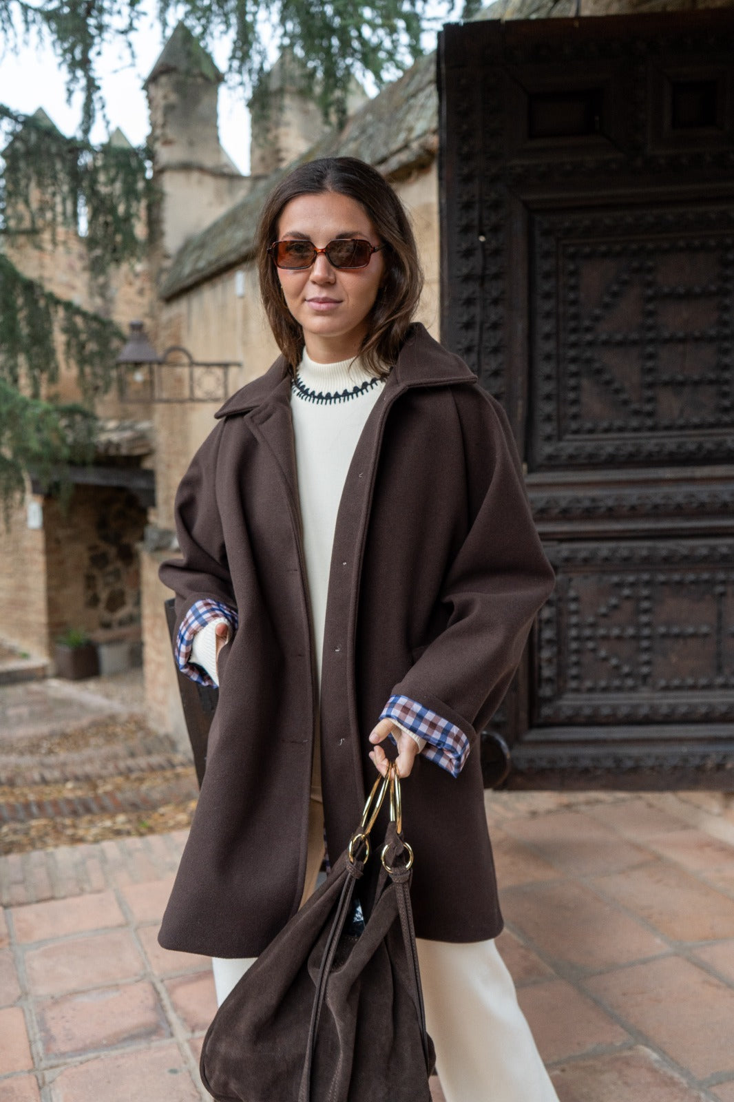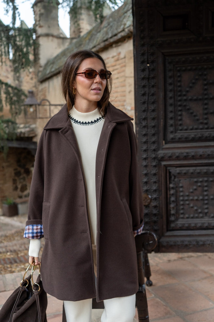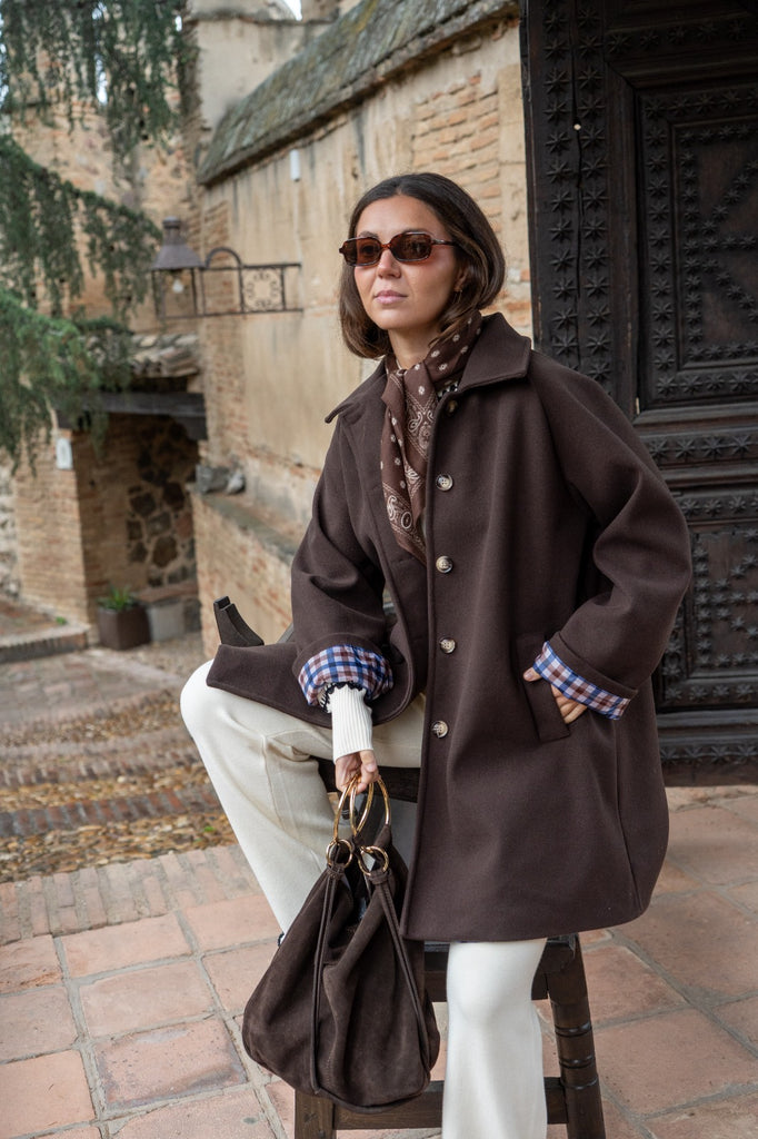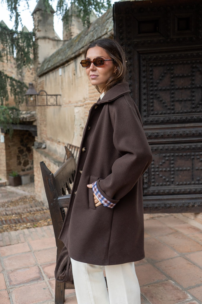 Abrigo largo, tipo paño, calentito, cuello solapa, bolsillos laterales, abotonado. En color marrón con forro de cuadros.