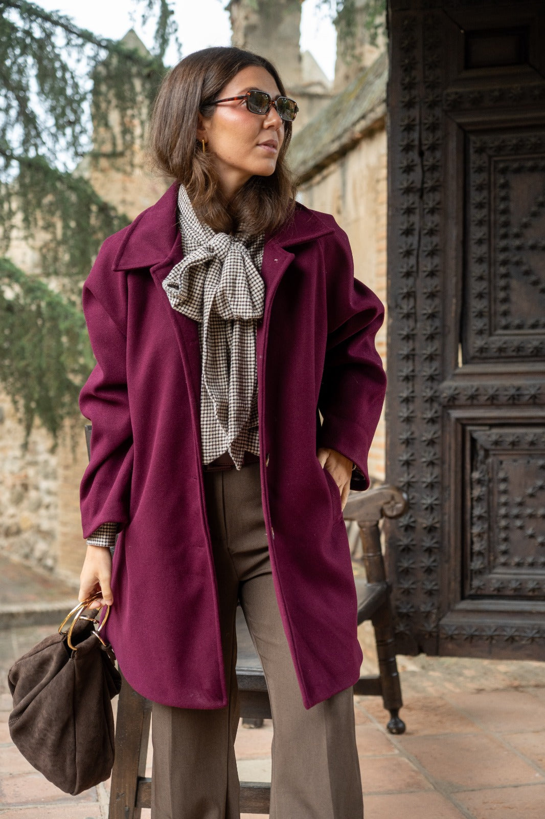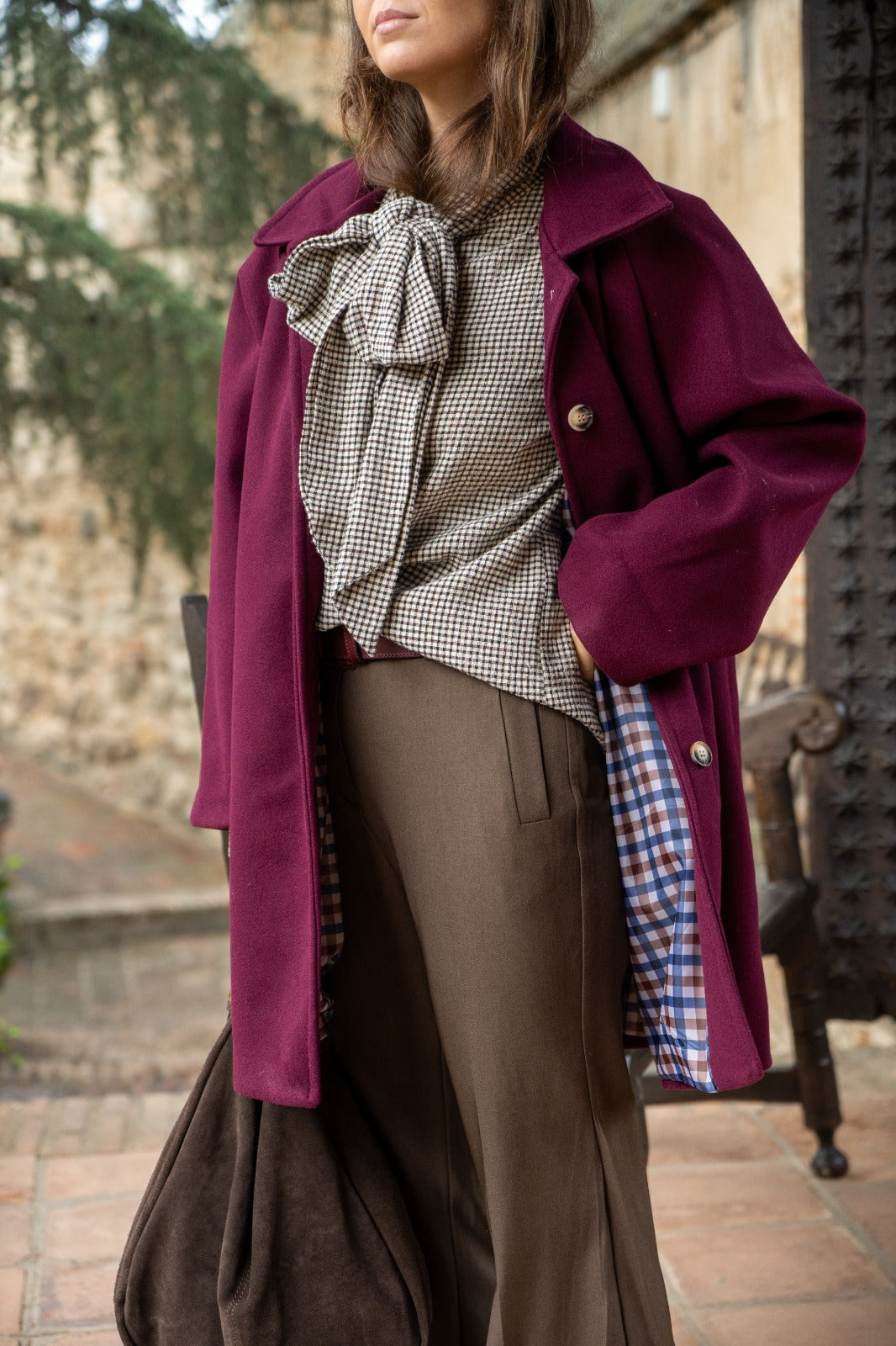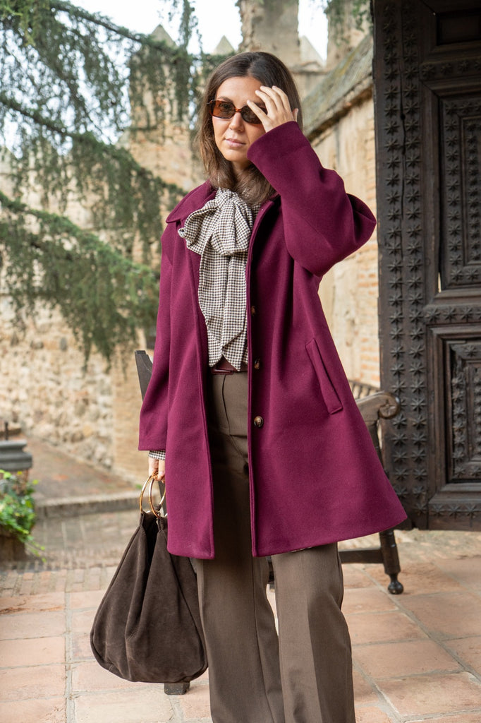 Abrigo largo, tipo paño, calentito, cuello solapa, bolsillos laterales, abotonado. En color burdeos con forro de cuadros.