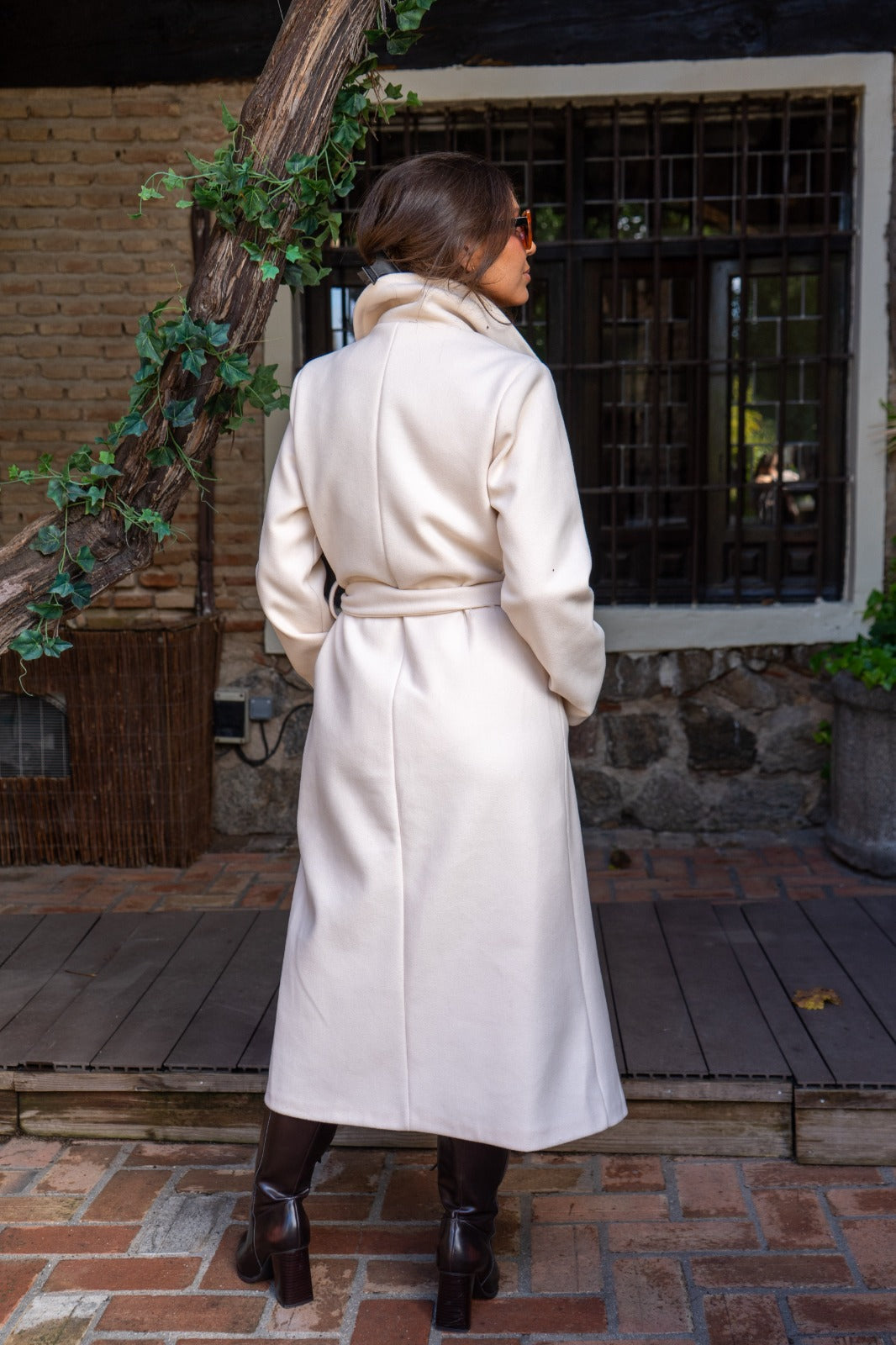 Abrigo largo, tipo paño, calentito, cuello solapa, bolsillos laterales y cinturón. En color beige.