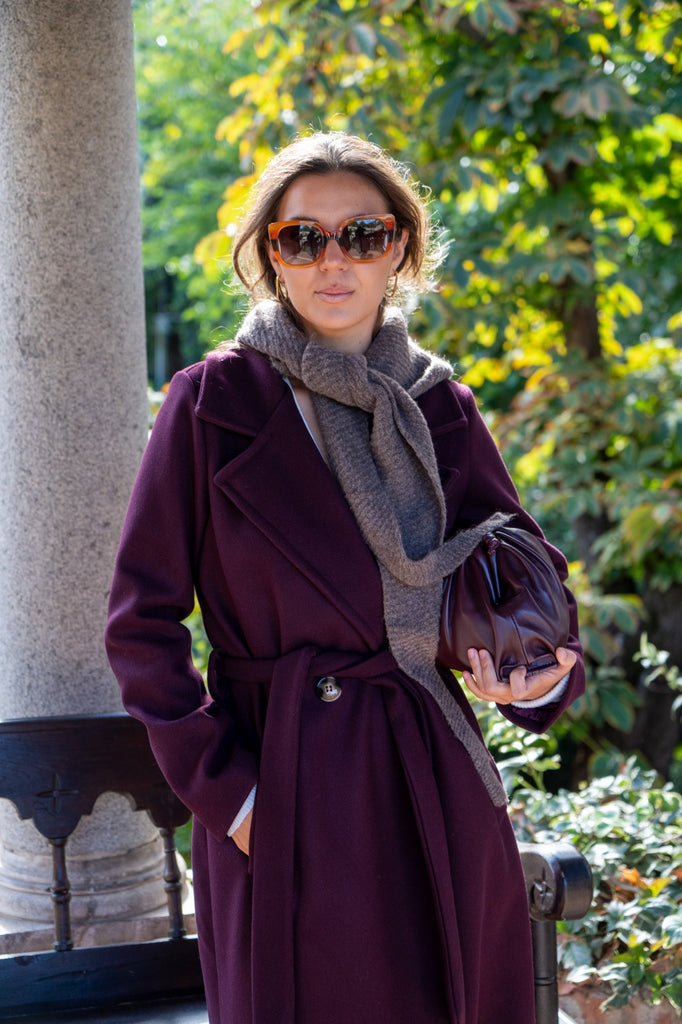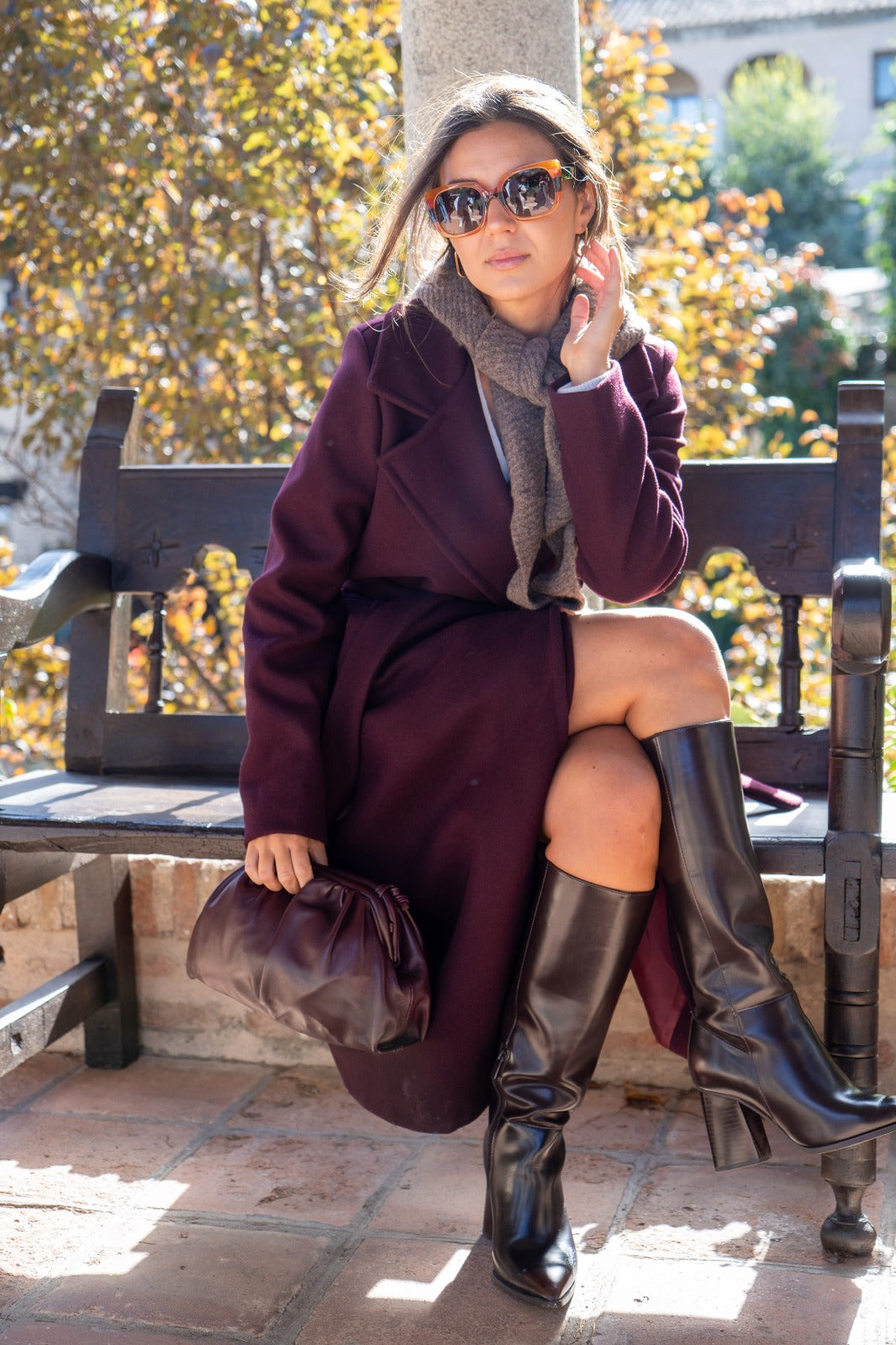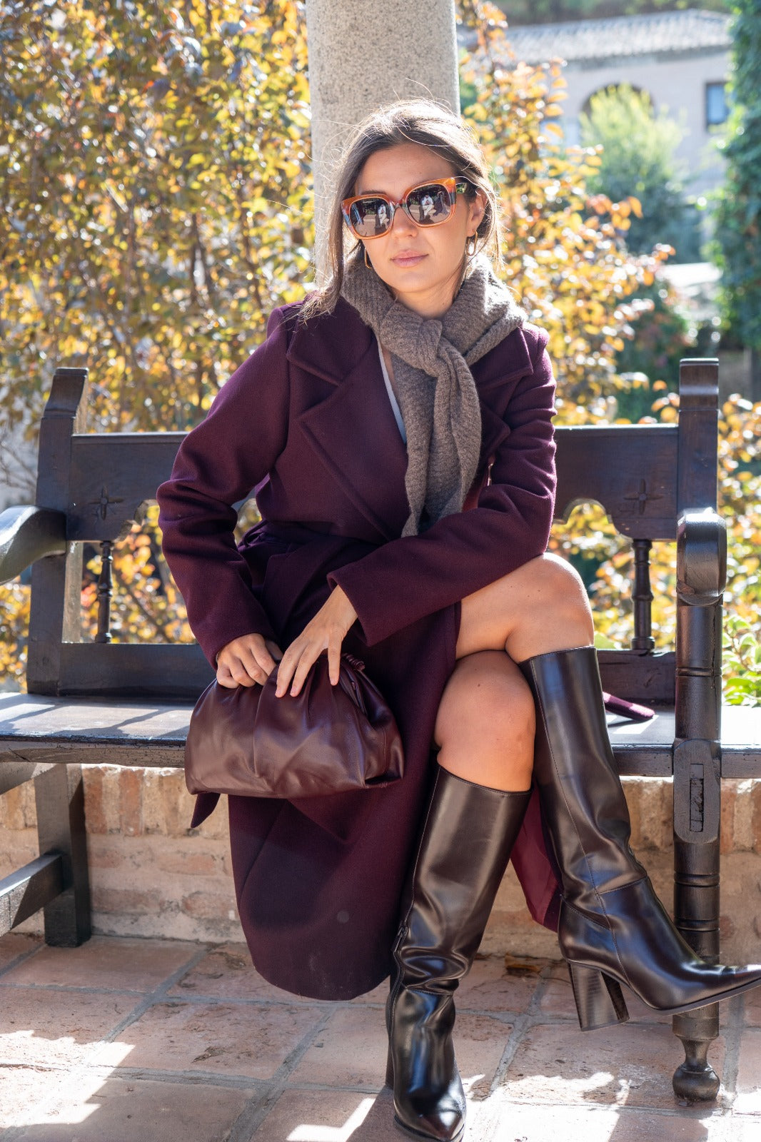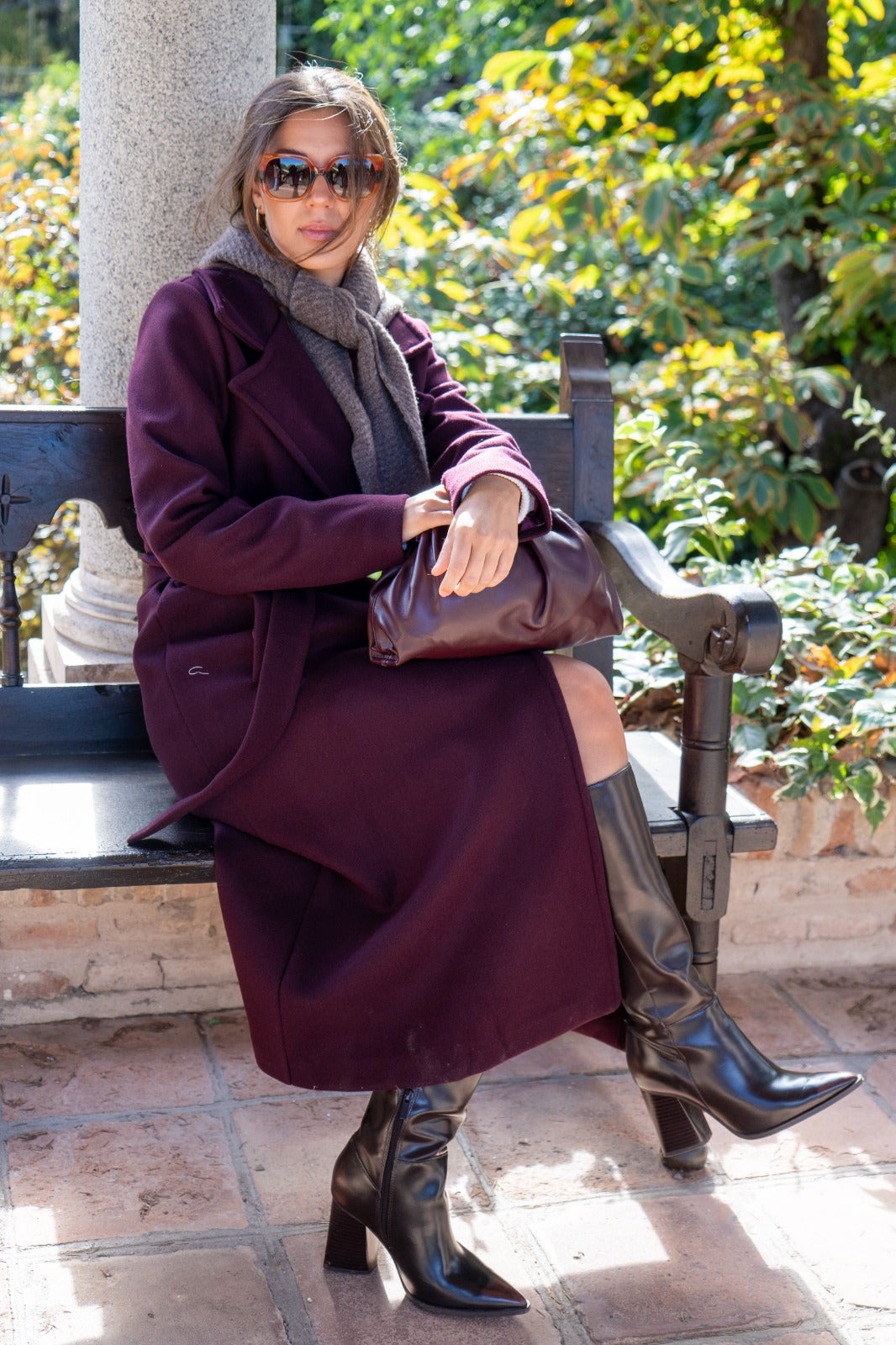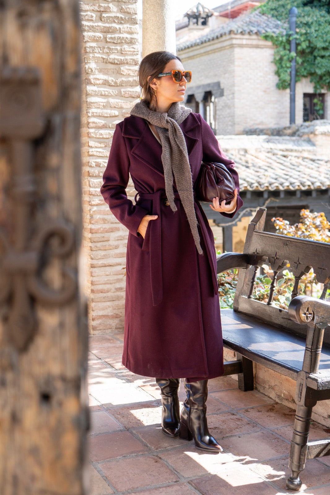 Abrigo largo, tipo paño, calentito, cuello solapa, bolsillos laterales y cinturón. En color berenjena.