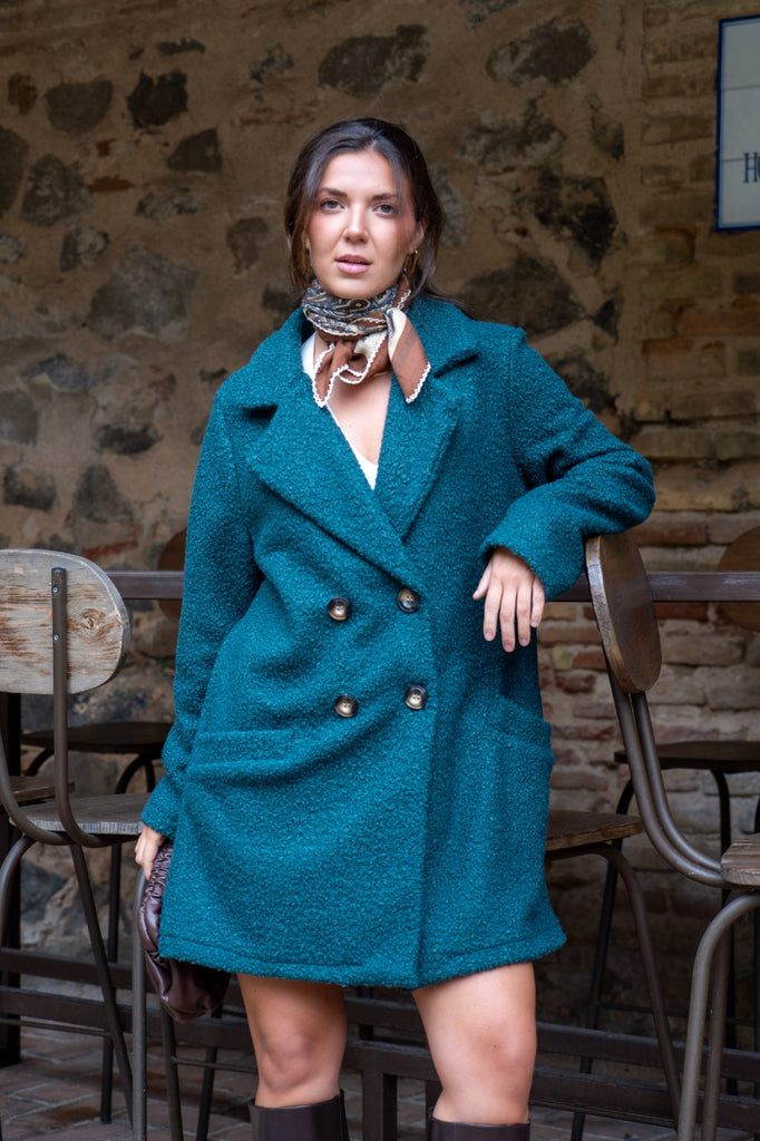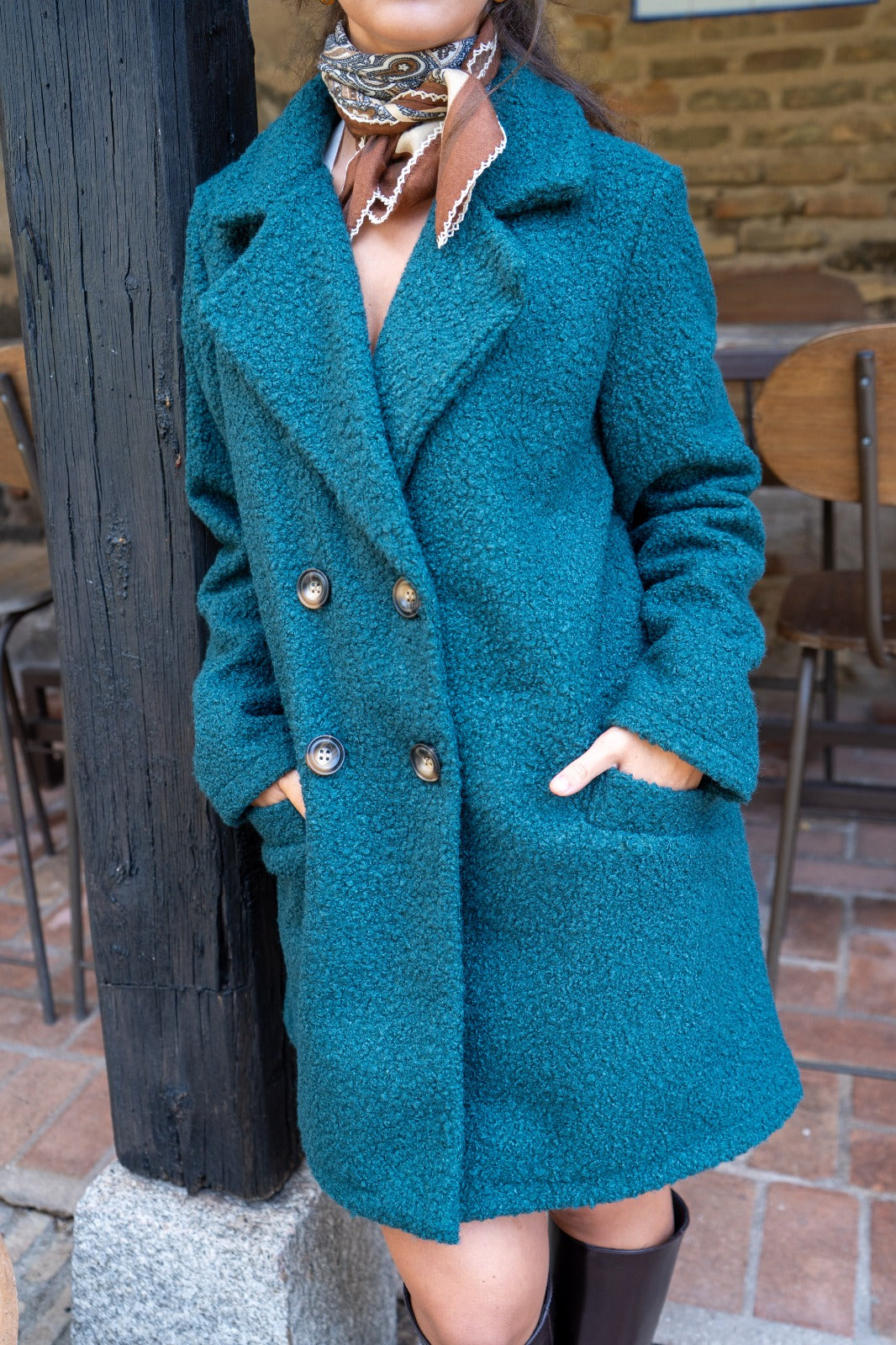 Abrigo cuello solapa, bolsillos laterales, oversize, cierre cruzado con botones. En color verde.
