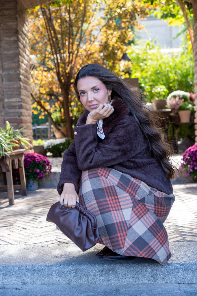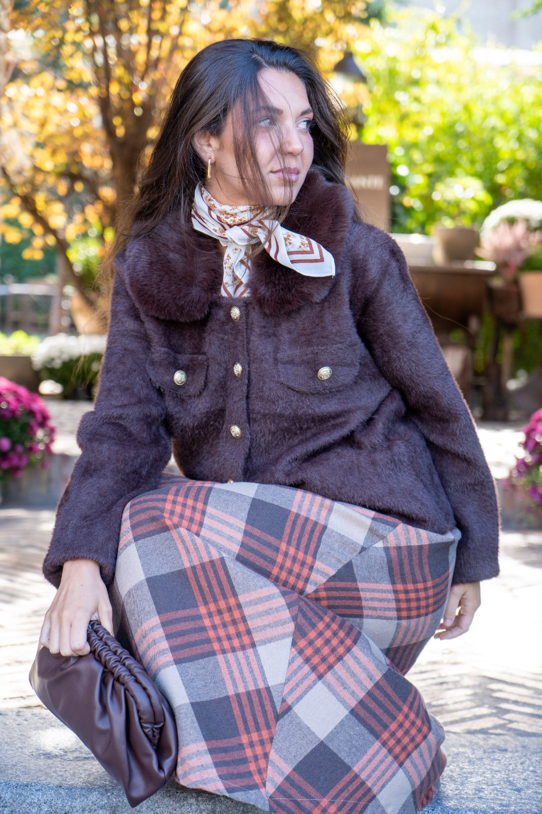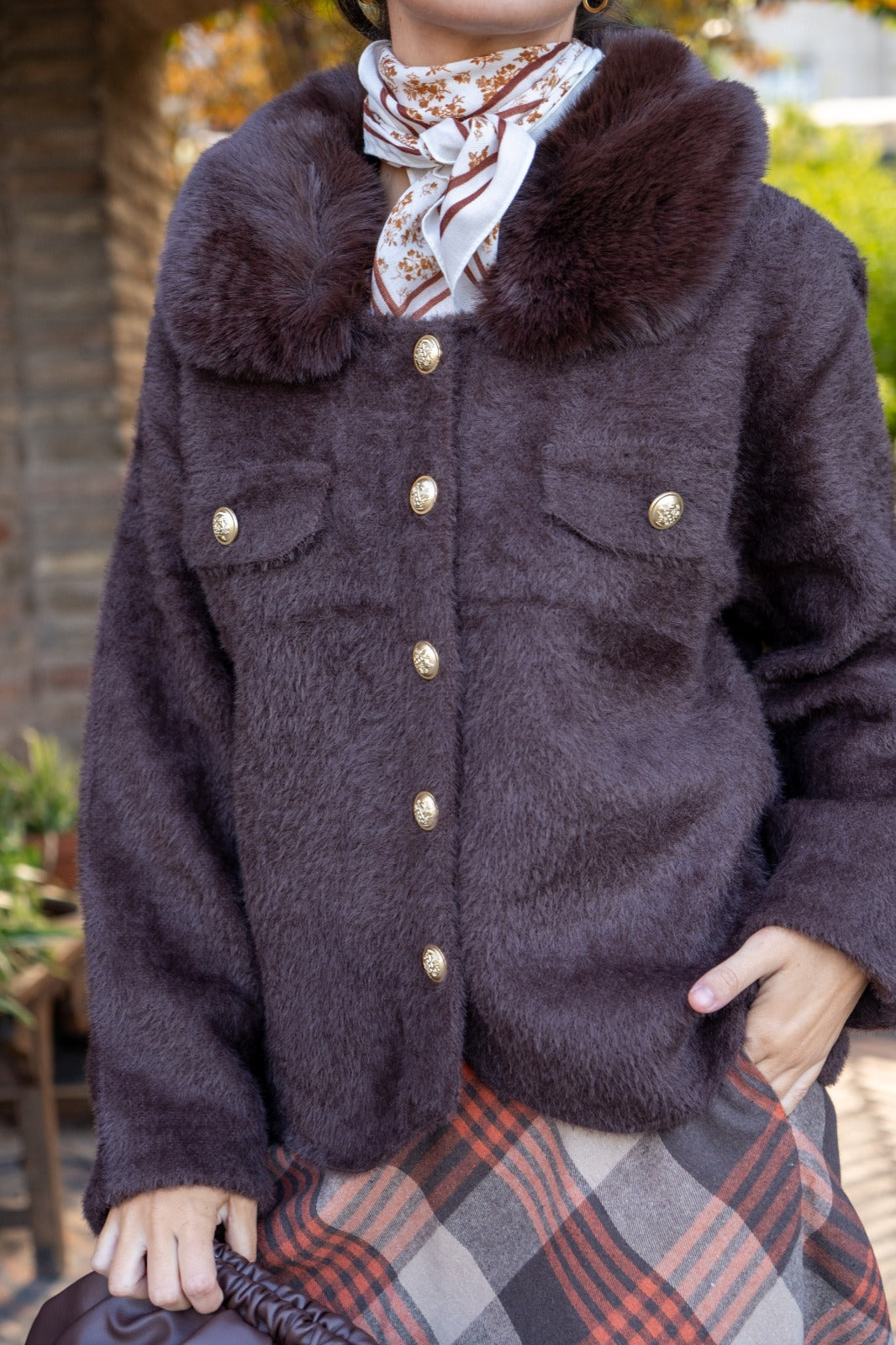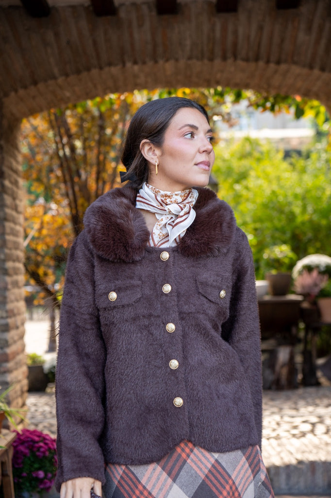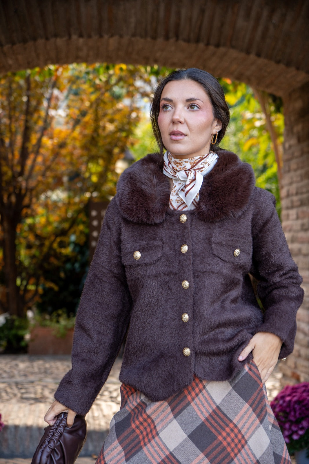 Chaqueta abotonada, tapetas delanteras, cuello piel desmontable, en color marrón.
