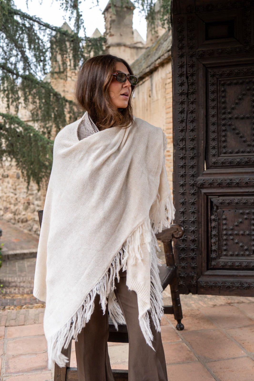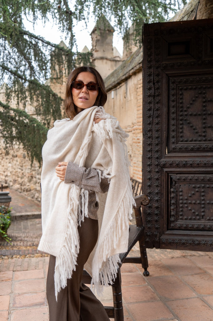 Poncho en lana, abrigado, flecos a los lados, en color beige.