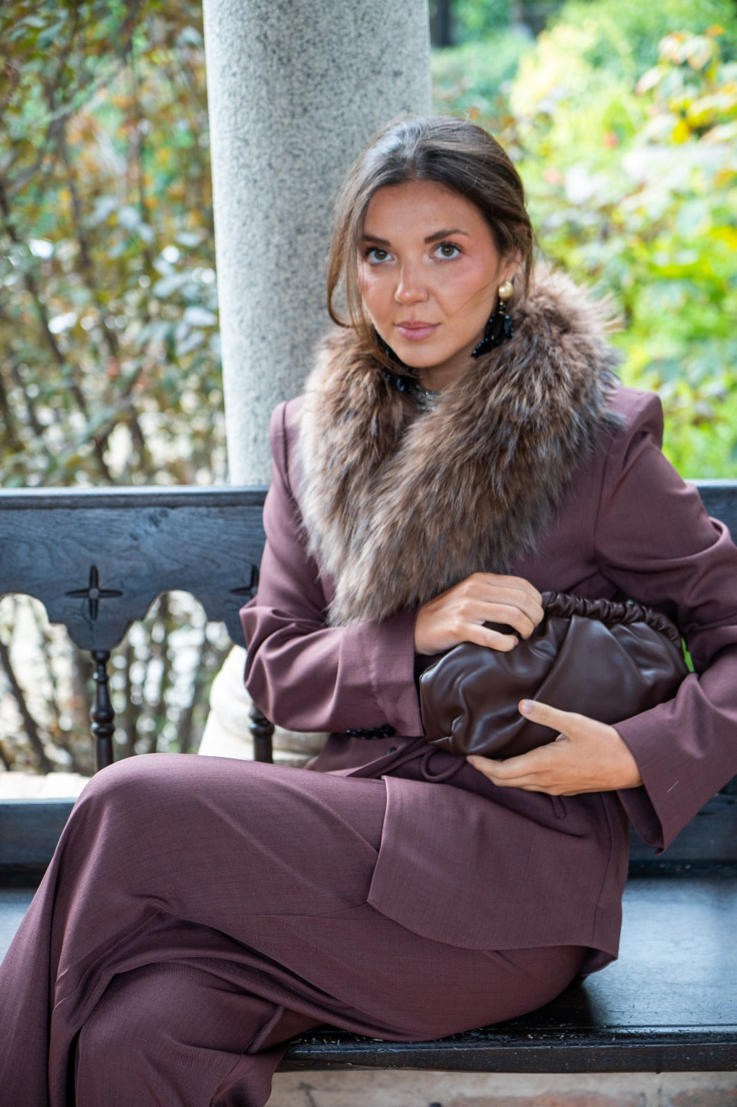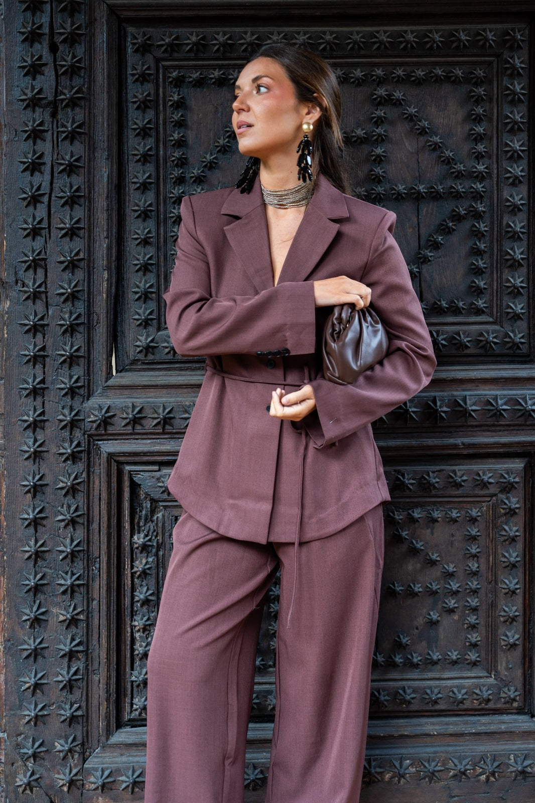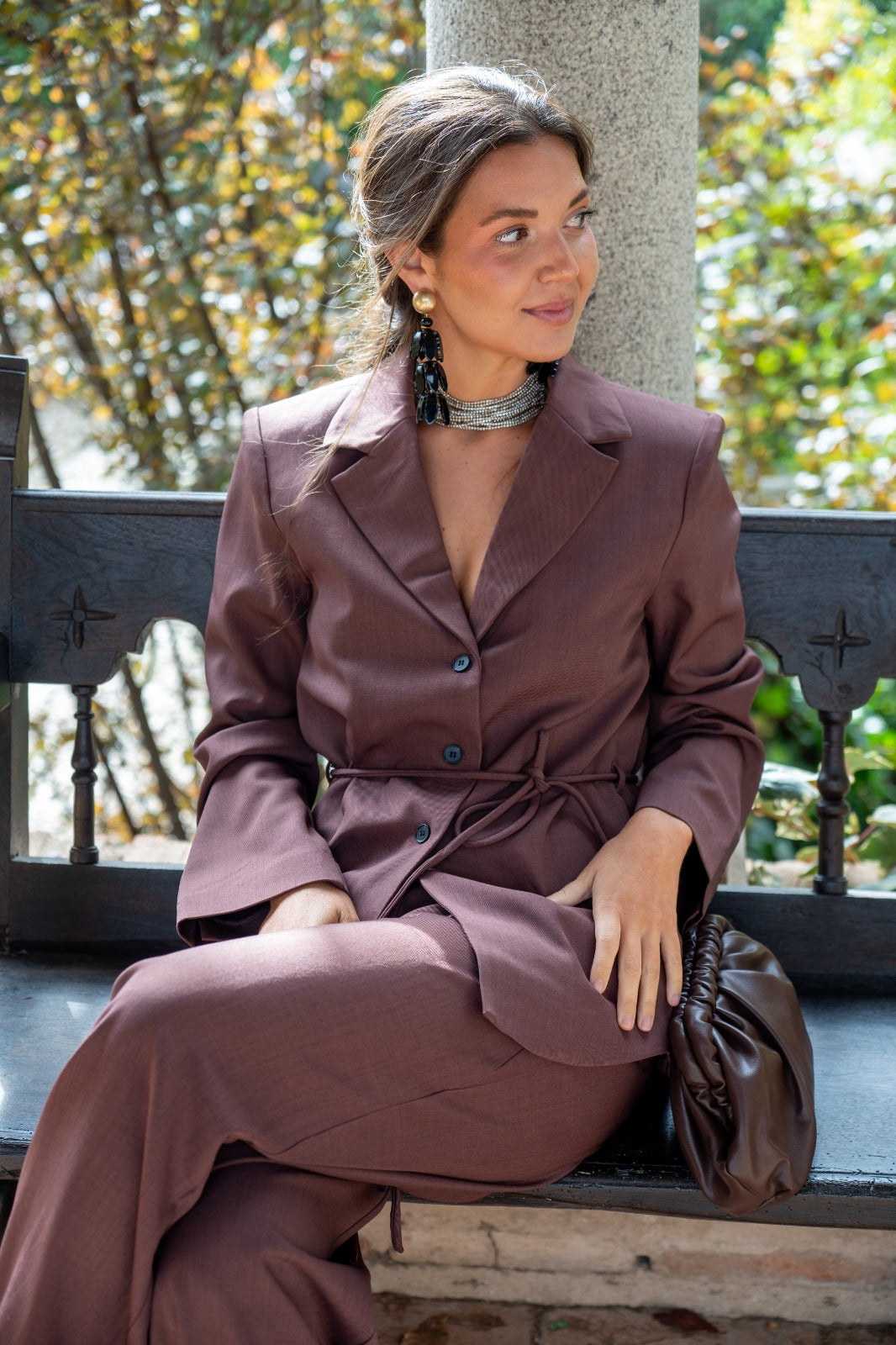 Conjunto compuesto por chaqueta americana, cuello solapa, cierre central con botones, cordón como cinturón y pantalón ancho, pinzas delanteras, bolsillos laterales. En color marrón.