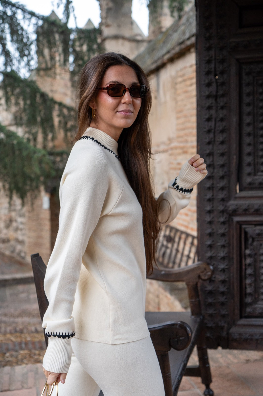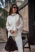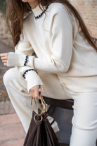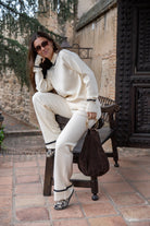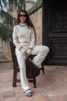 Conjunto punto, compuesto por jersey cuello redondo , manga larga con puño y pantalón con goma. En color beige con cenfa negra.