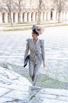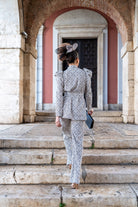 Conjunto compuesto por chaqueta cruzada con cinturón, manga larga abullonada y pantalón tiro alto ancho. En color blanco y negro estampado.