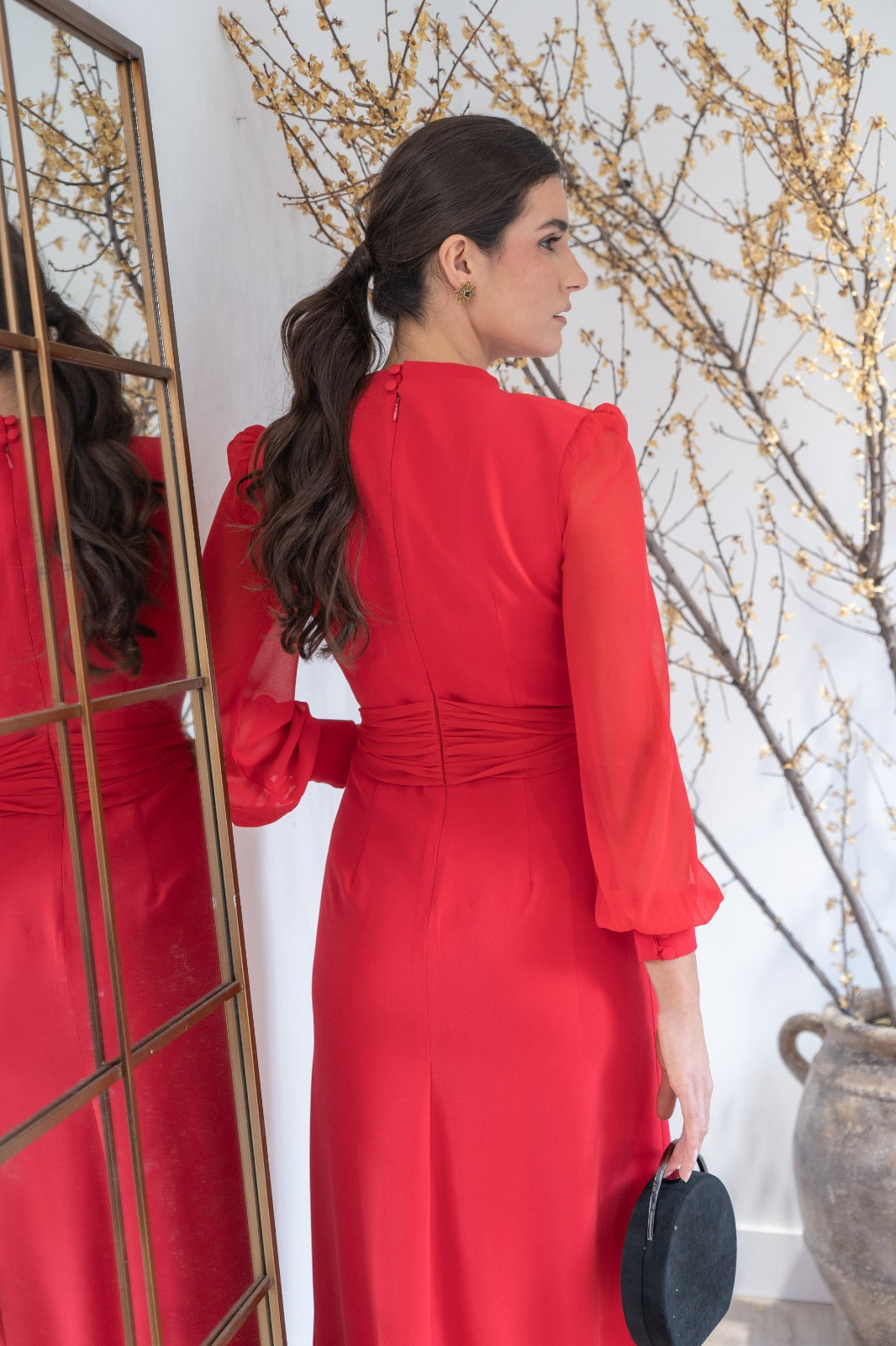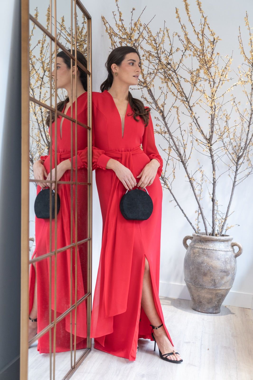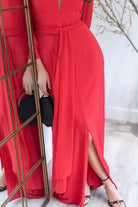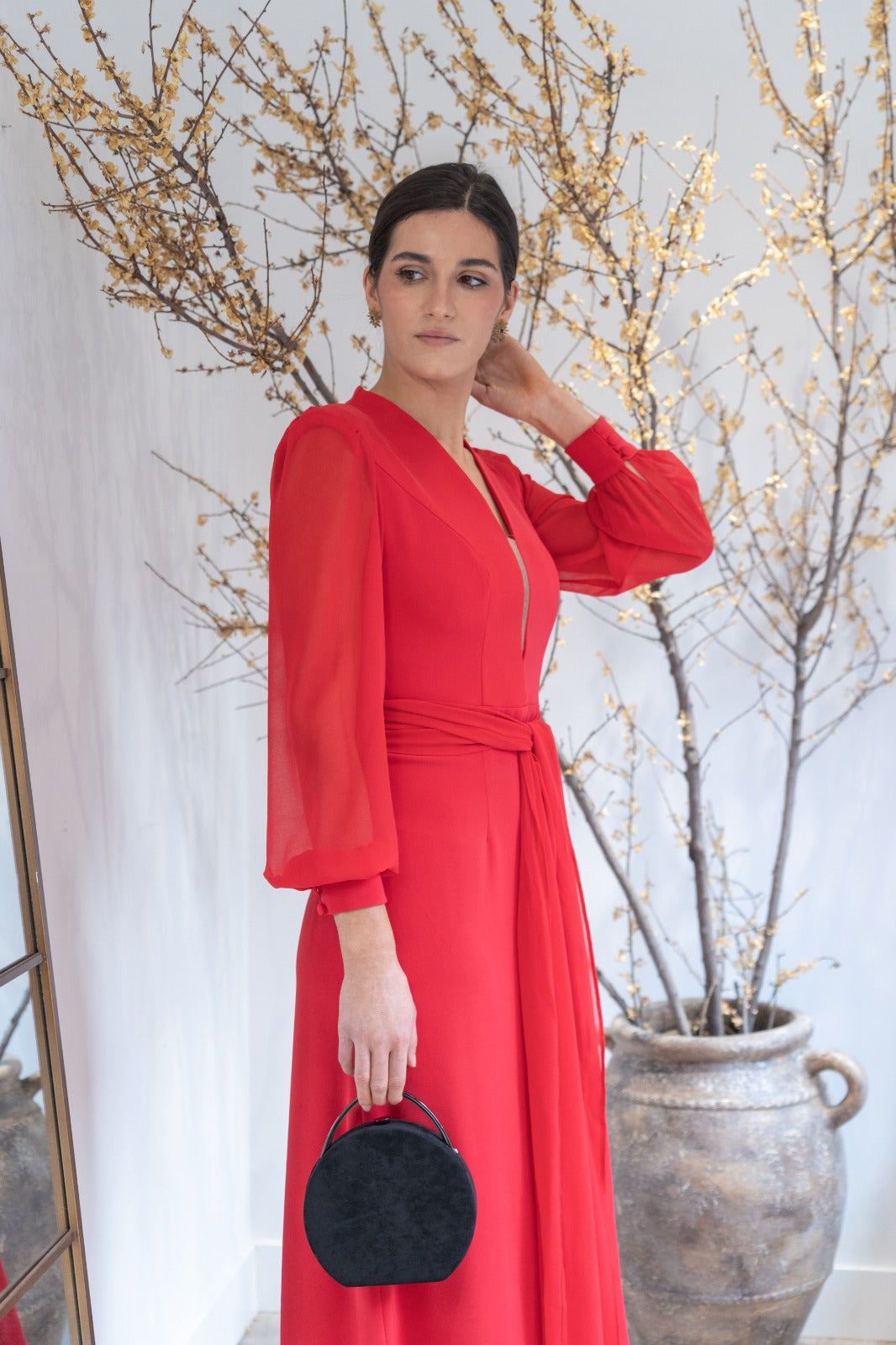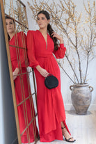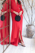 Vestido largo, escote a pico con tul, manga en gasa terminada con puño, corte en cintura con cinturón, abertura delantera. En color rojo.