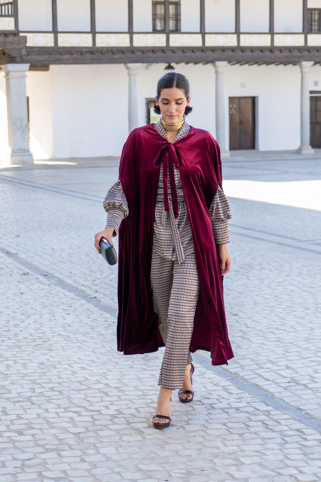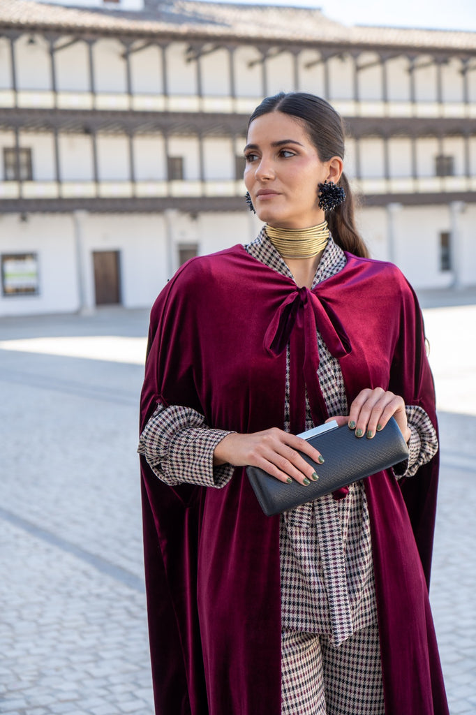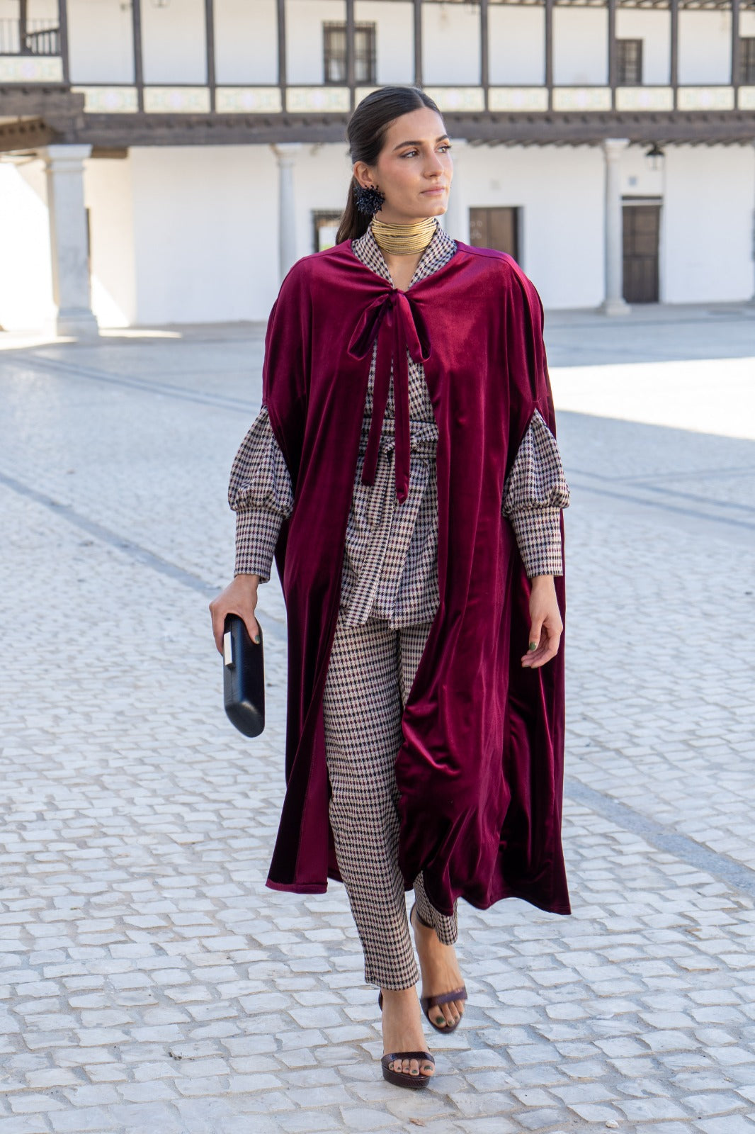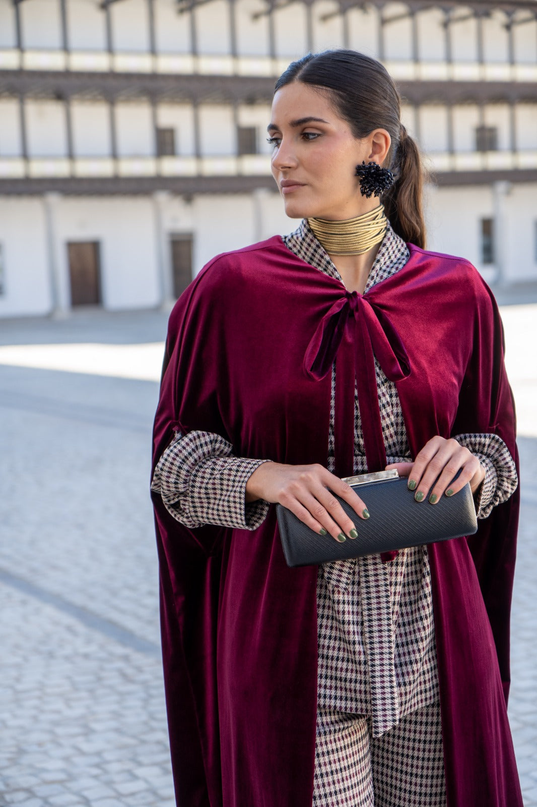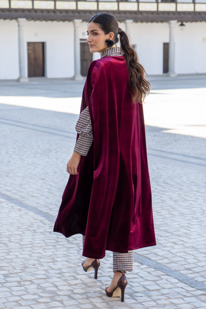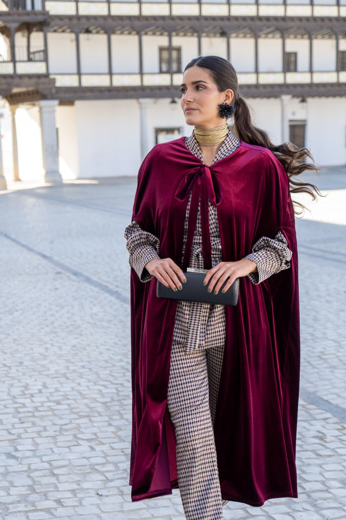 Capa en terciopelo, abertura para meter las manos, 120cm aprox de largo, con lazo para anudar al cuello. En color burdeos.
