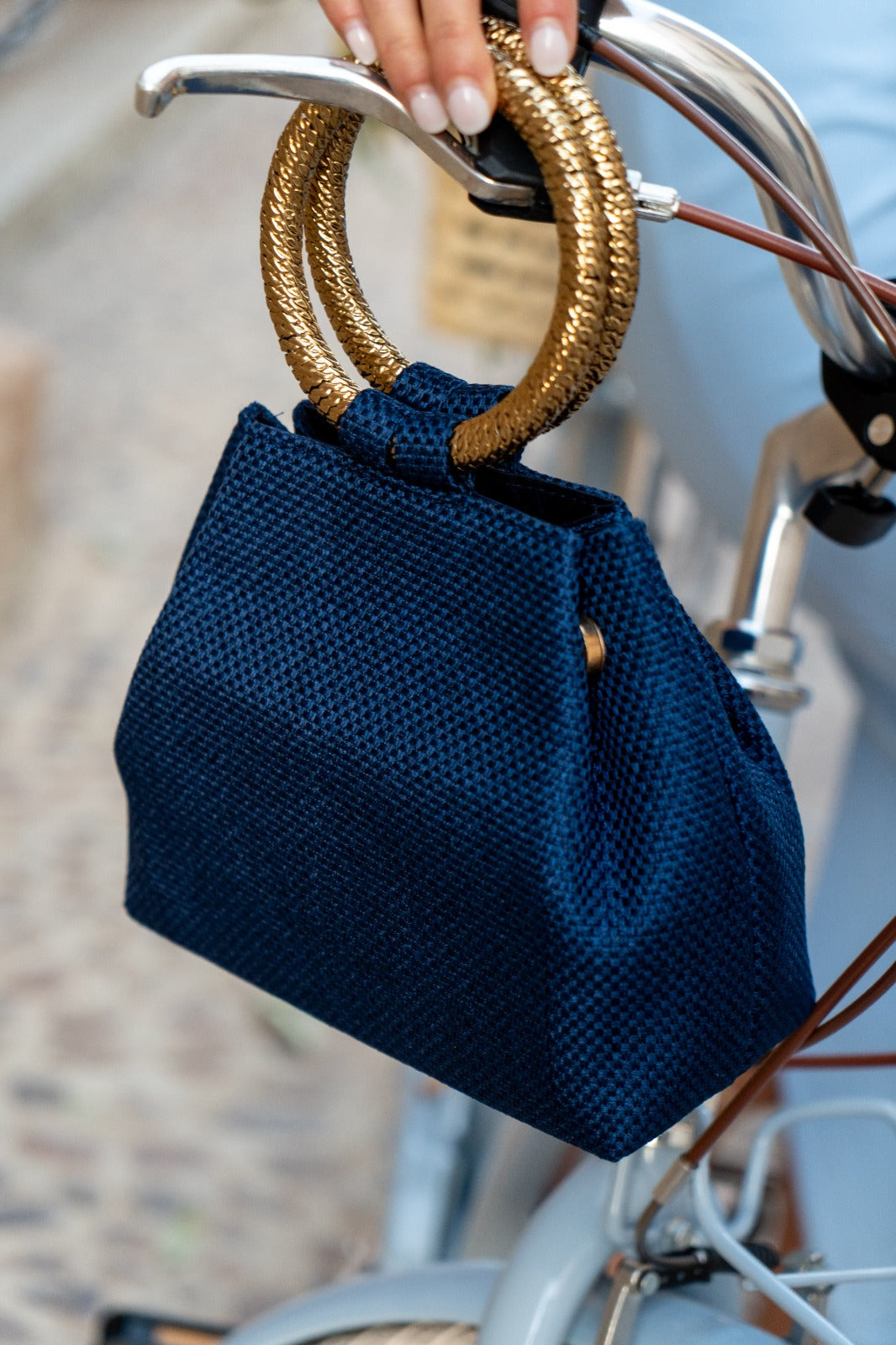 Bolso en tejido, cierre con iman, asas redondas doradas, cadena dorada para colgar. En color azul.