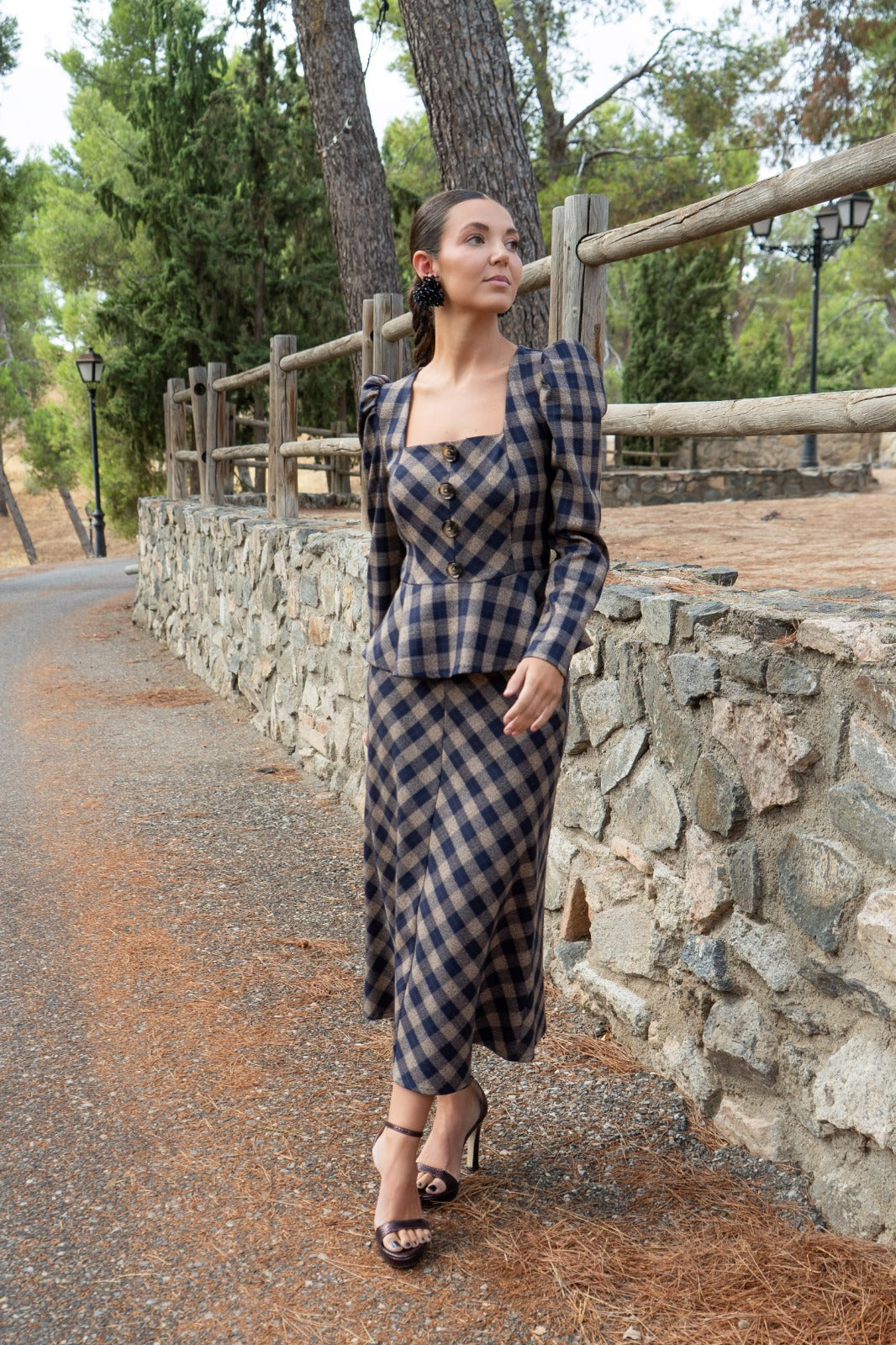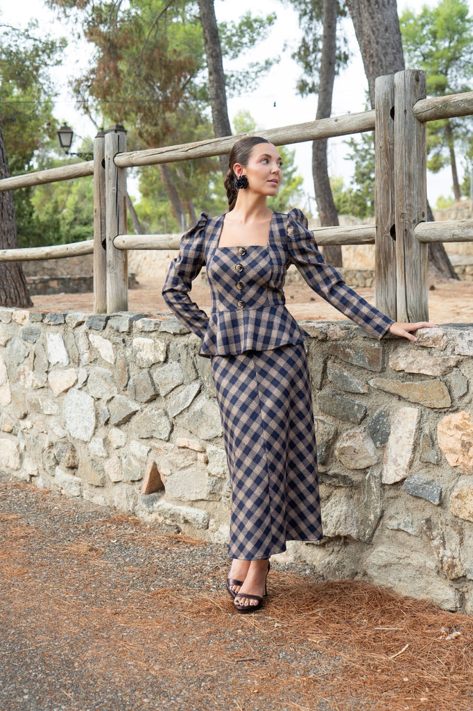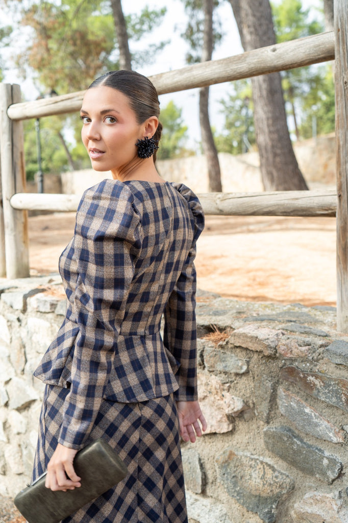Conjunto compuesto por falsa chaqueta, escote cuadrado, manga larga, detalle botones delanteros, peplum y falta alta, corte evase. En cuadros marrón y marino.