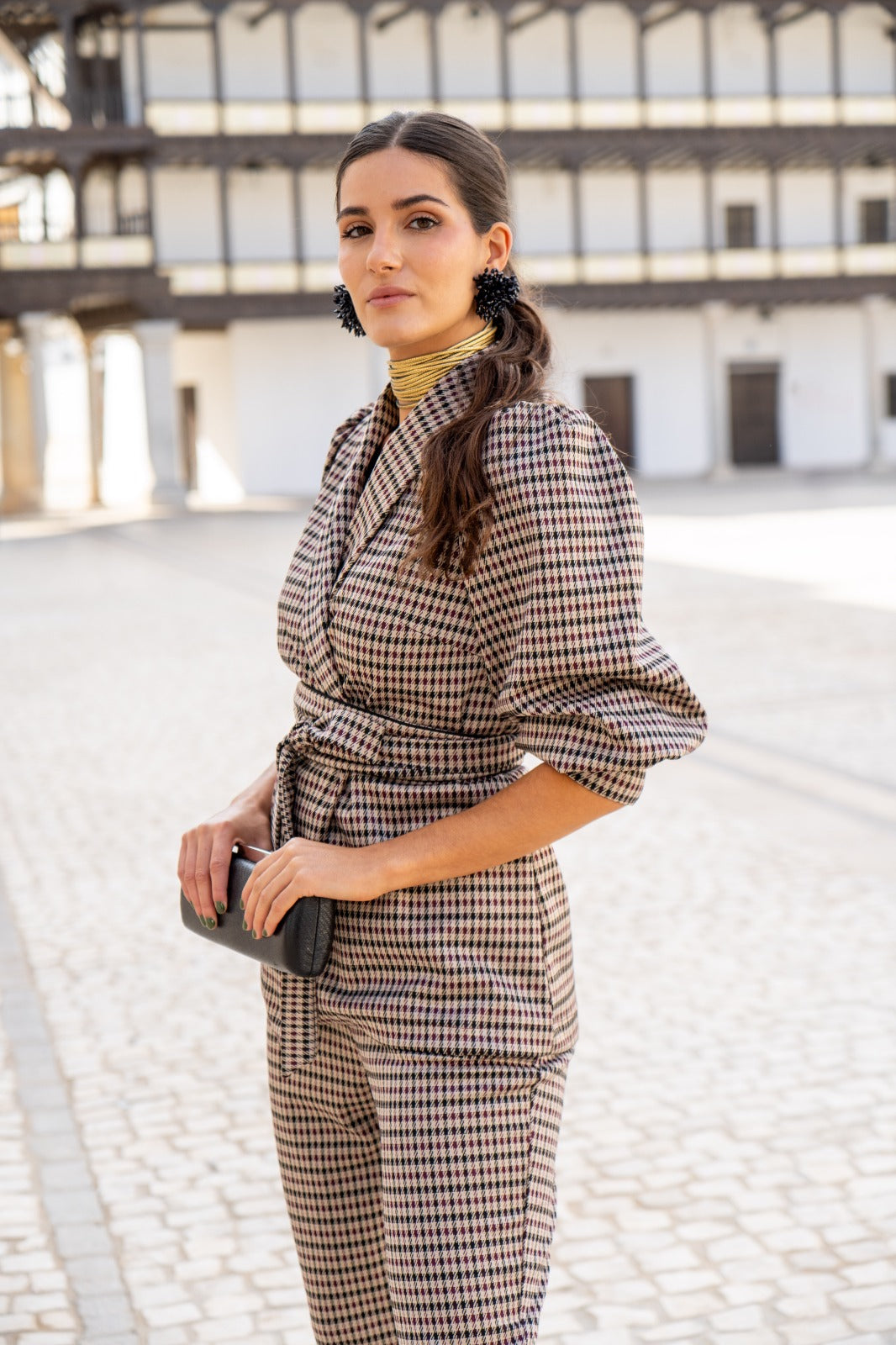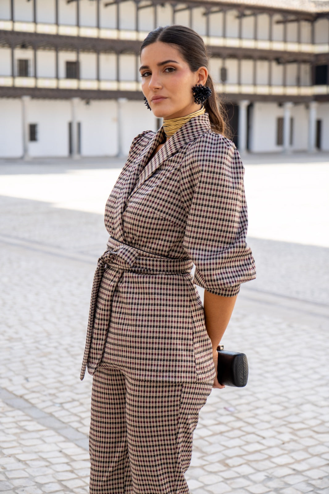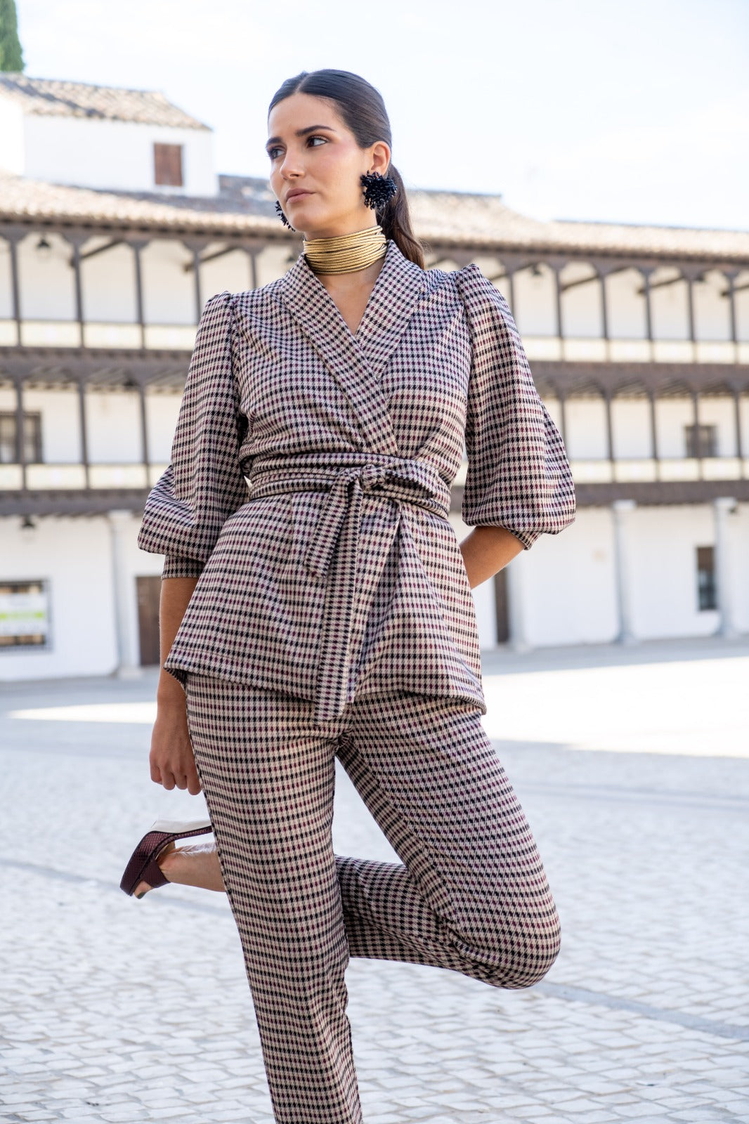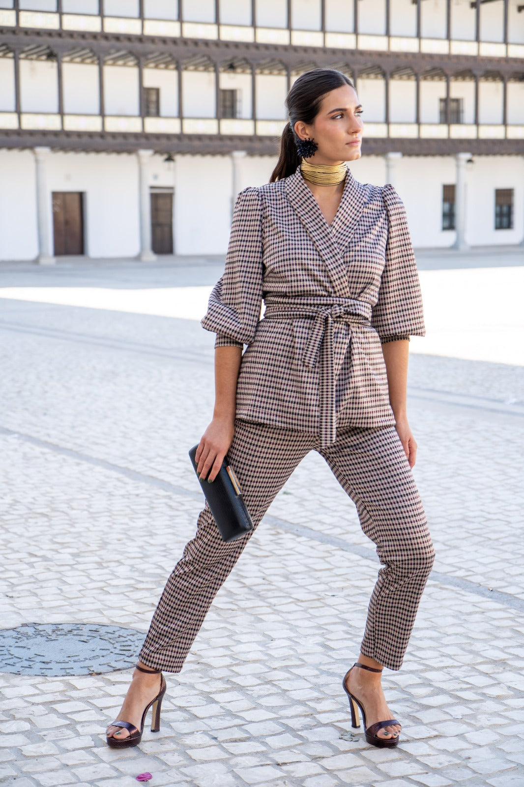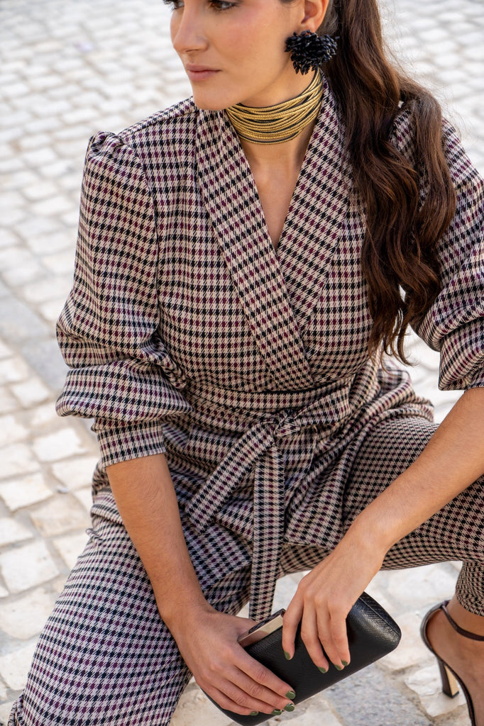 Conjunto compuesto por chaqueta cruzada cuello solapa, cinturón, manga abullonada terminada en puño ancho y pantalón con cintura alta, estrecho de abajo. En cuadros multicolor.