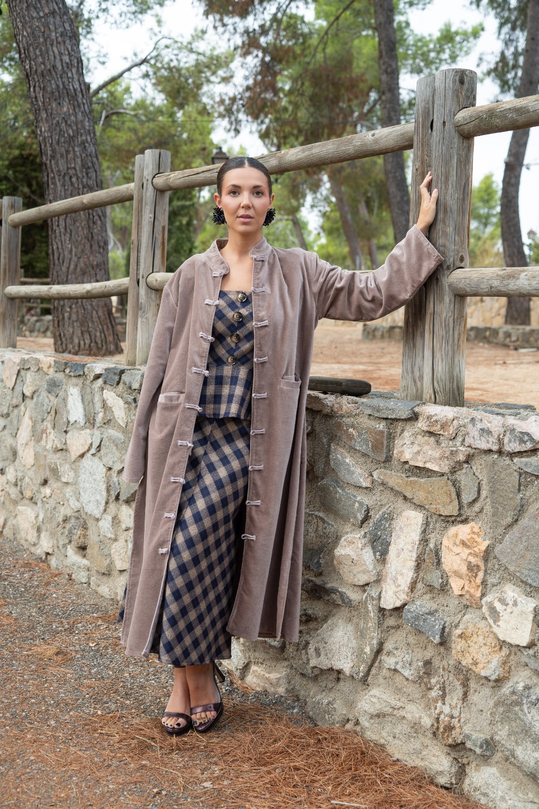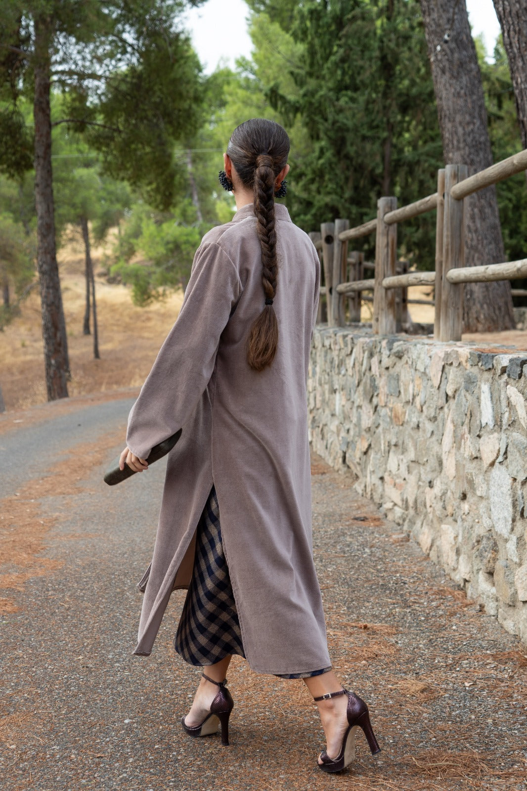 Kaftan recto, aberturas a los lados, manga larga, bolsillos delanteros. En terciopelo color beige.