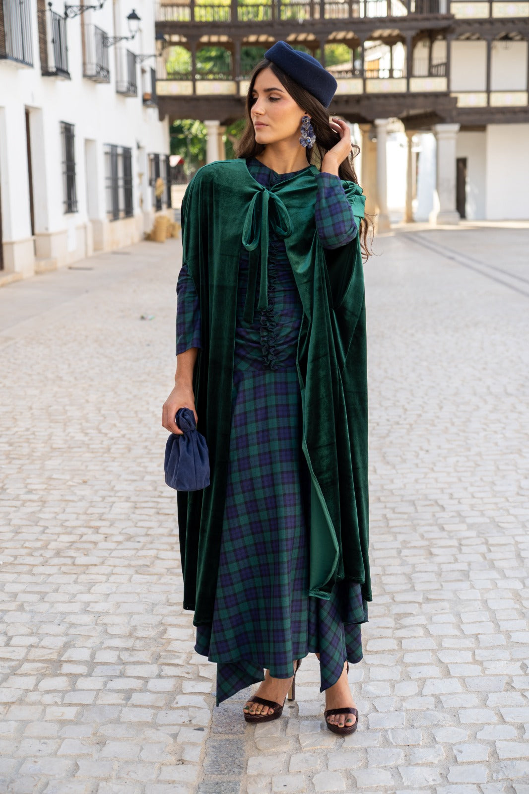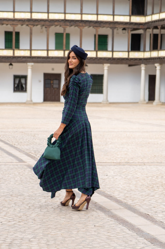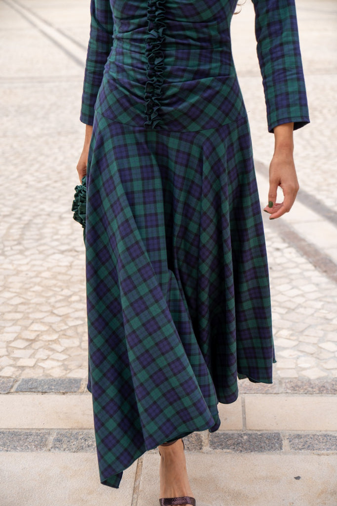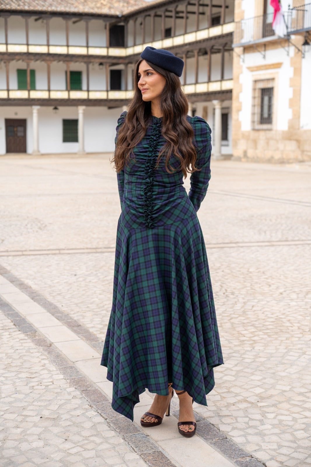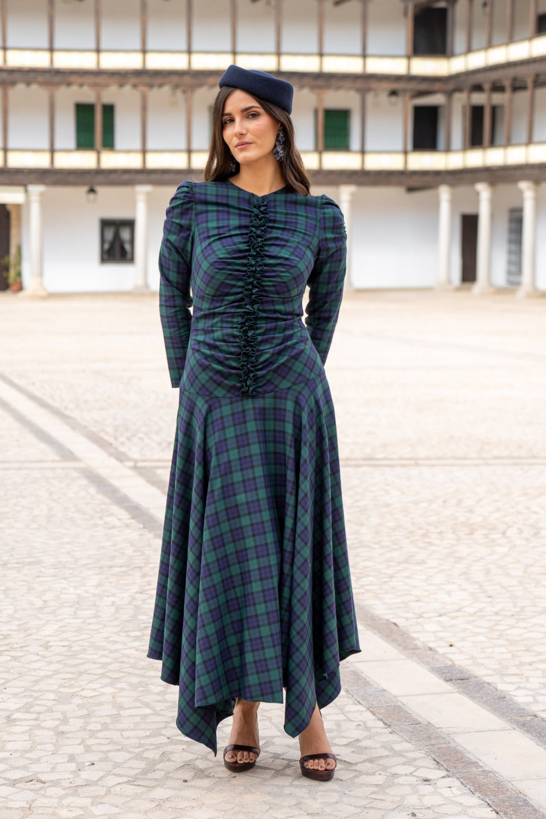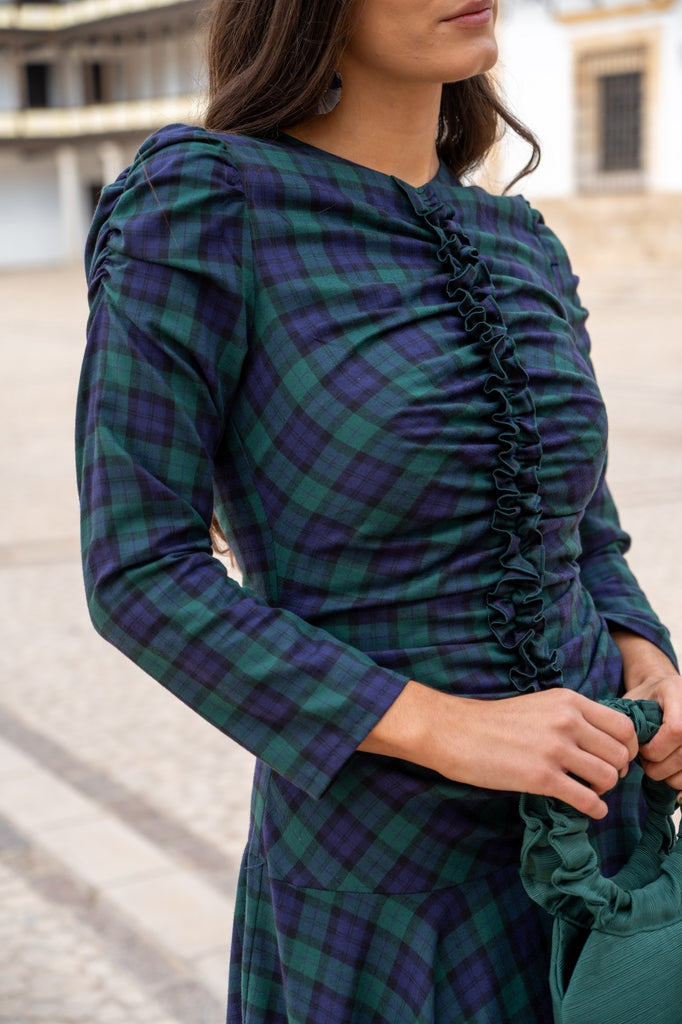 Vestido escote redondo, manga larga abullonada, detalle fruncido delantero, falda a picos. En estampado rombos azul y verde.