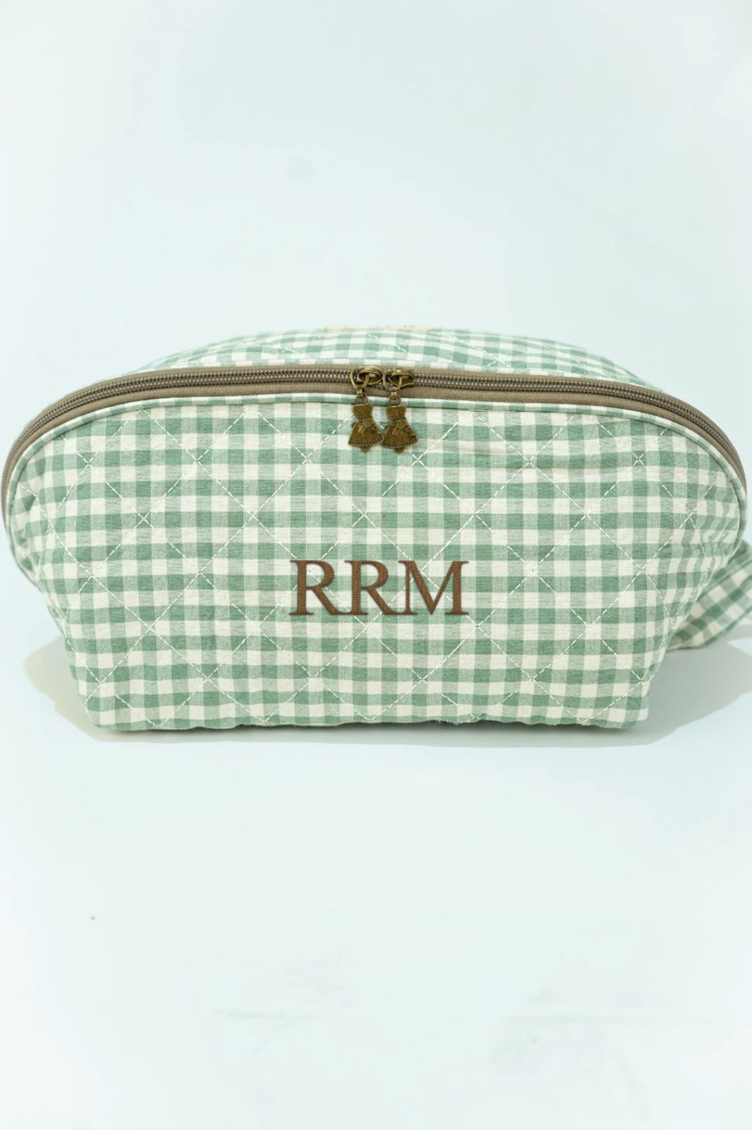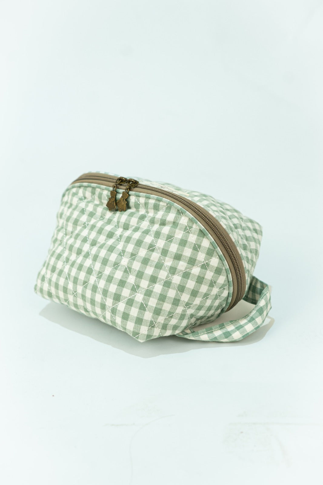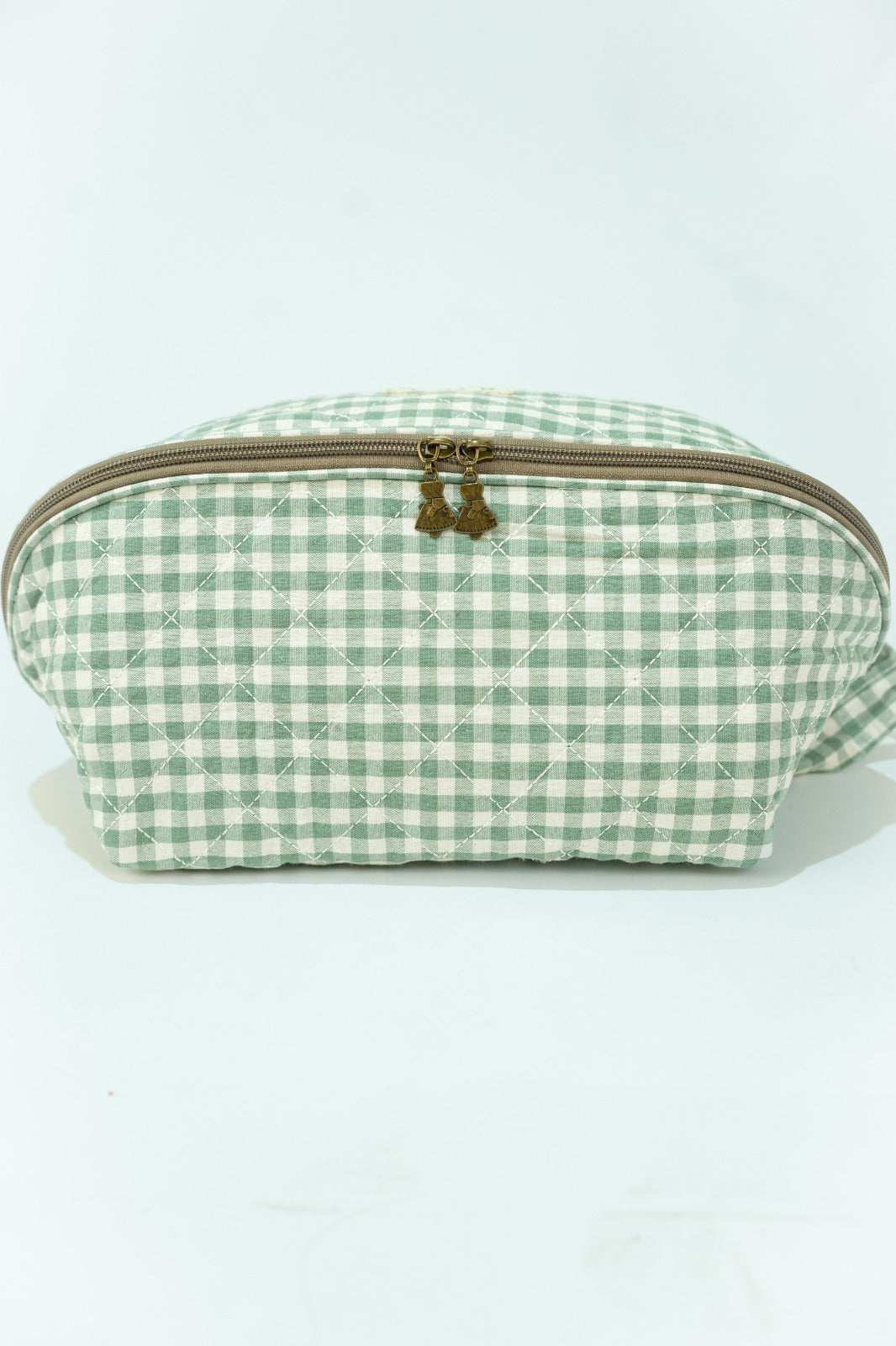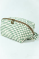 Neceser cierre con cremallera, asa en un lado, bolsillos interiores, en vichy blanco y verde.