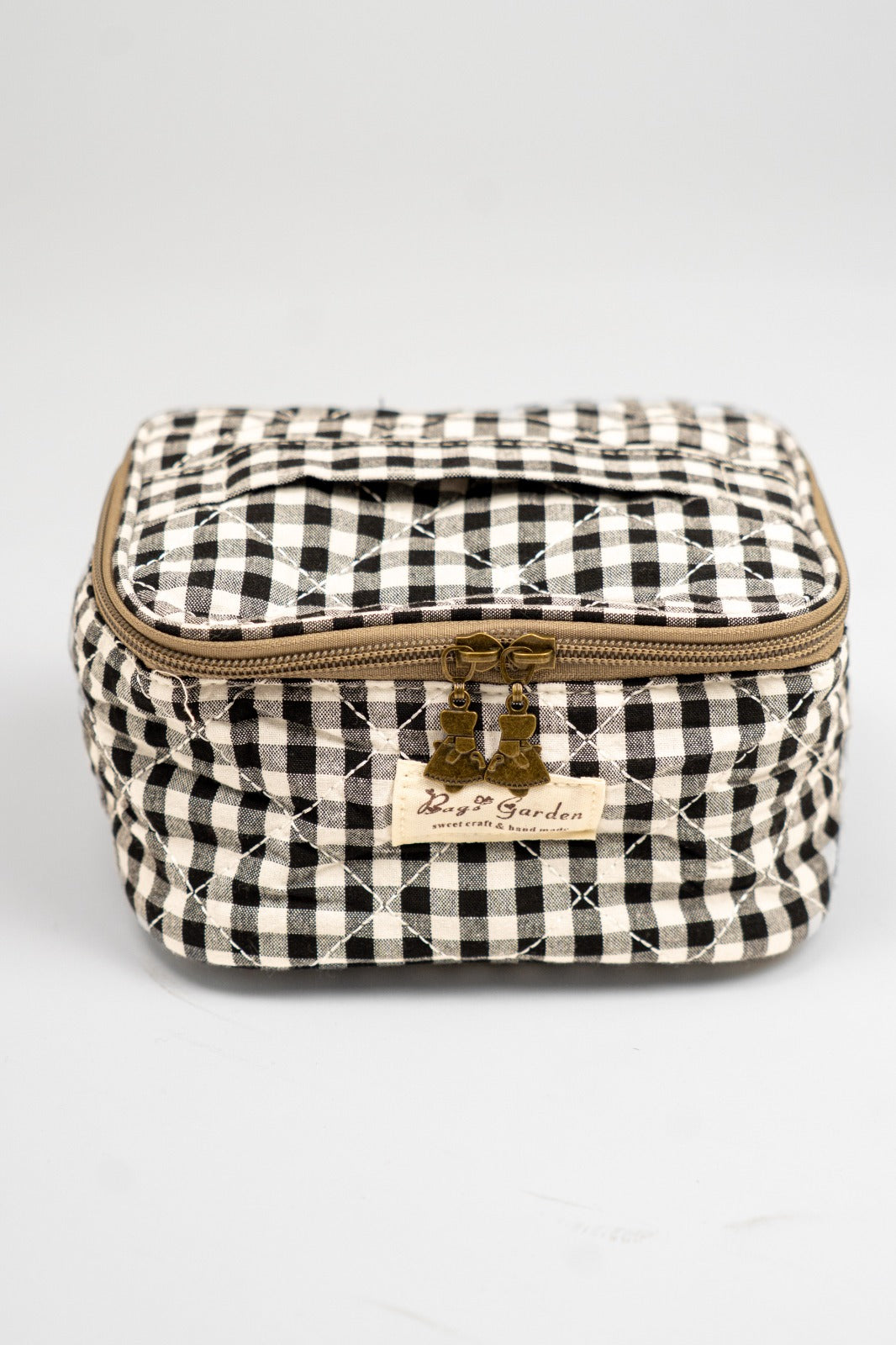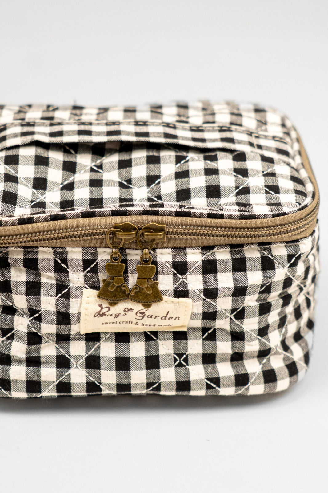 Neceser cierre con cremallera, asa en la parte de arriba, bolsillos interiores, en vichy blanco y negro.
