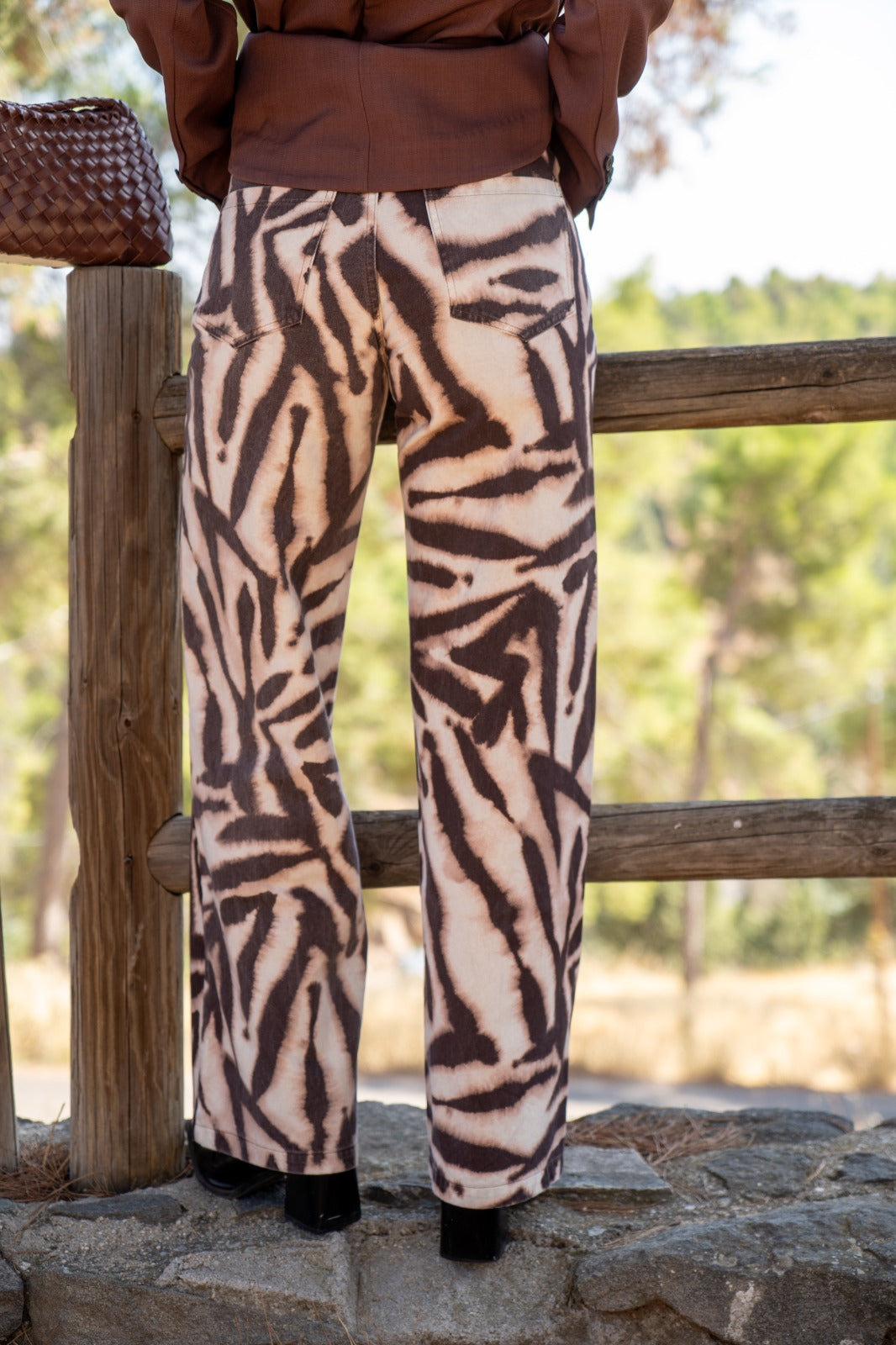Pantalón vaquero tiro alto, bolsillos trasero y bolsillos delanteros, recto. En color beige marrón estampado.