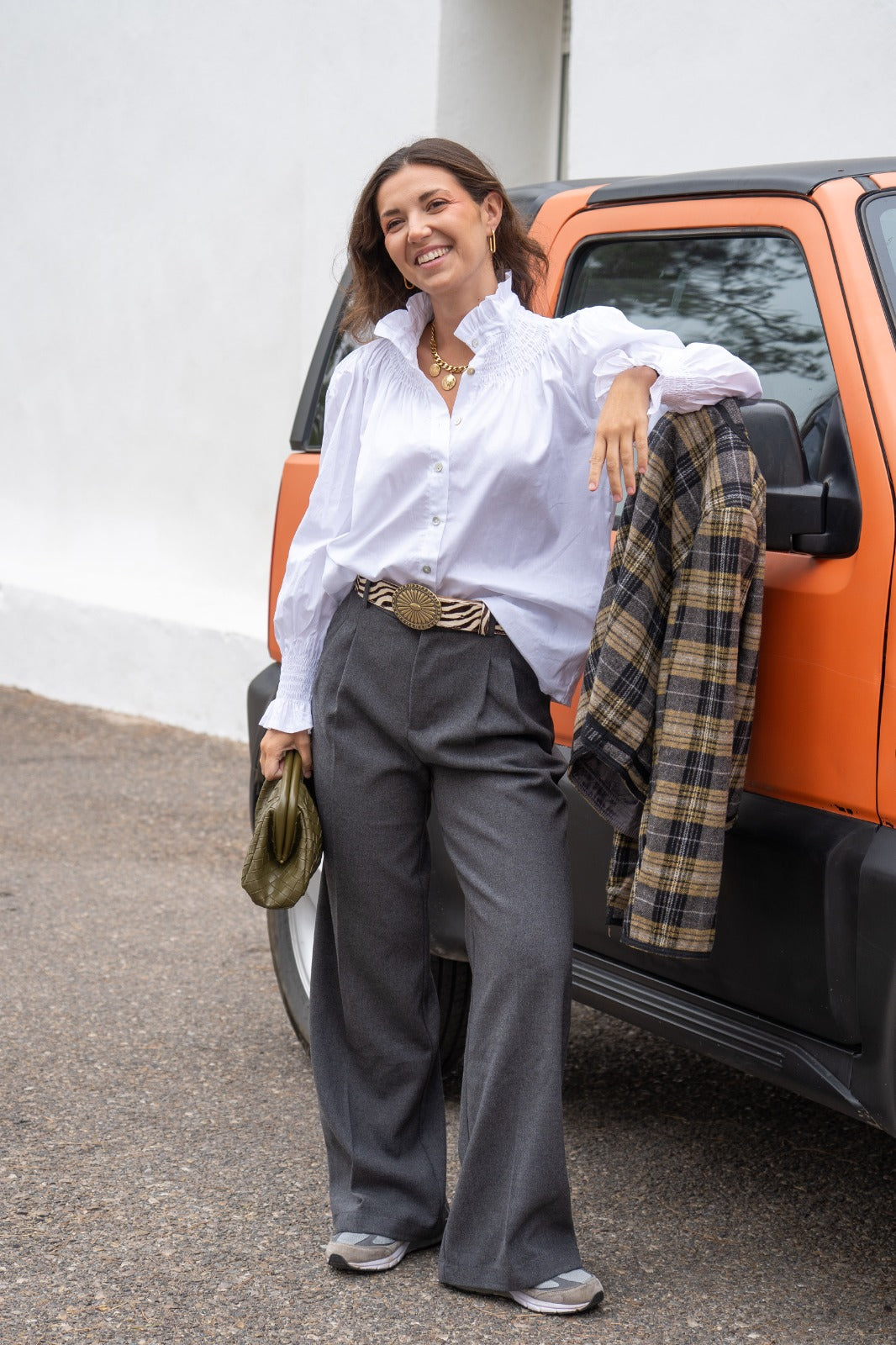 Pantalón tiro alto, pinzas delanteras, bolsillos laterales. En color gris.
