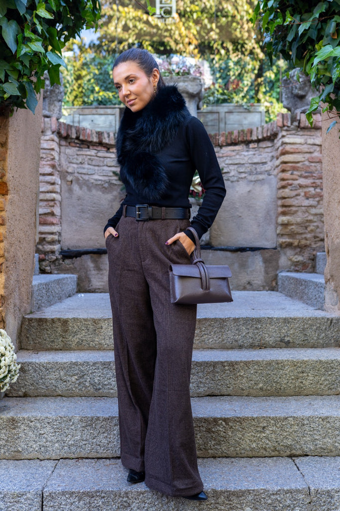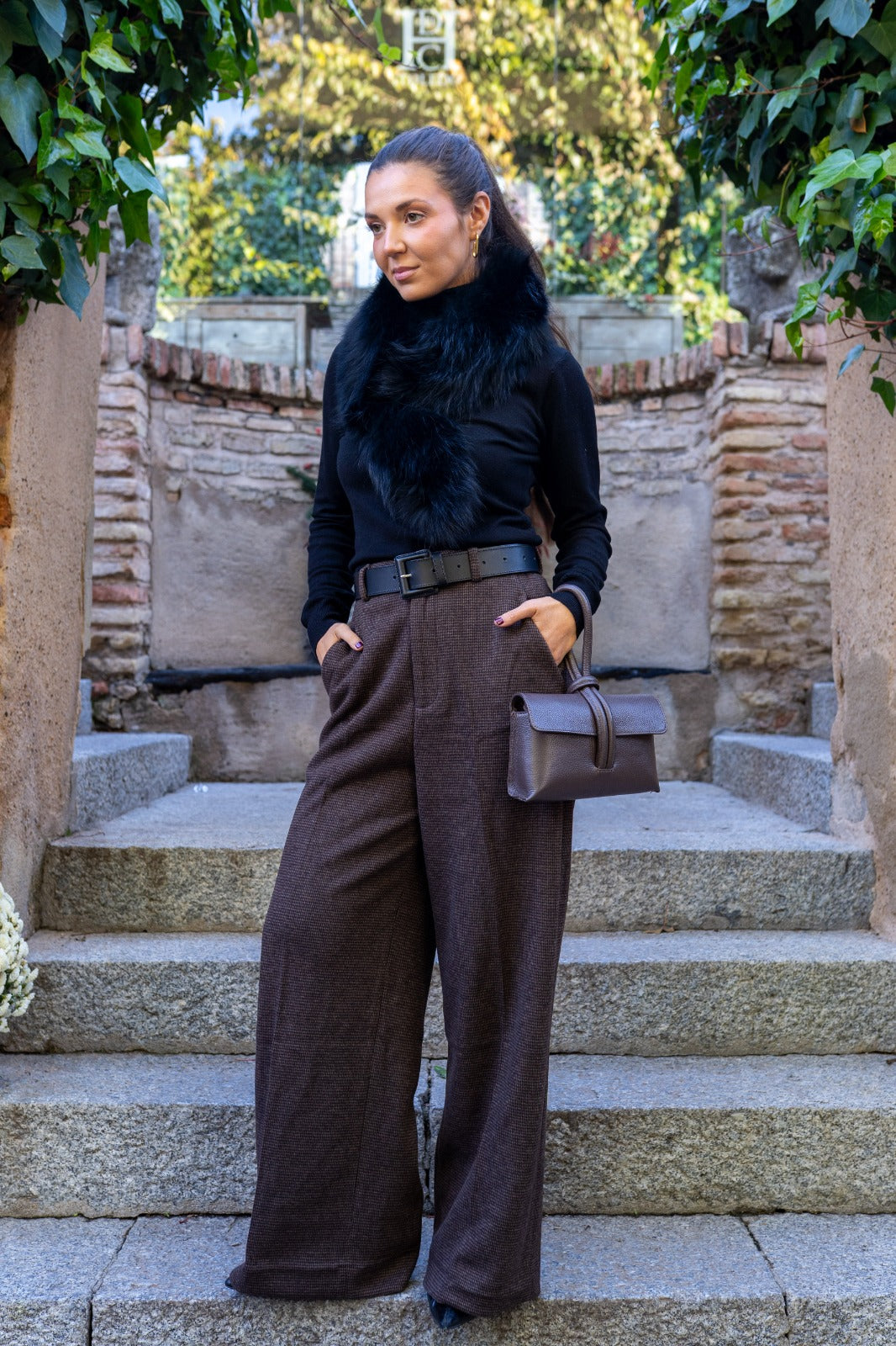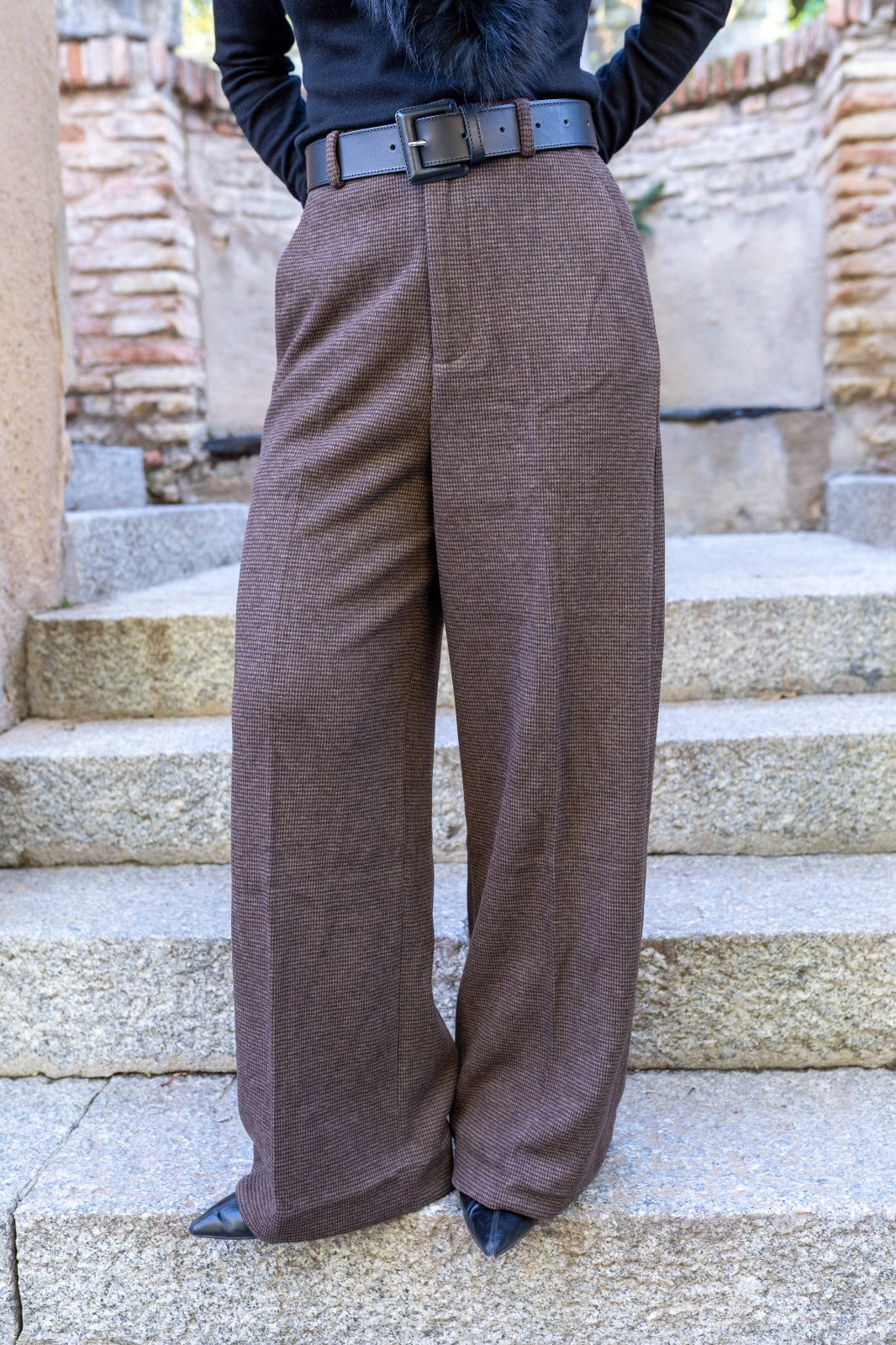 Pantalón en tejido, bolsillos laterales, ancho, en color marrón con pequeños cuadros.