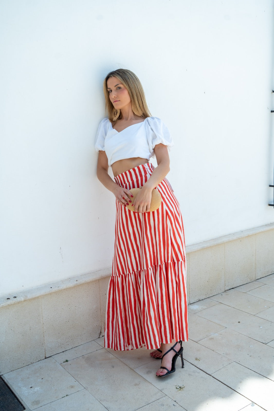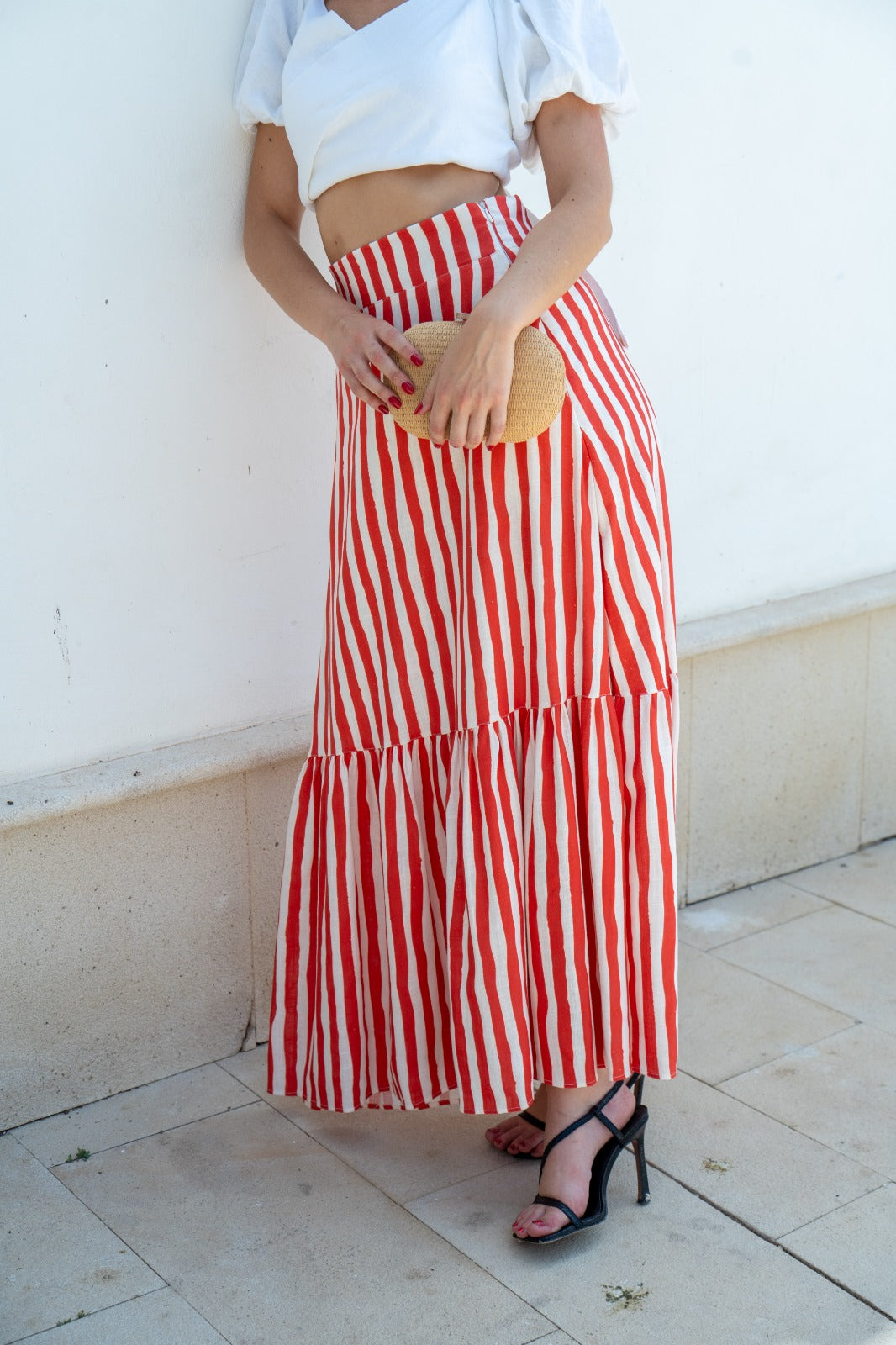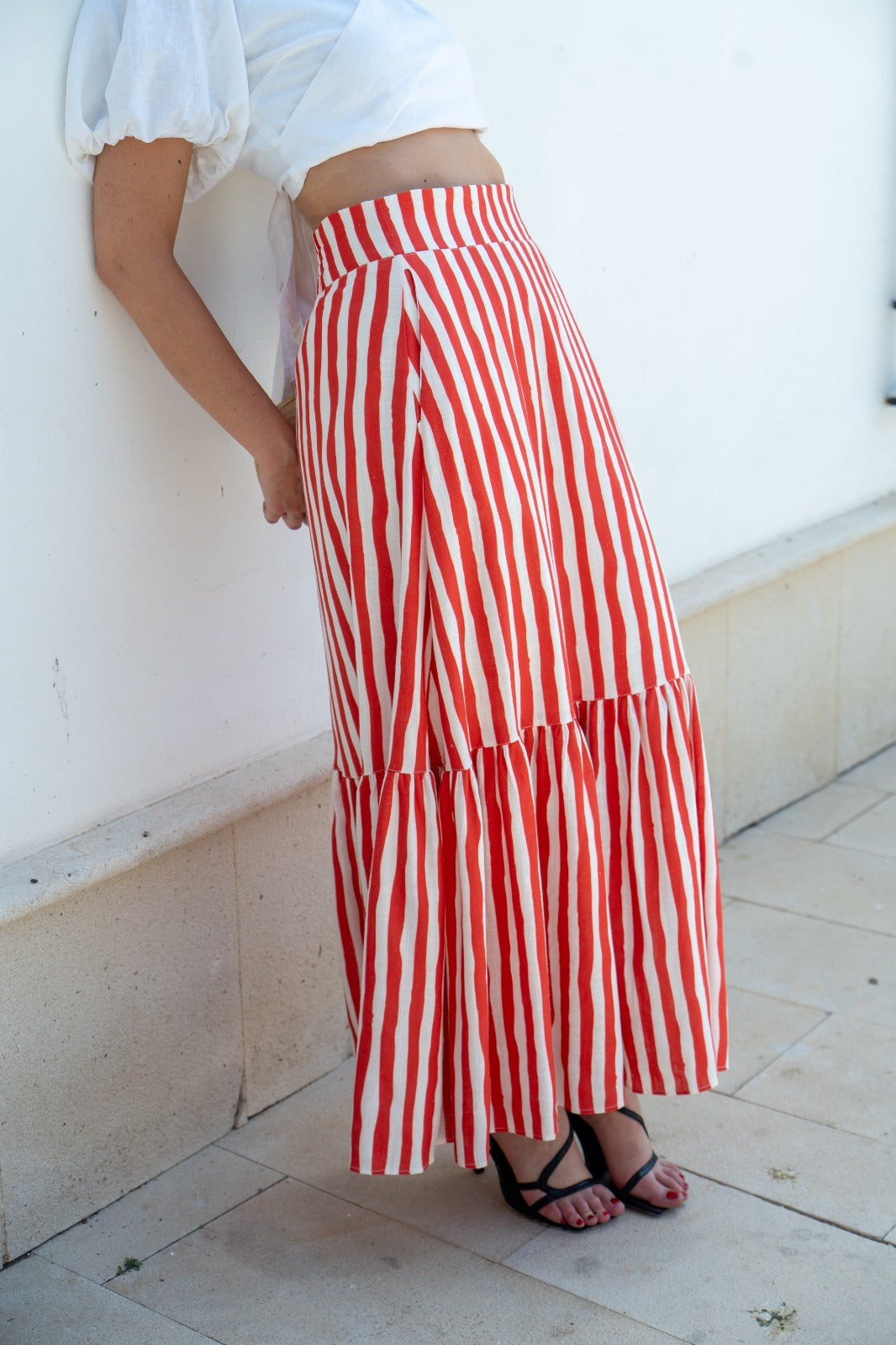 Falda larga, cintura alta, engomada de detras, volante abajo. En rayas blancas y rojas.