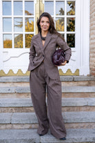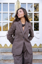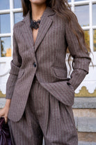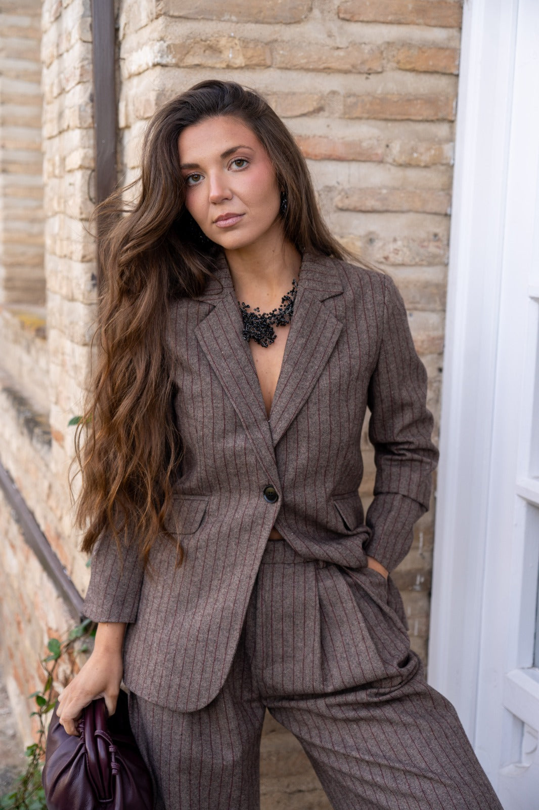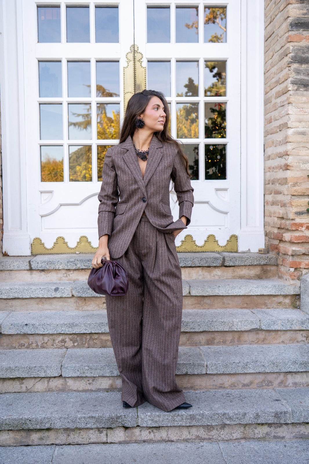 Conjunto compuesto por chaqueta americana manga larga, cierre con botón en el centro, tapetas y pantalón tiro alto, pinzas, bolsillos laterales. En color marrón con raya diplomática burdeos.