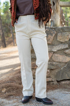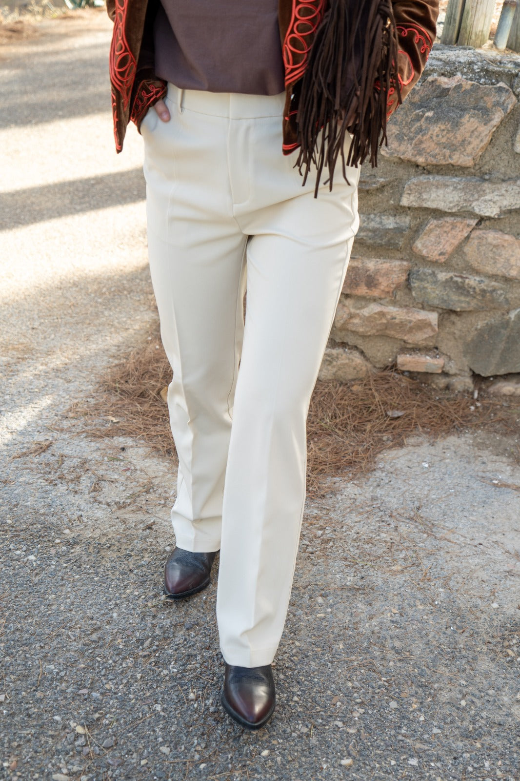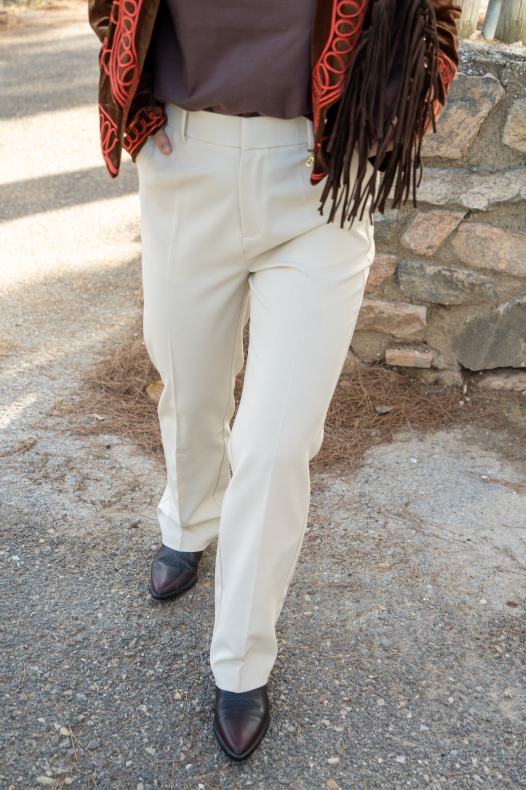 Pantalón tiro alto, bolsillos laterales, ancho. En color beige.