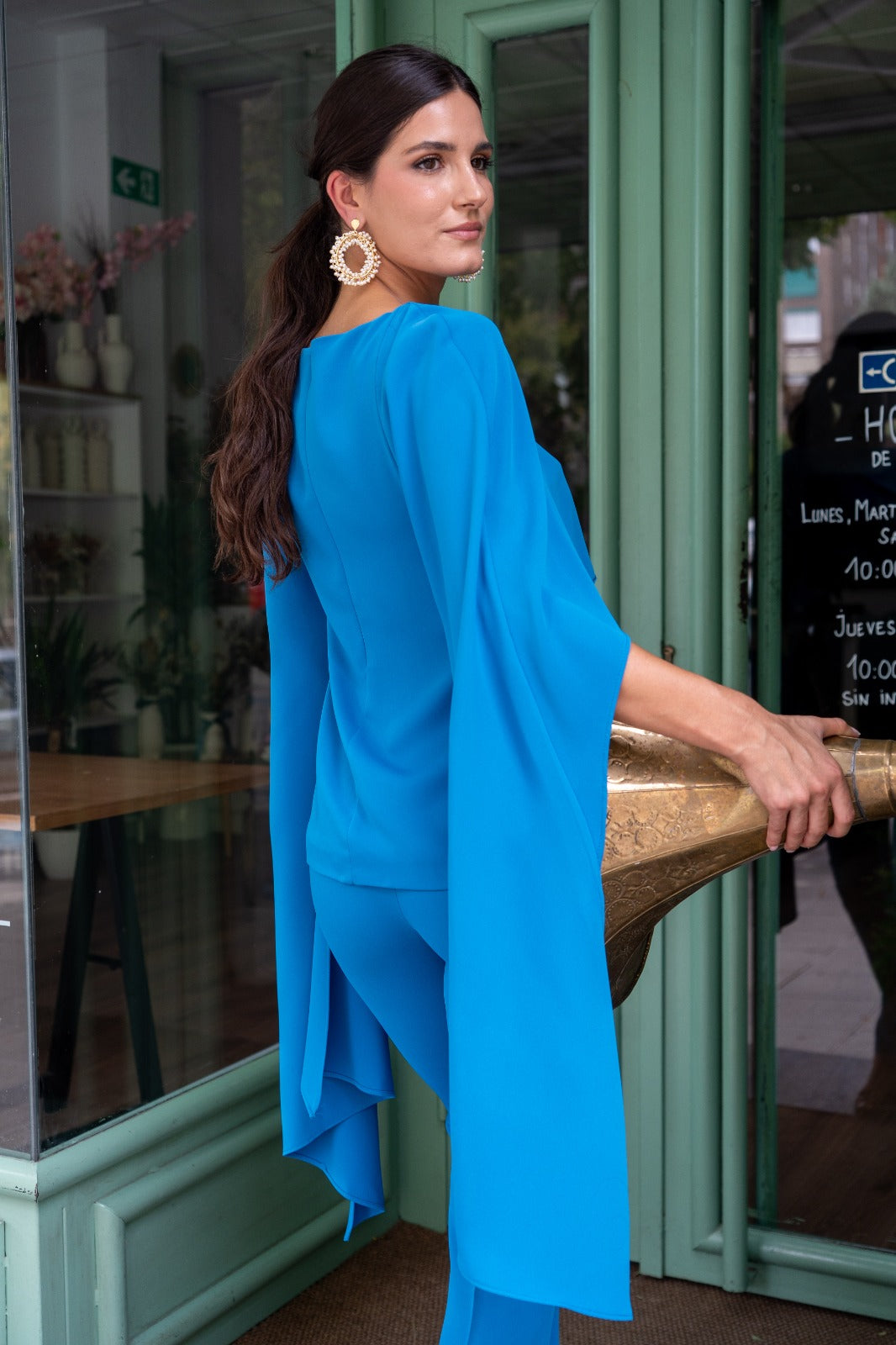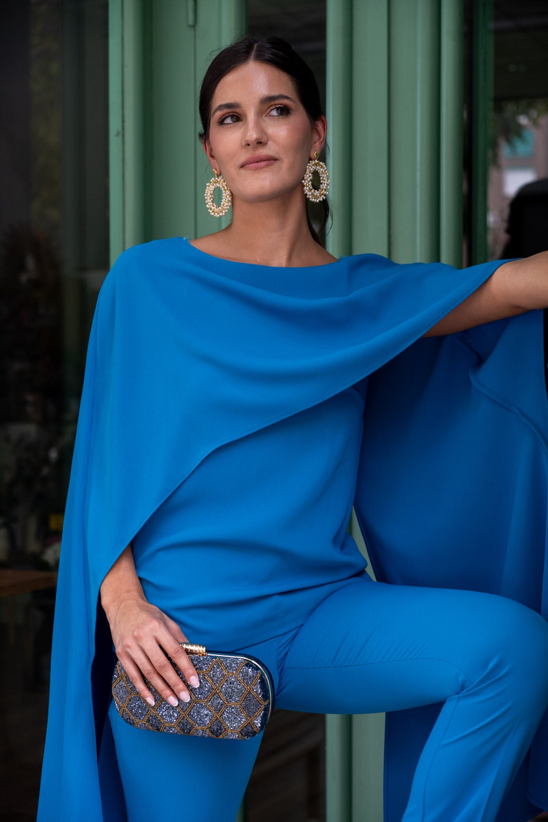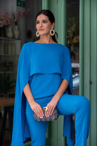 Conjunto compuesto por top en hombrera ancha, con capa por encima y pantalón tiro alto, cremallera, estrecho. En color azul.