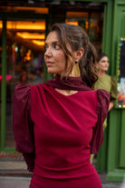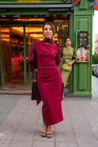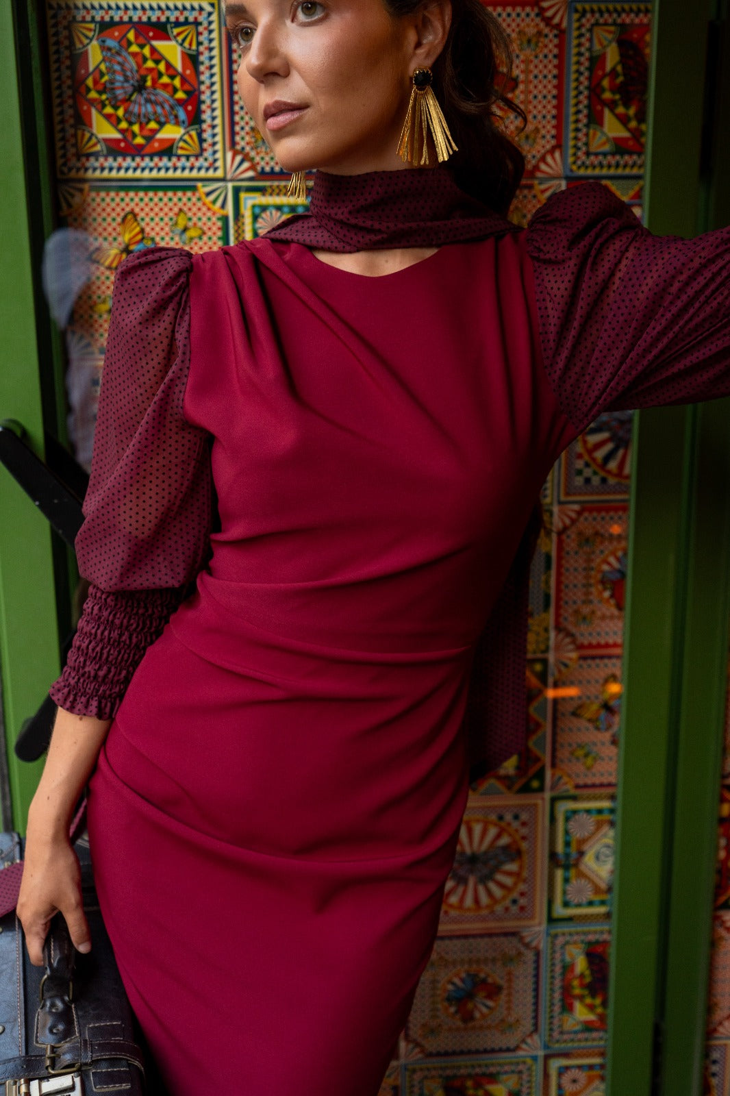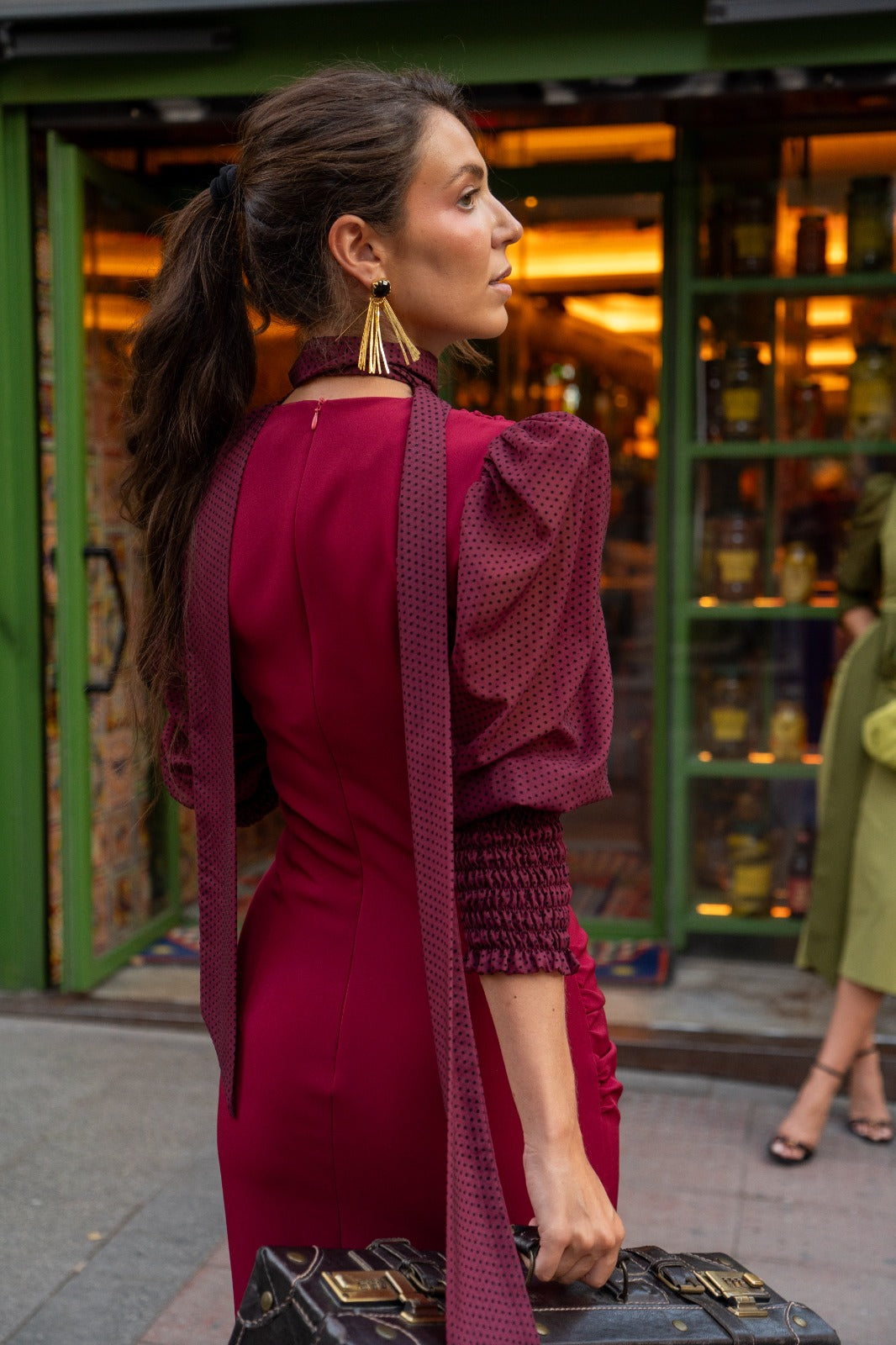 Vestido midi, escote redondo, manga larga en plumeti con topitos negros, puño enngomado, abertura trasera, cinturon incluido. En color burdeos.