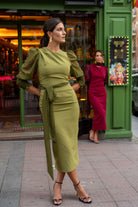 Vestido midi, escote redondo, manga larga en plumeti con topitos negros, puño engomado, abertura trasera, cinturon incluido. En color verde.