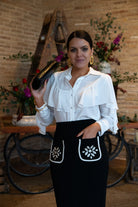 Blusa manga larga con puño, abotonada, volante en la parte delantera y mangas. En color blanco.