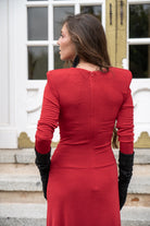 Vestido de punto con manga larga, cuerpo drapeado dejando el escote asimétrico, falda de capa. En color rojo.