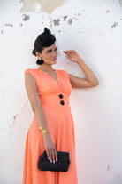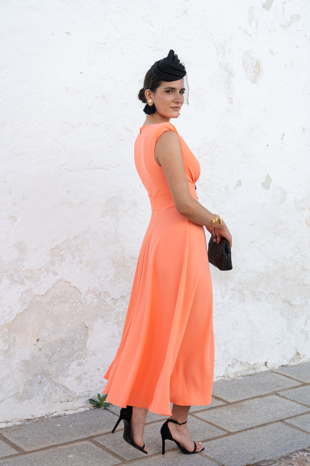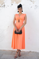 Vestido midi, escote a pico, sin mangas, hombrera alta, corte en cintura con detalla botones, vuelo abajo. En color naranja.
