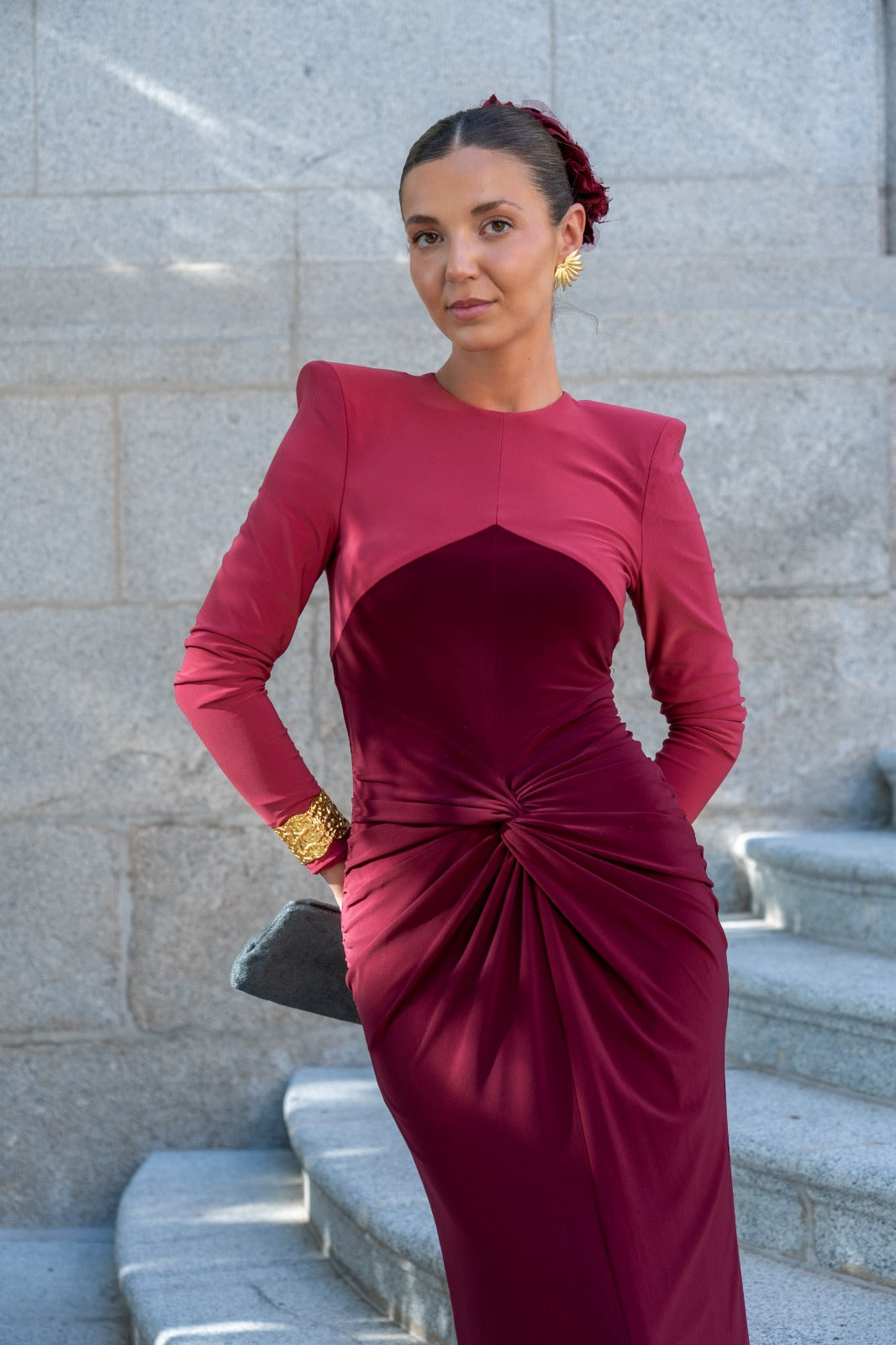 Vestido midi, escote redondo, hombros marcados, manga larga, nudo en cintura. En punto bicolor rosa y burdeos.