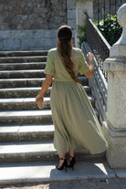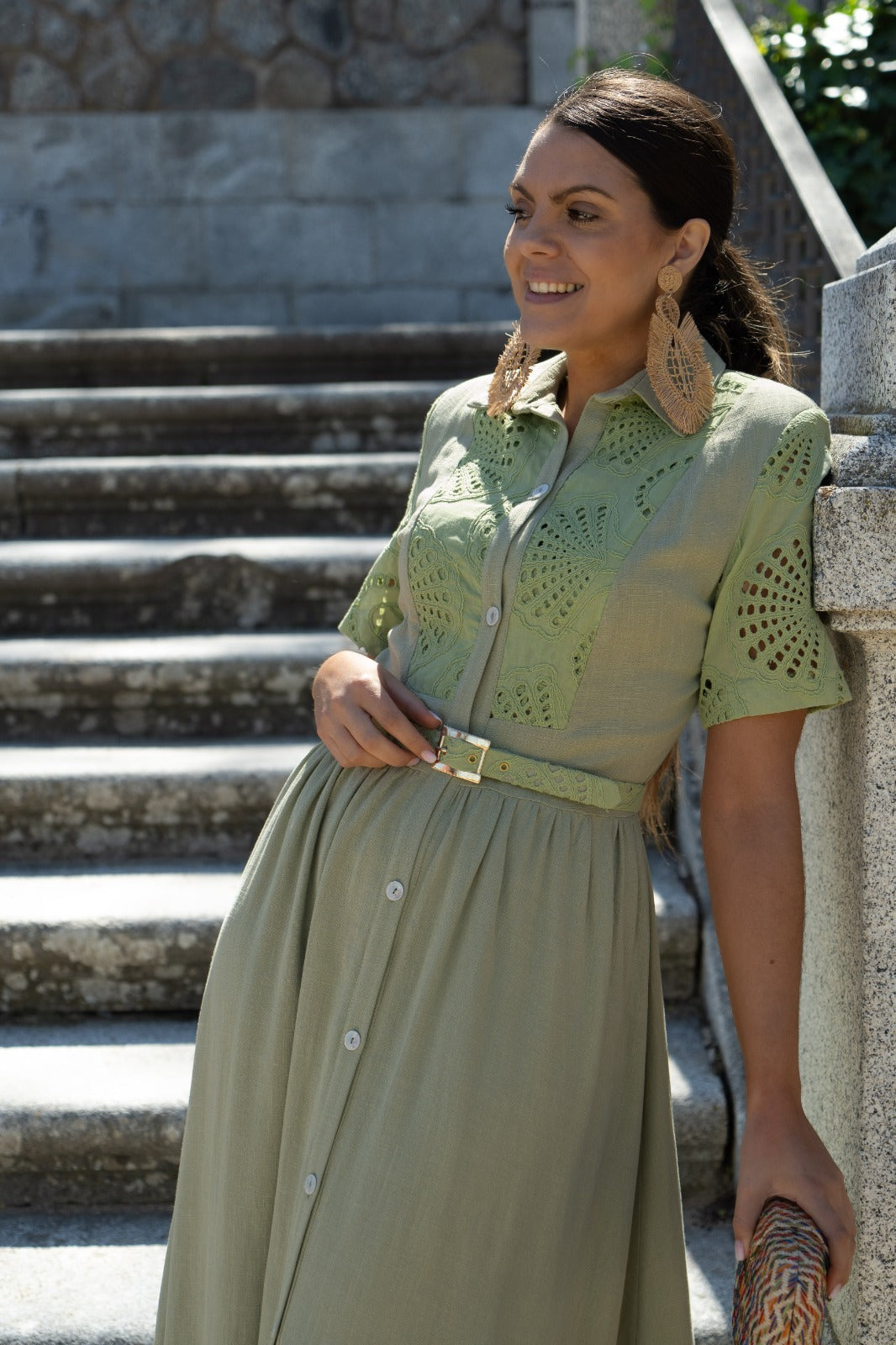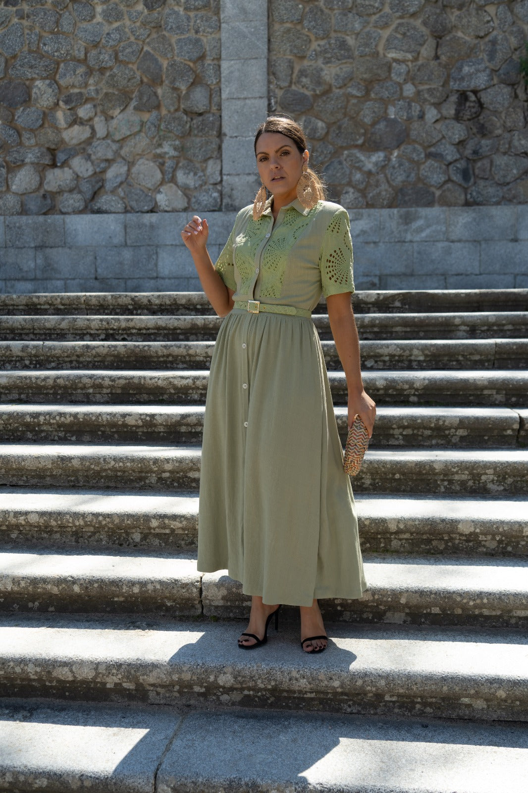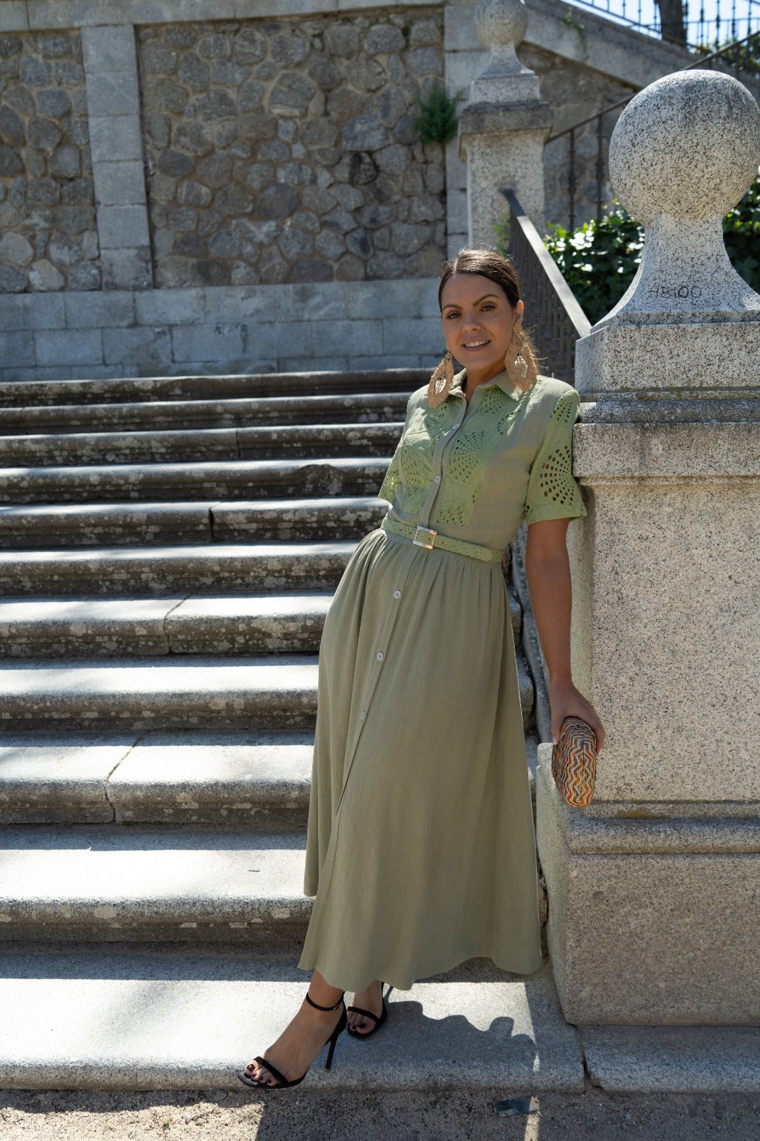 Vestido midi, escote cuello camisero, manga corta con detalles calados, abotonado, cinturon para ajustar en cintura. En color verde.